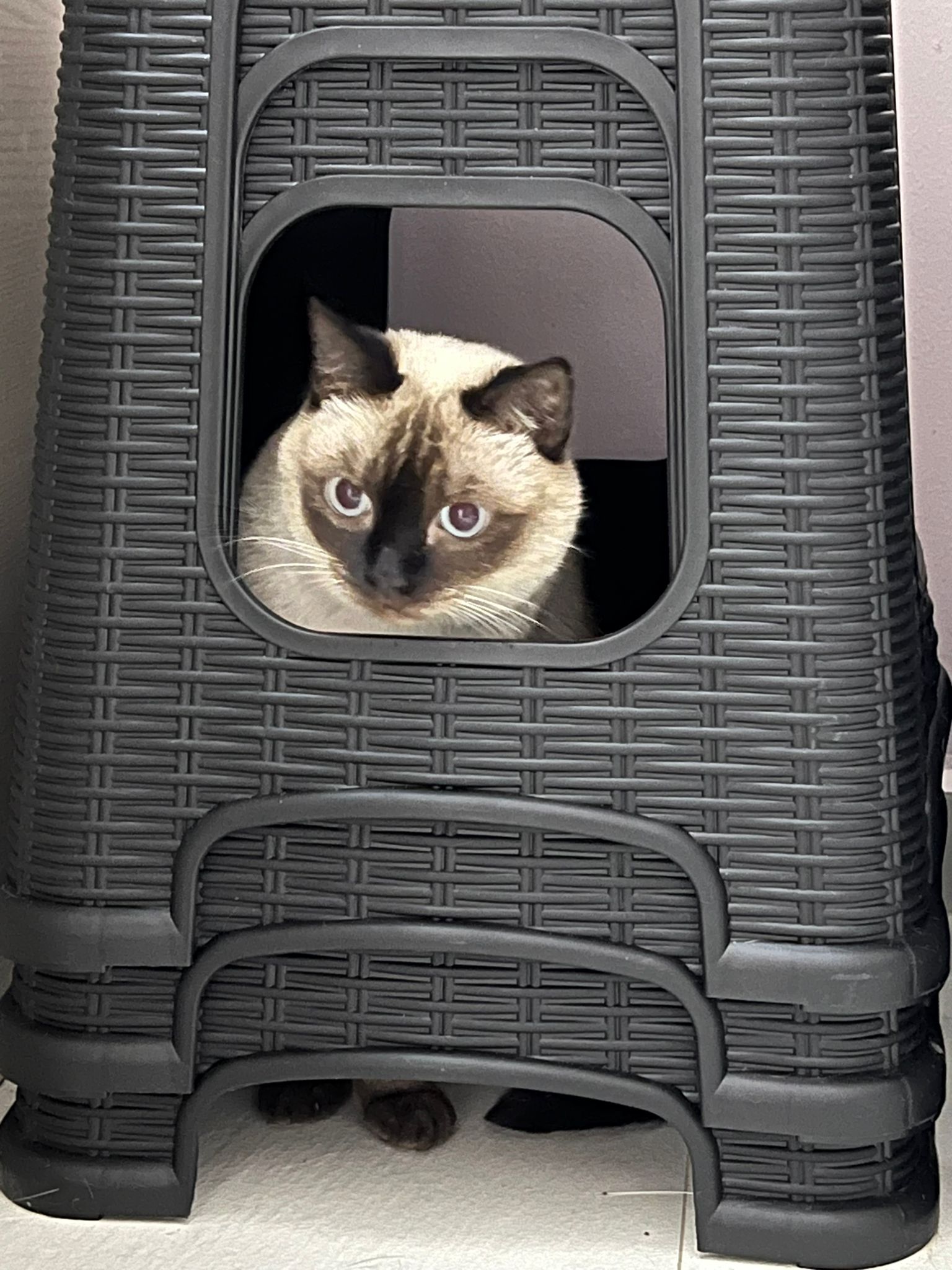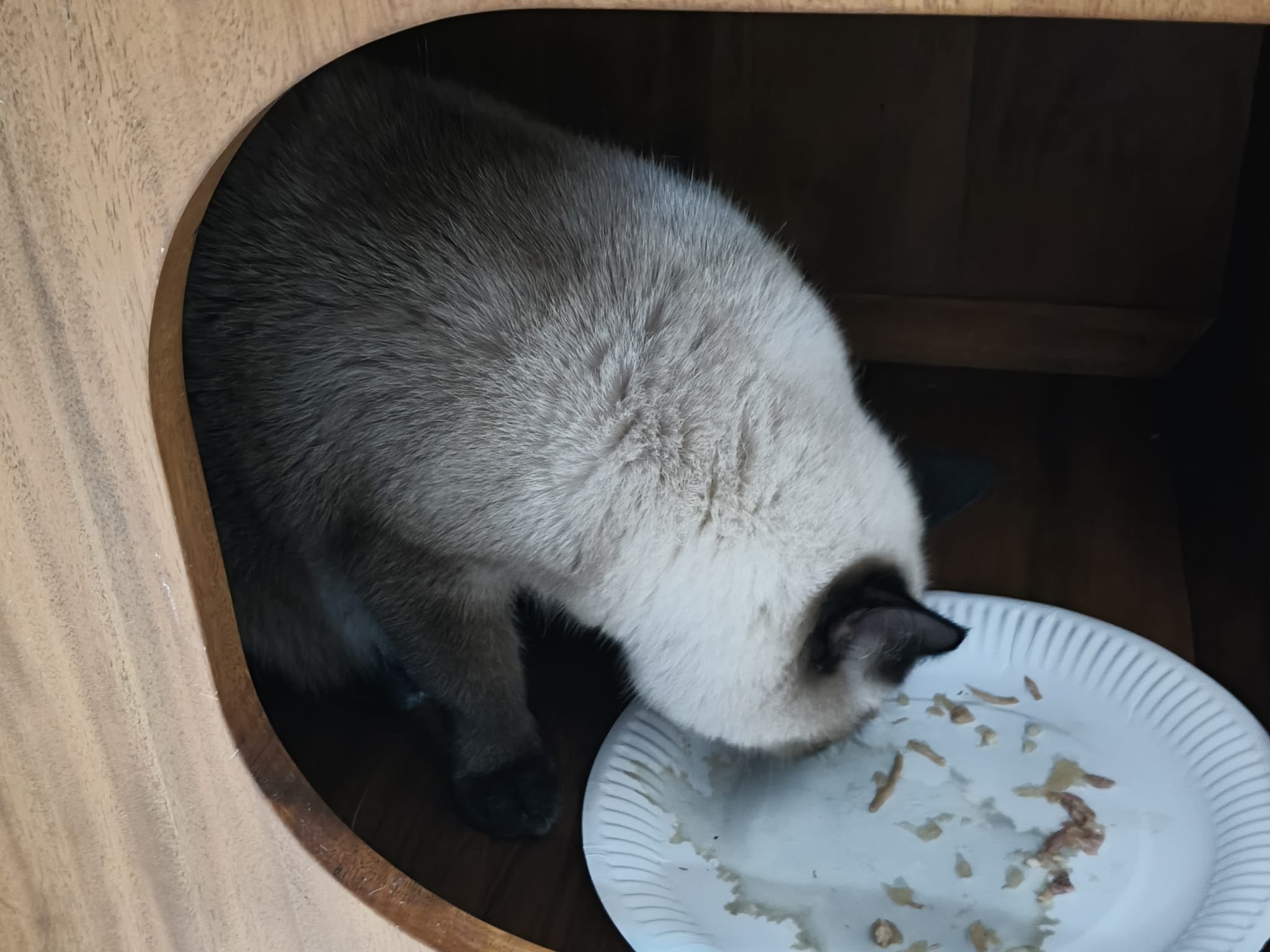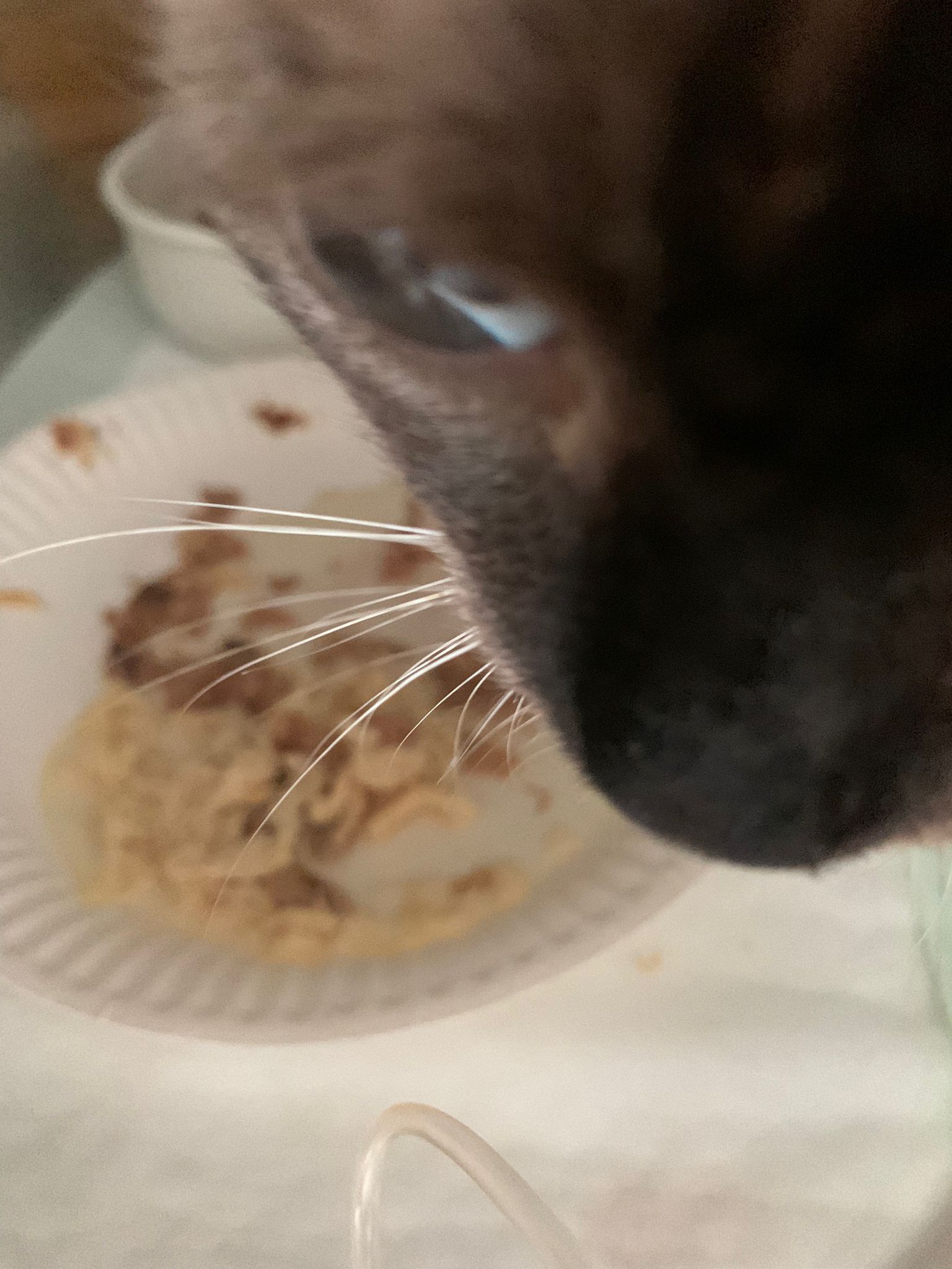 • night: she didn’t touch all the food – either not her taste or she just want to continue standing n resting in TOP of the cat tree trying to think how to get out of the room