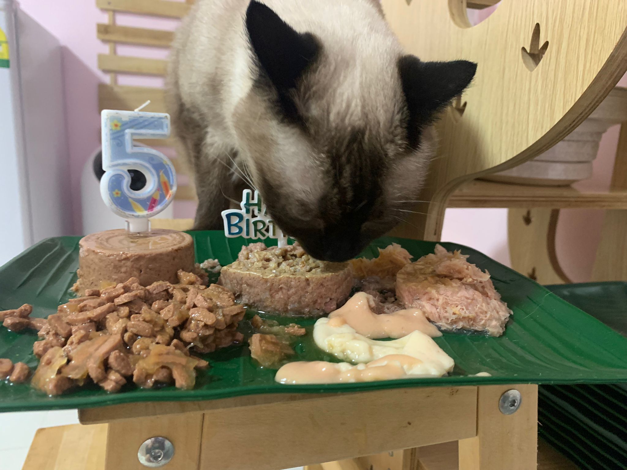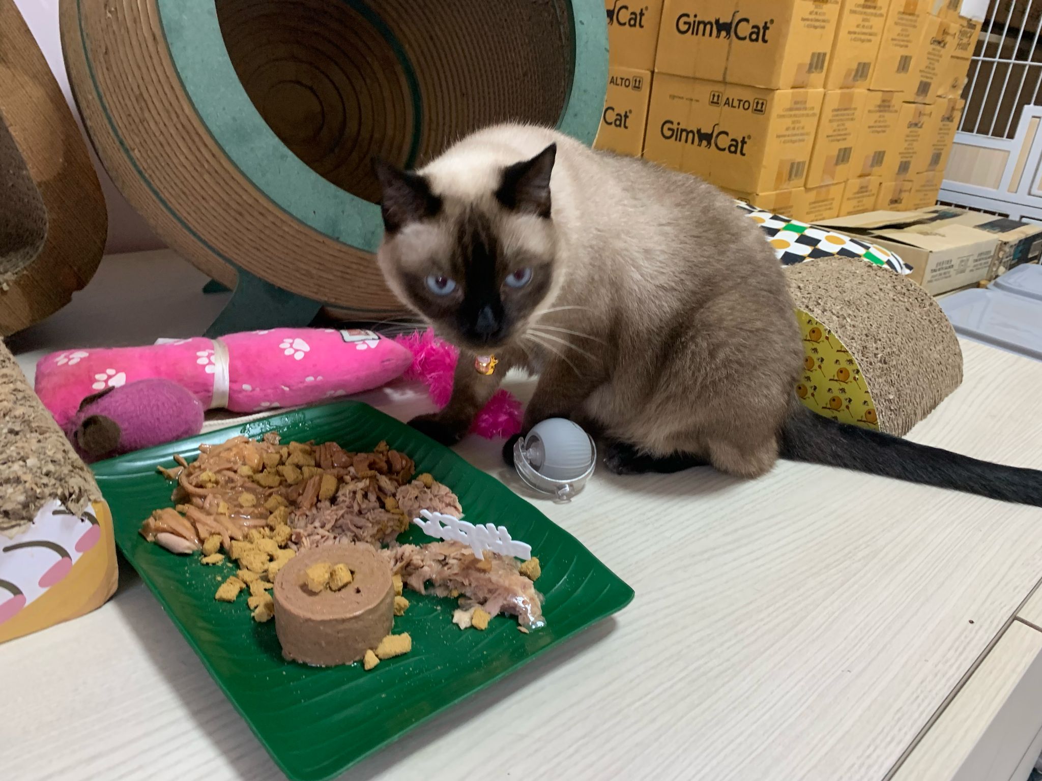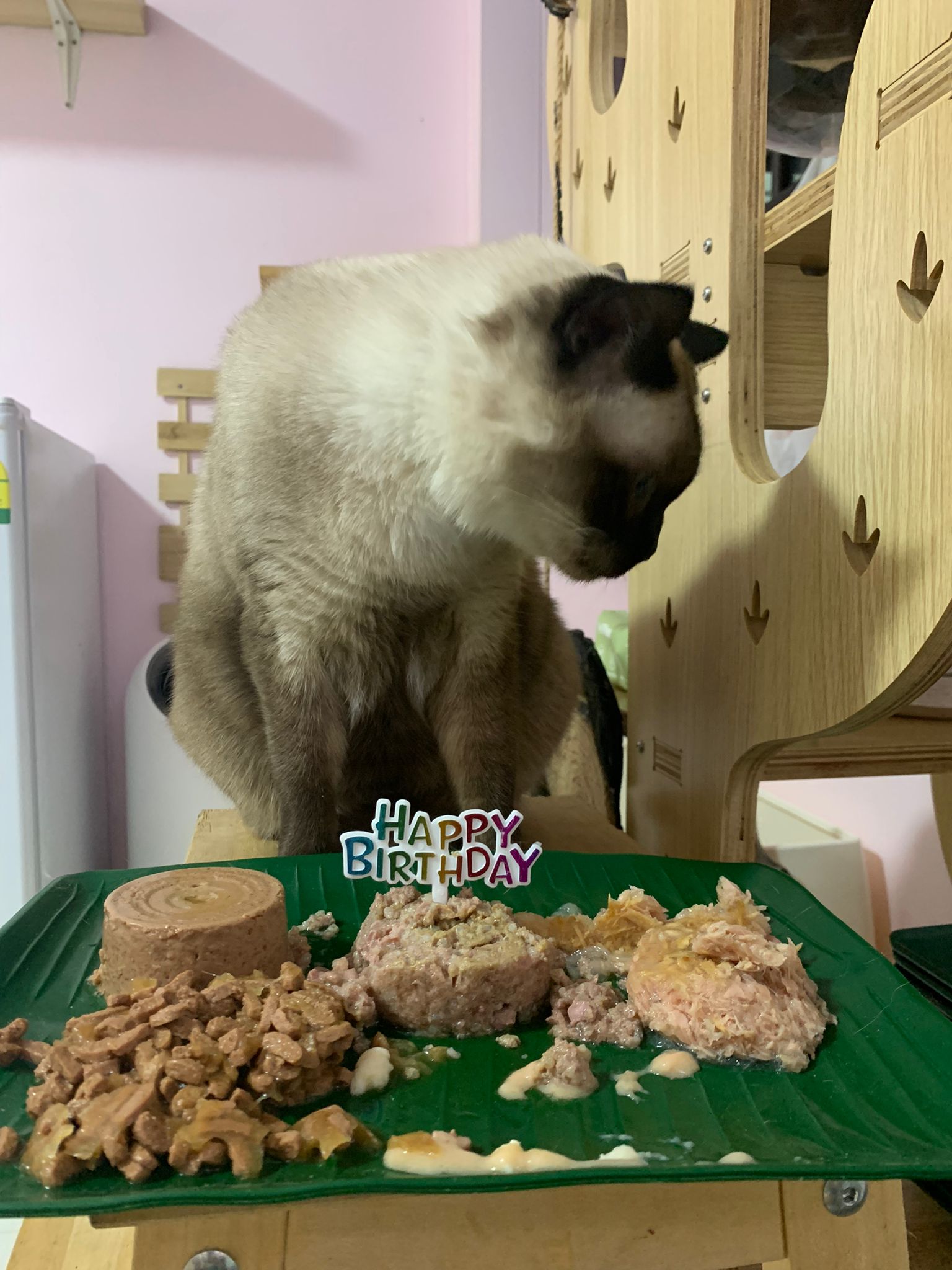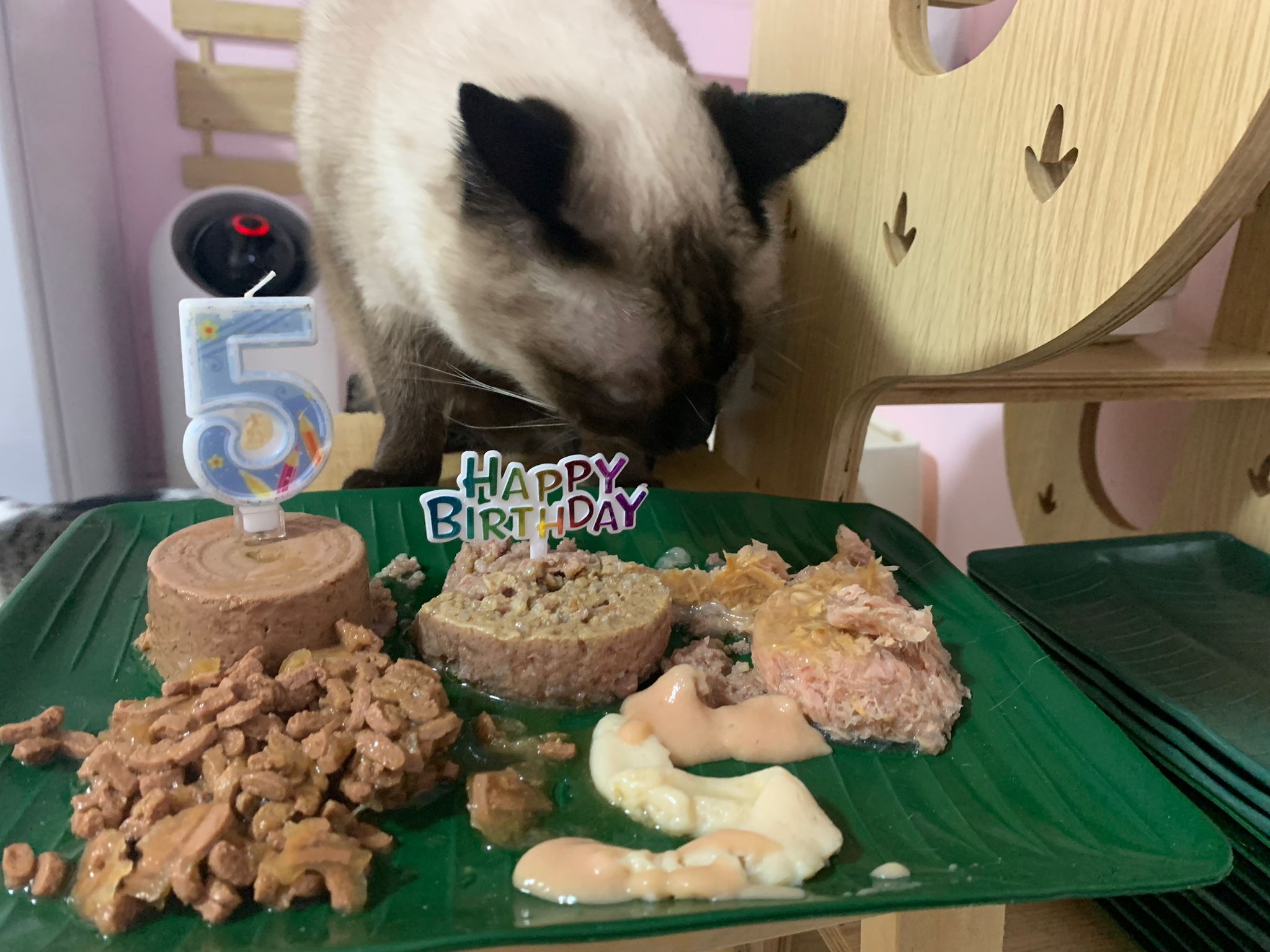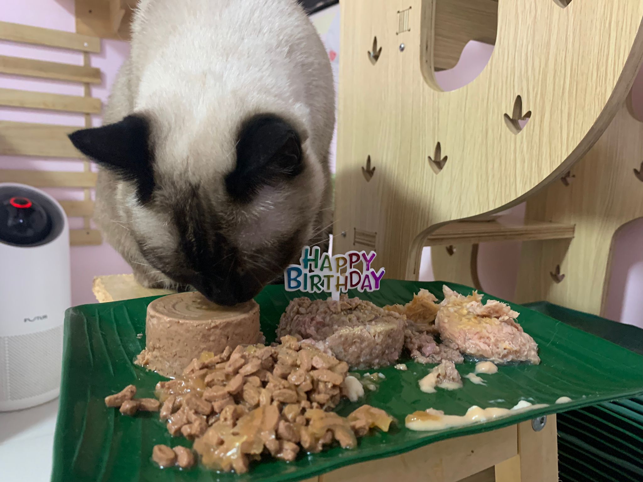 Prep her bday plate n manja n rena alr corner me for food. Carry her to fridge to eat first. She attack ciao cup and move away, not that keen on food so I let her start her cat nip party.
