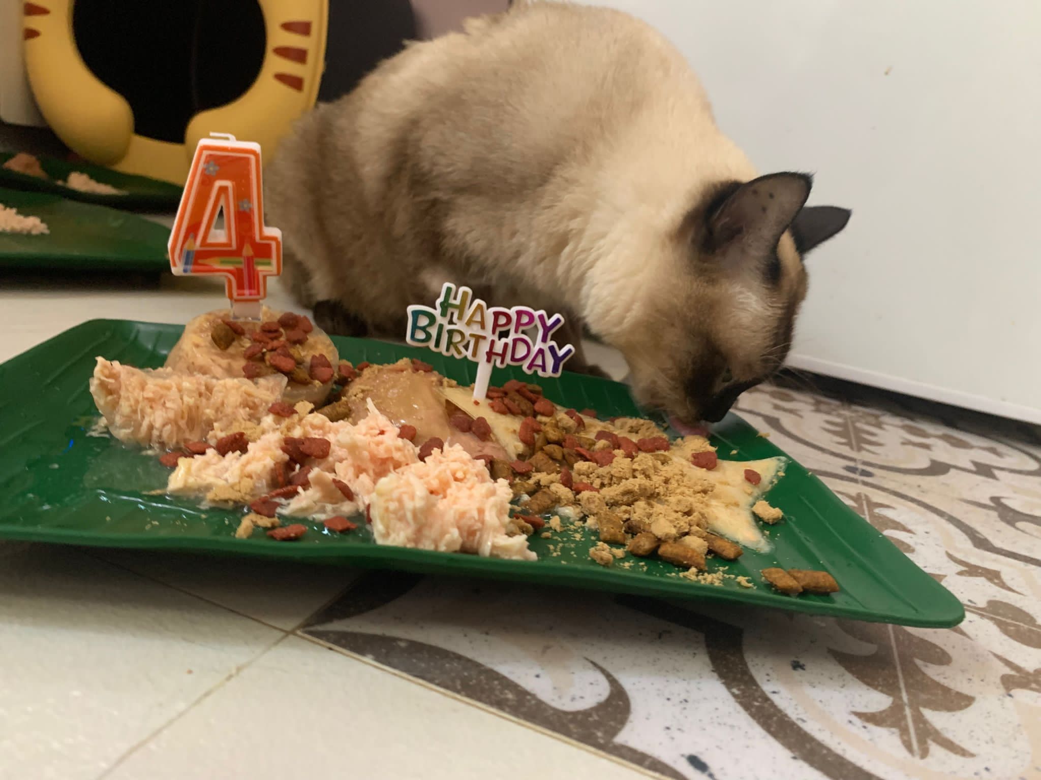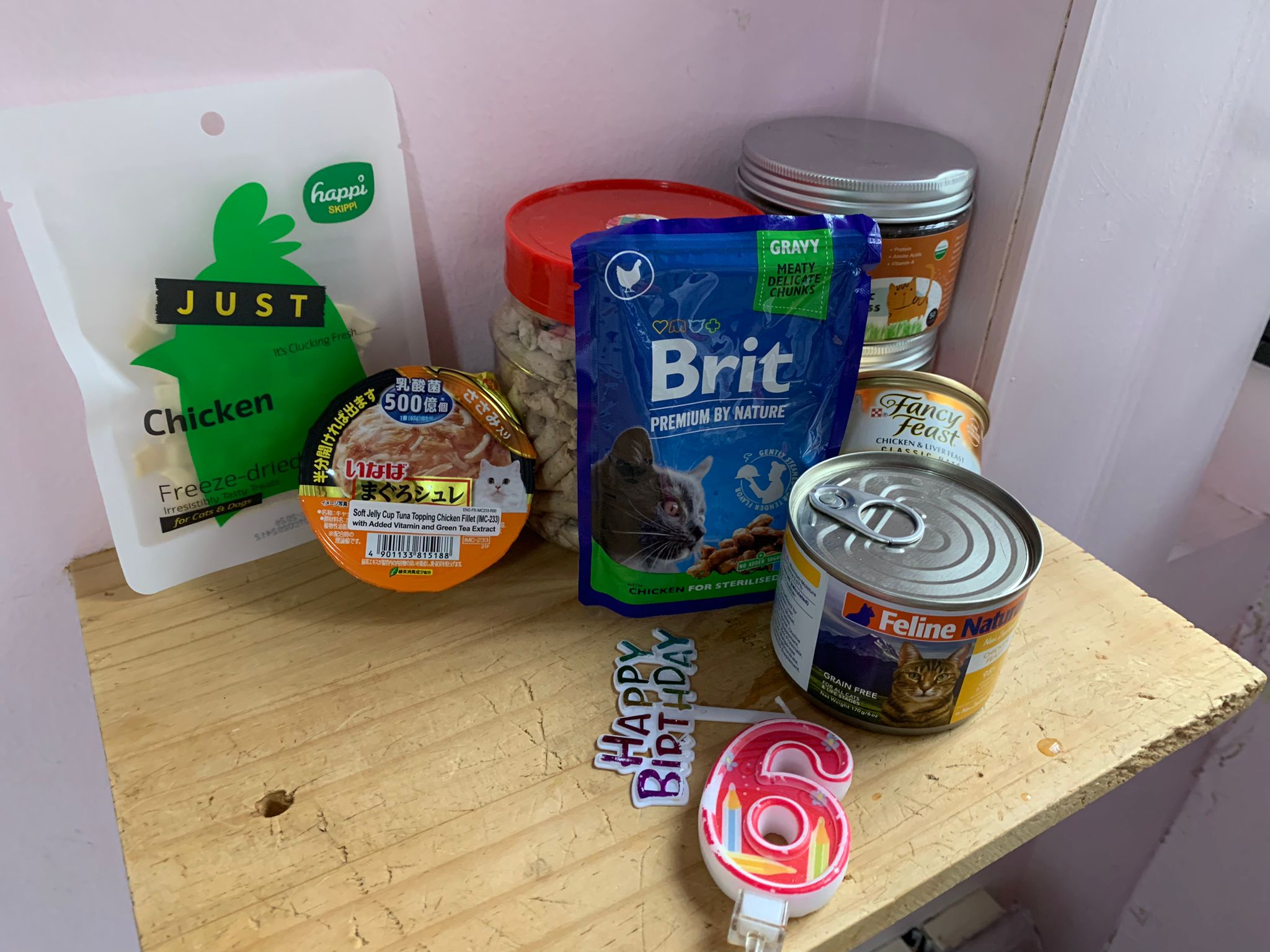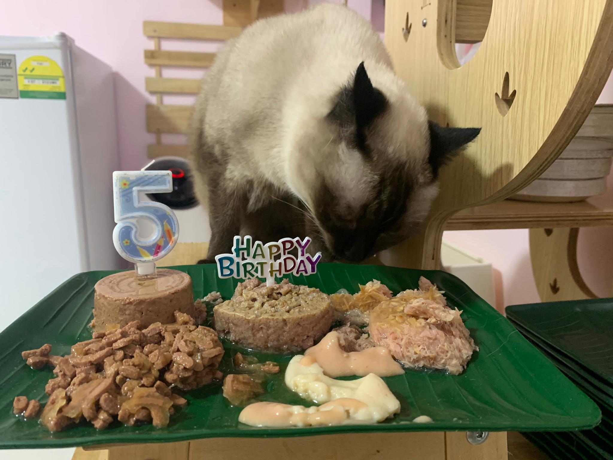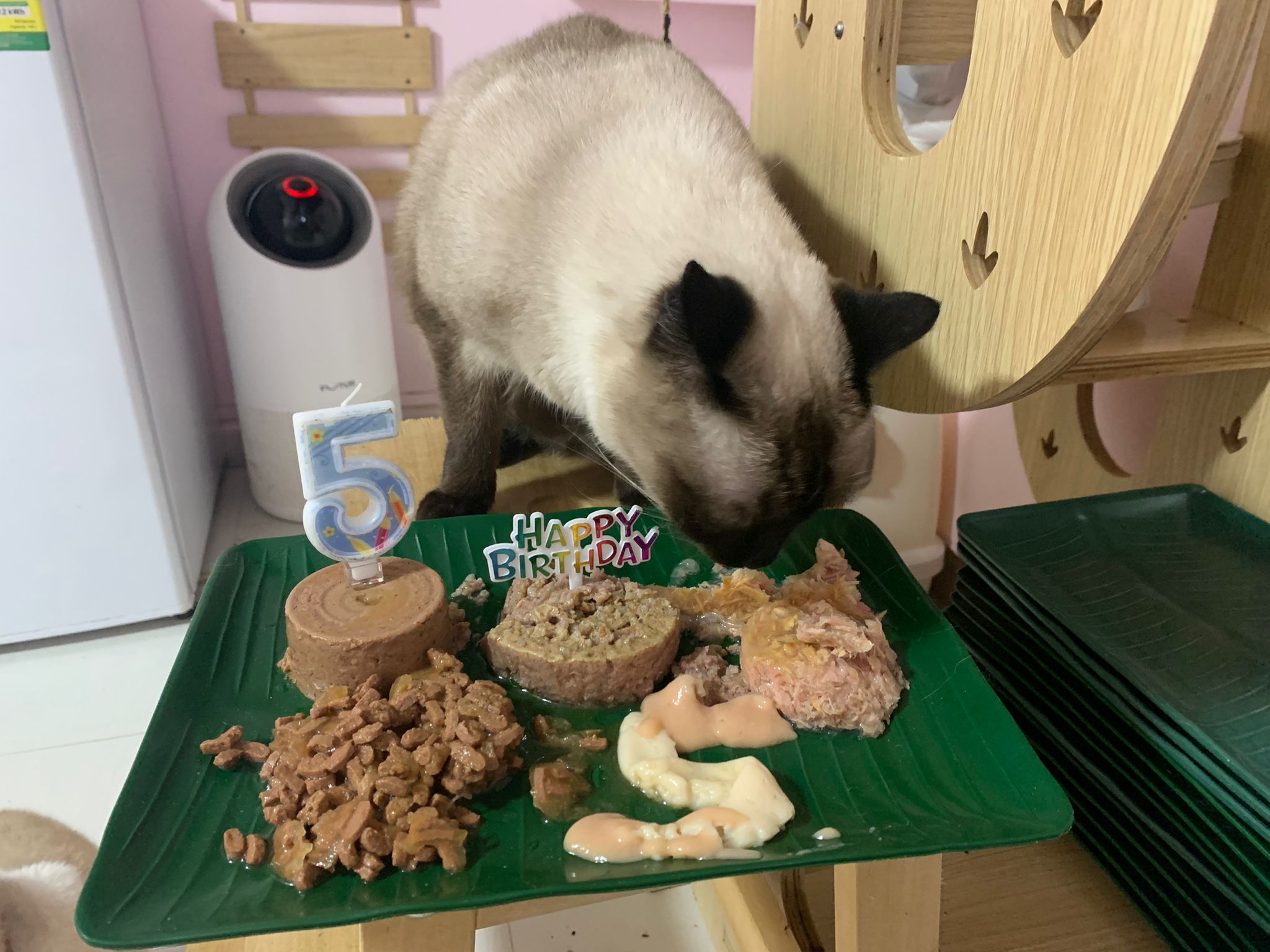 Prep her bday plate n manja n rena alr corner me for food. Carry her to fridge to eat first. She attack ciao cup and move away, not that keen on food so I let her start her cat nip party.