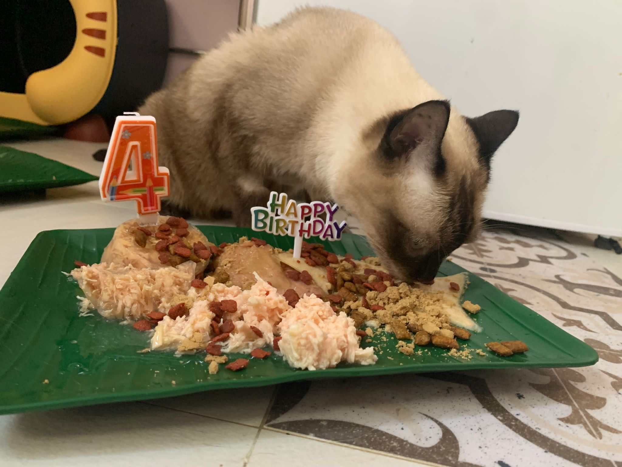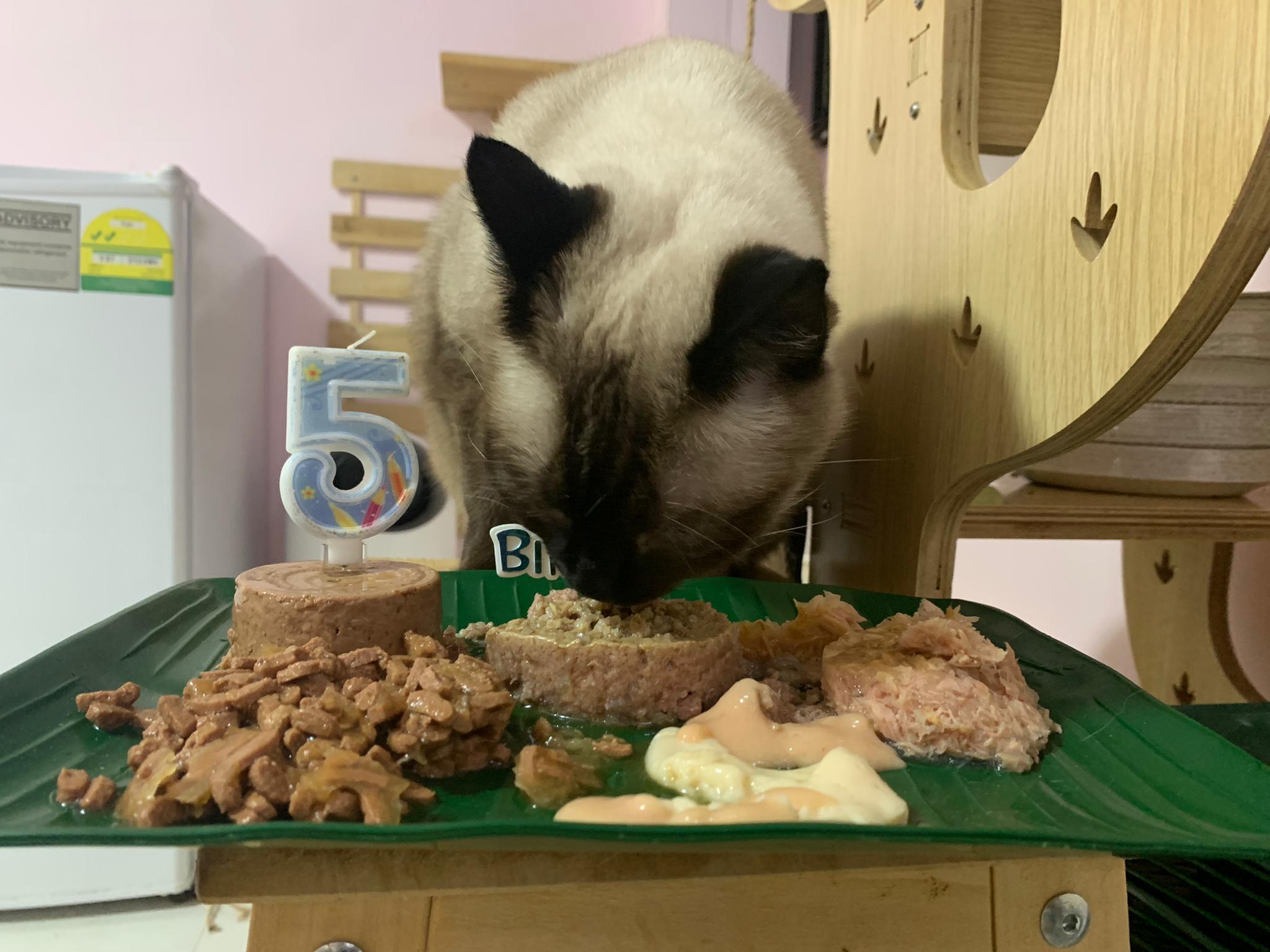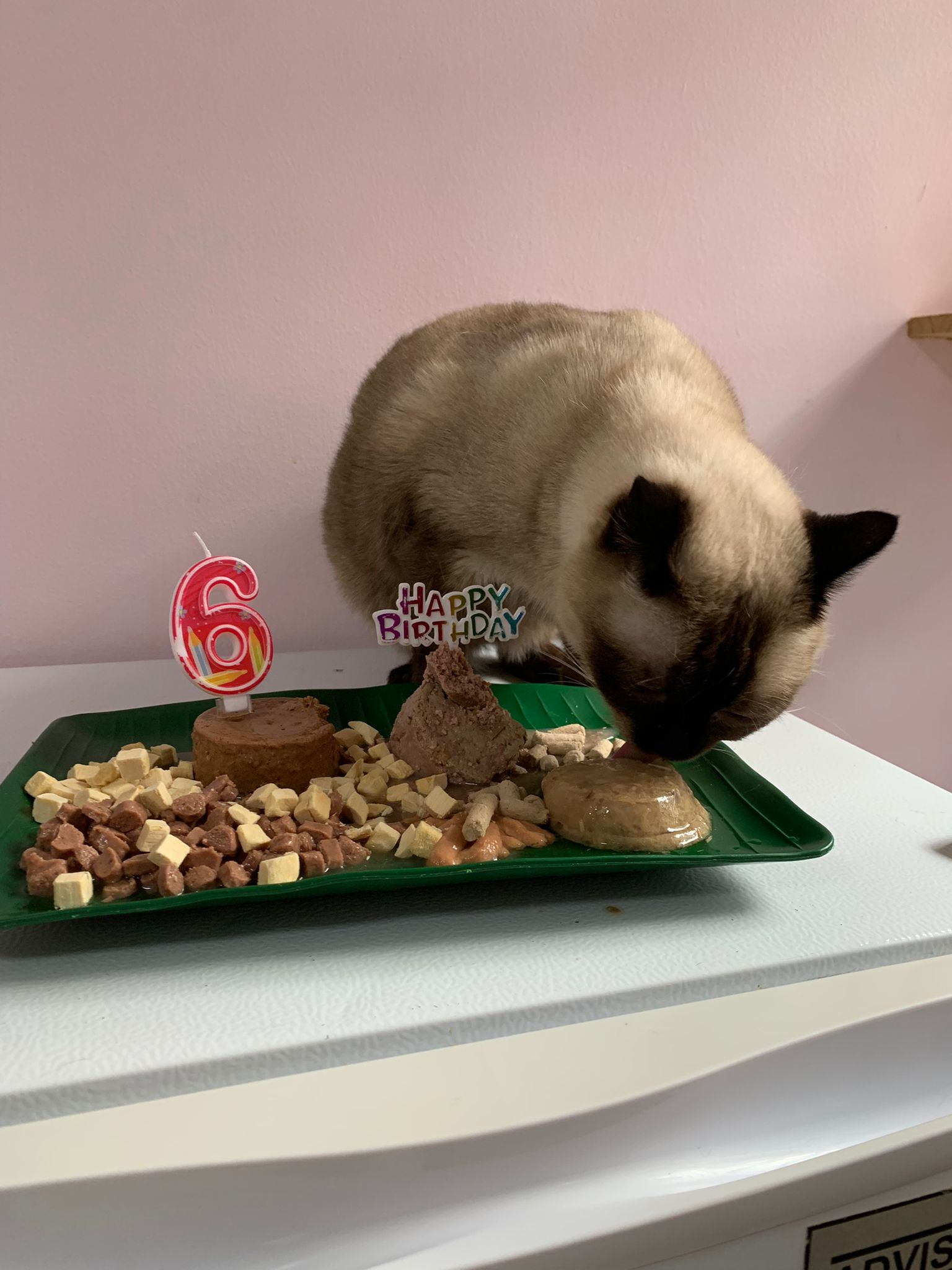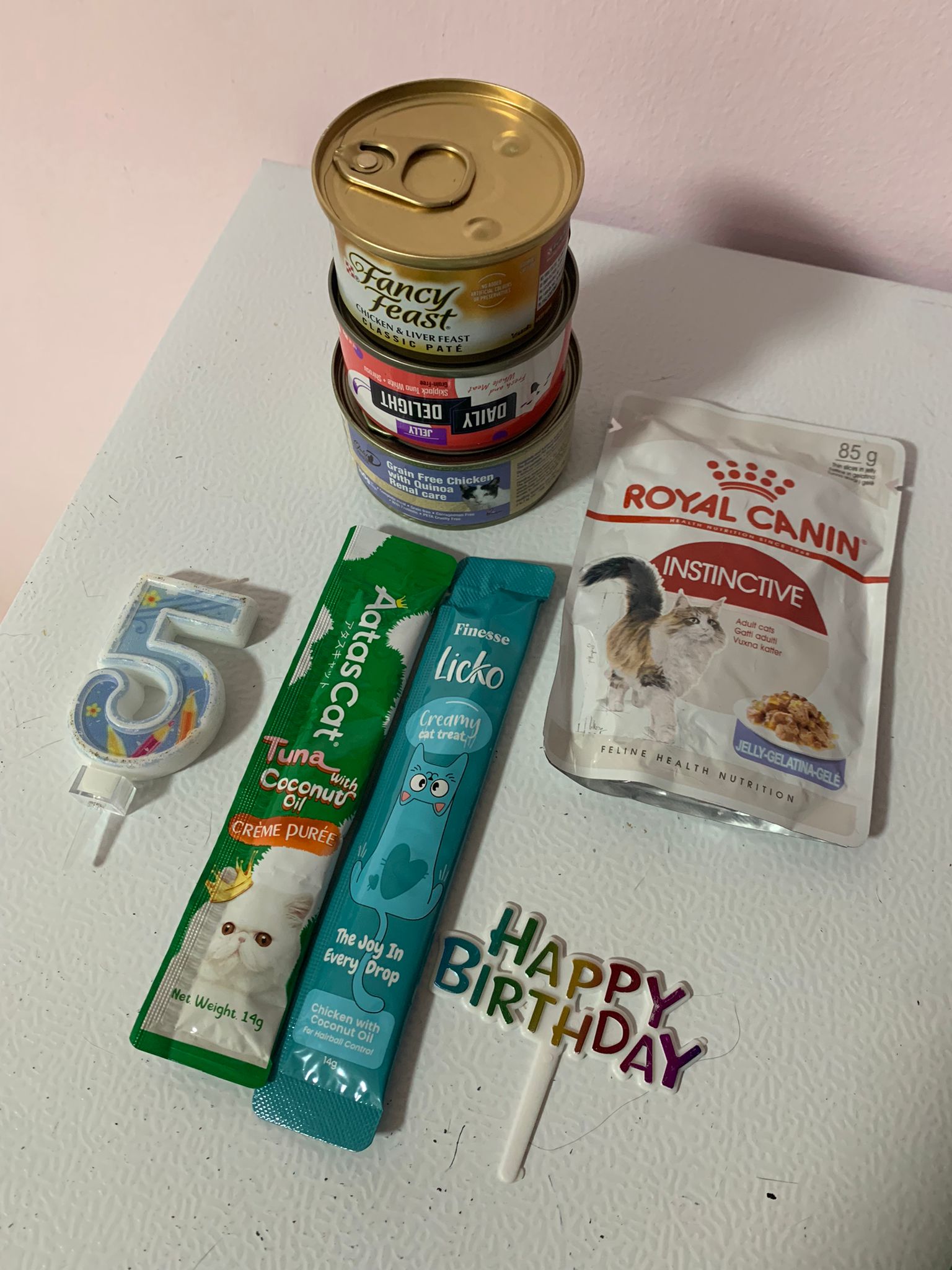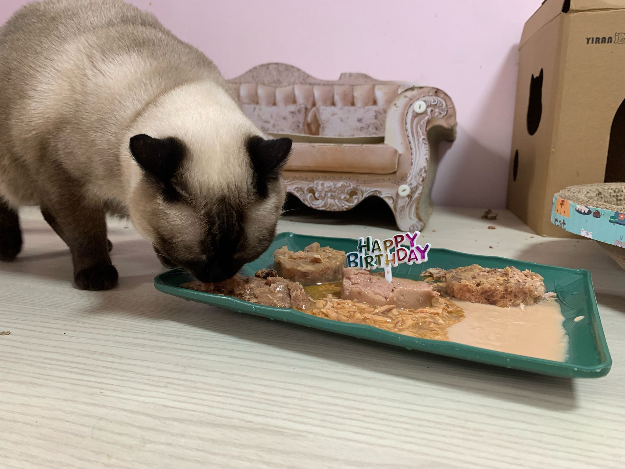Prep her bday plate n manja n rena alr corner me for food. Carry her to fridge to eat first. She attack ciao cup and move away, not that keen on food so I let her start her cat nip party.