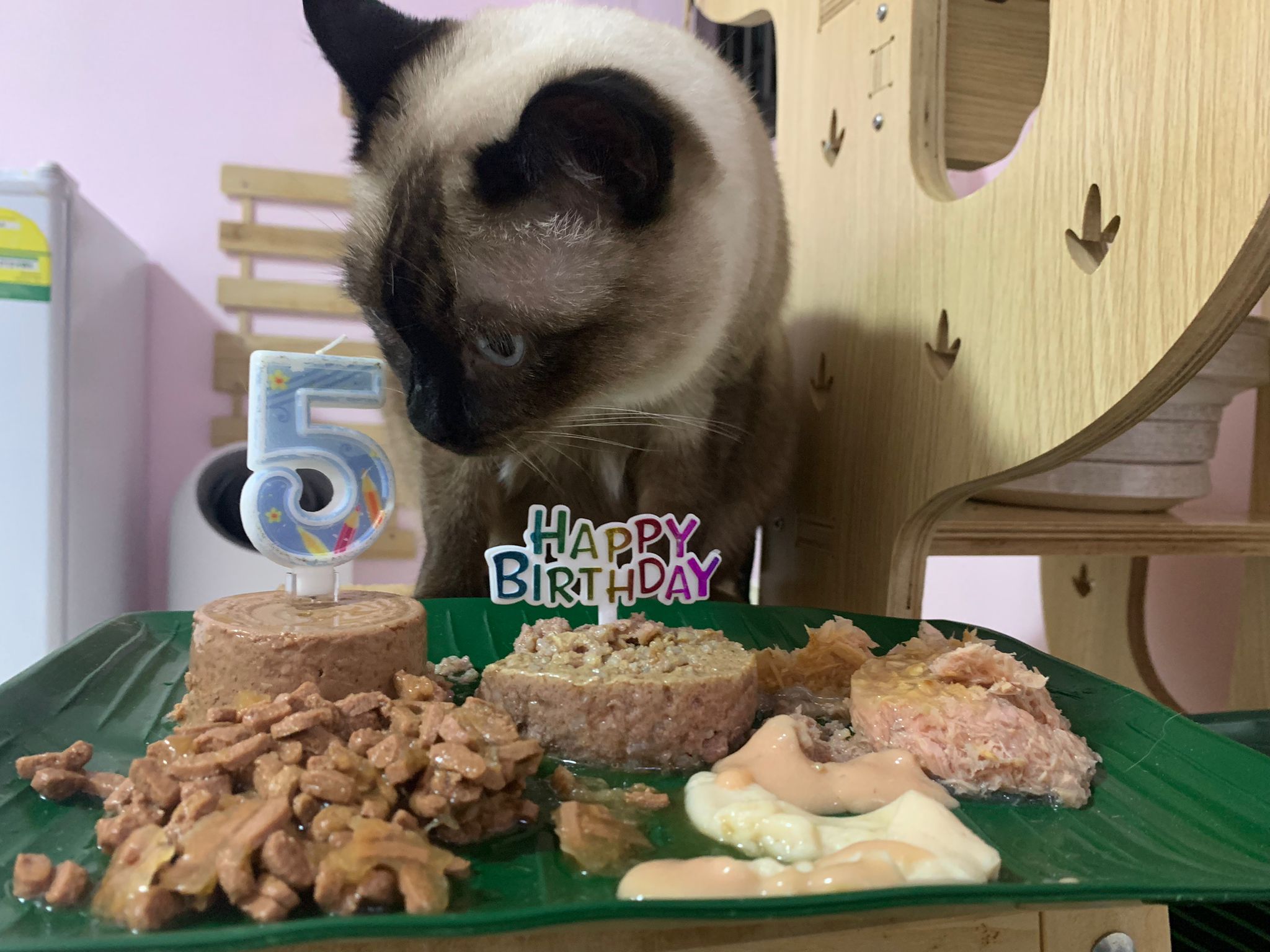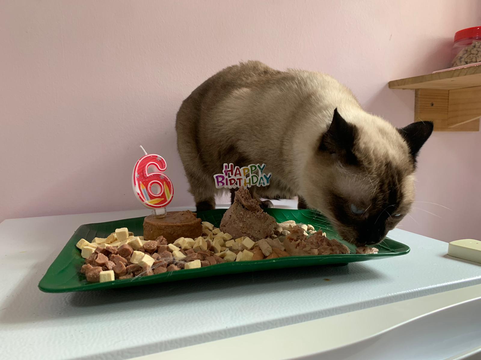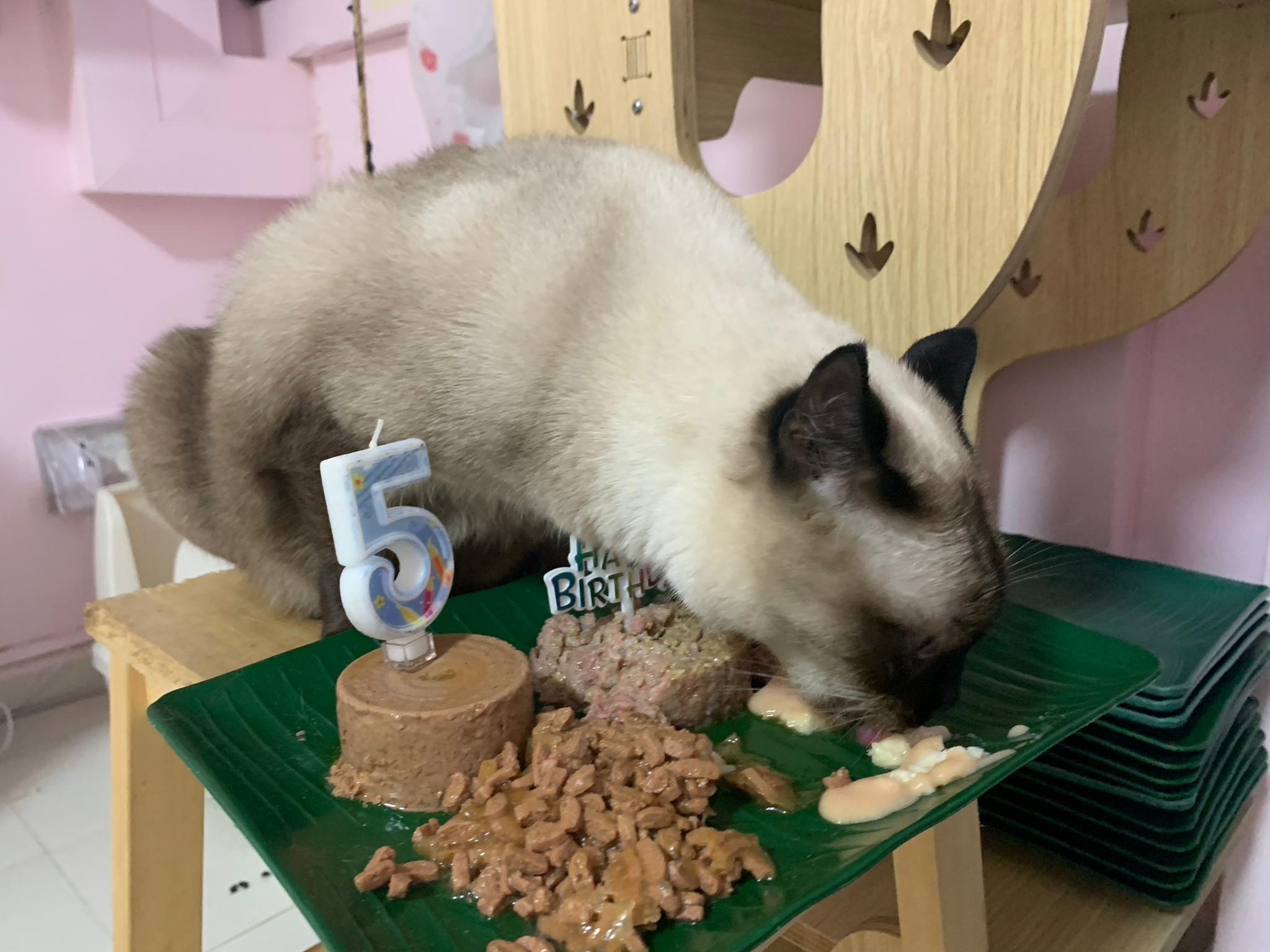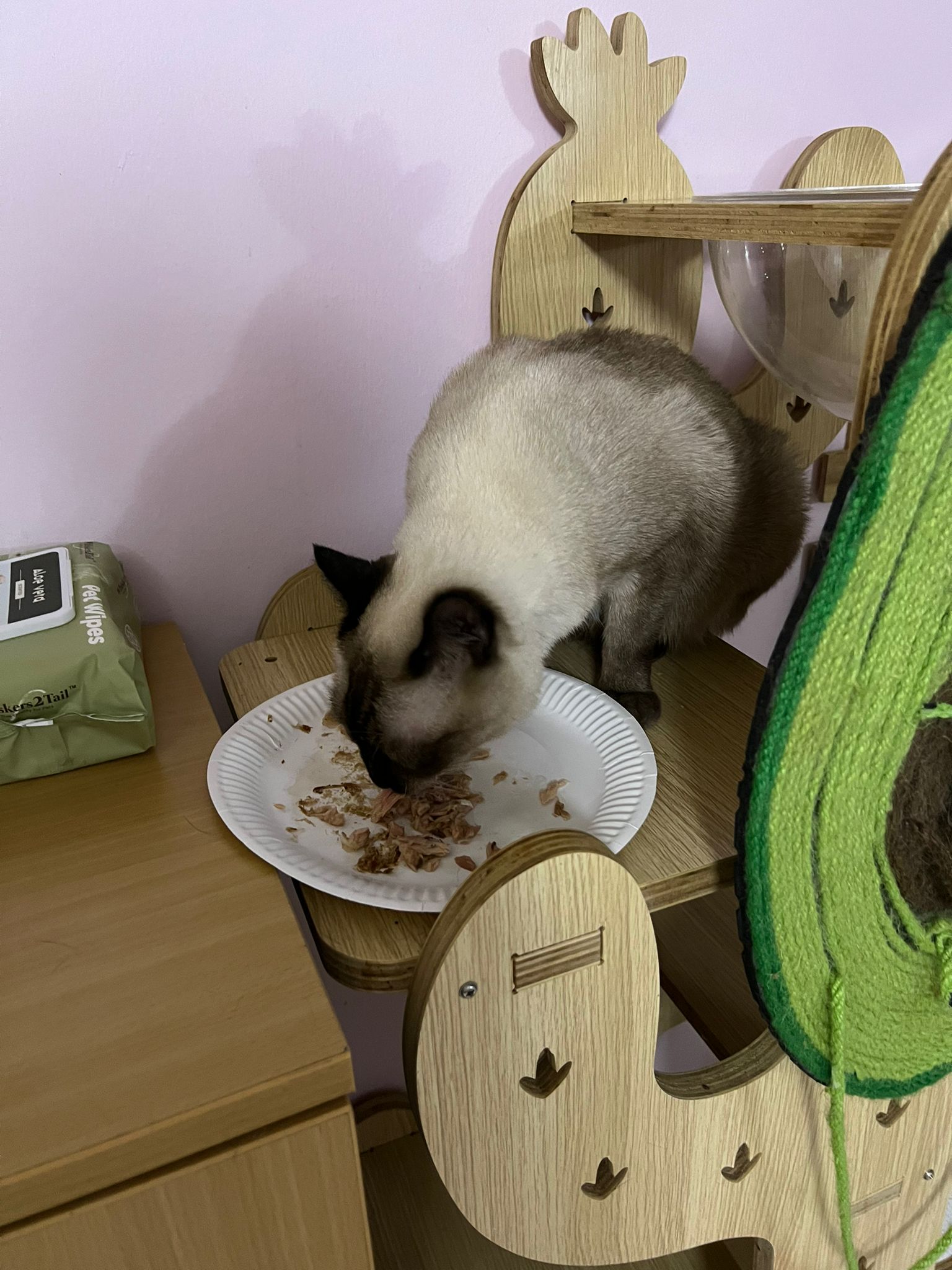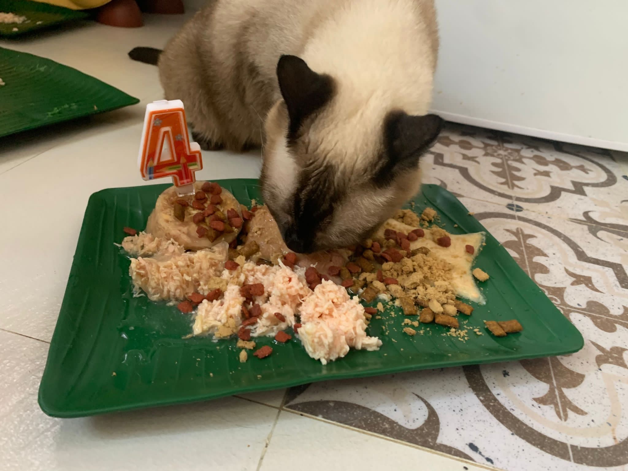 Prep her bday plate n manja n rena alr corner me for food. Carry her to fridge to eat first. She attack ciao cup and move away, not that keen on food so I let her start her cat nip party.