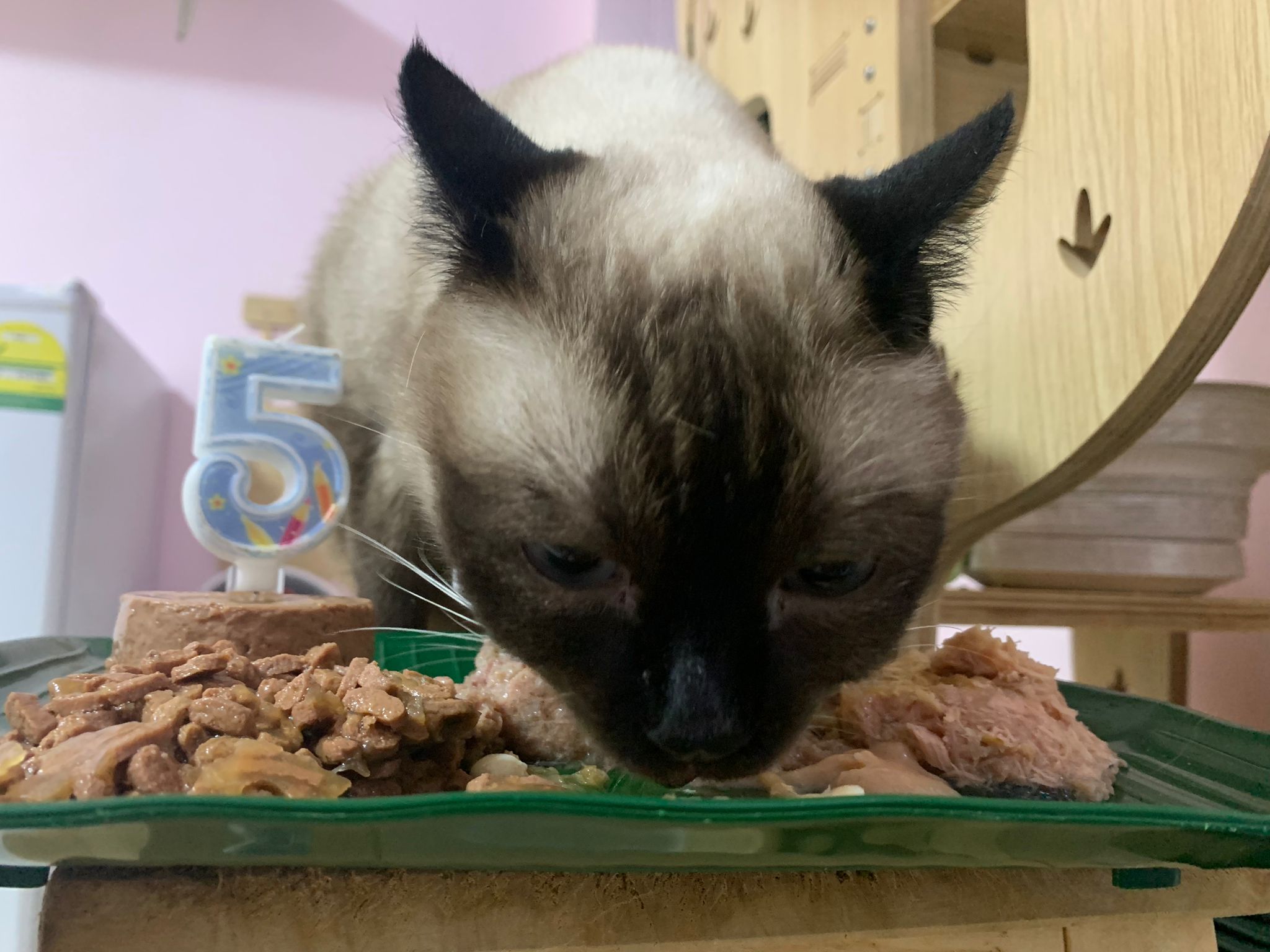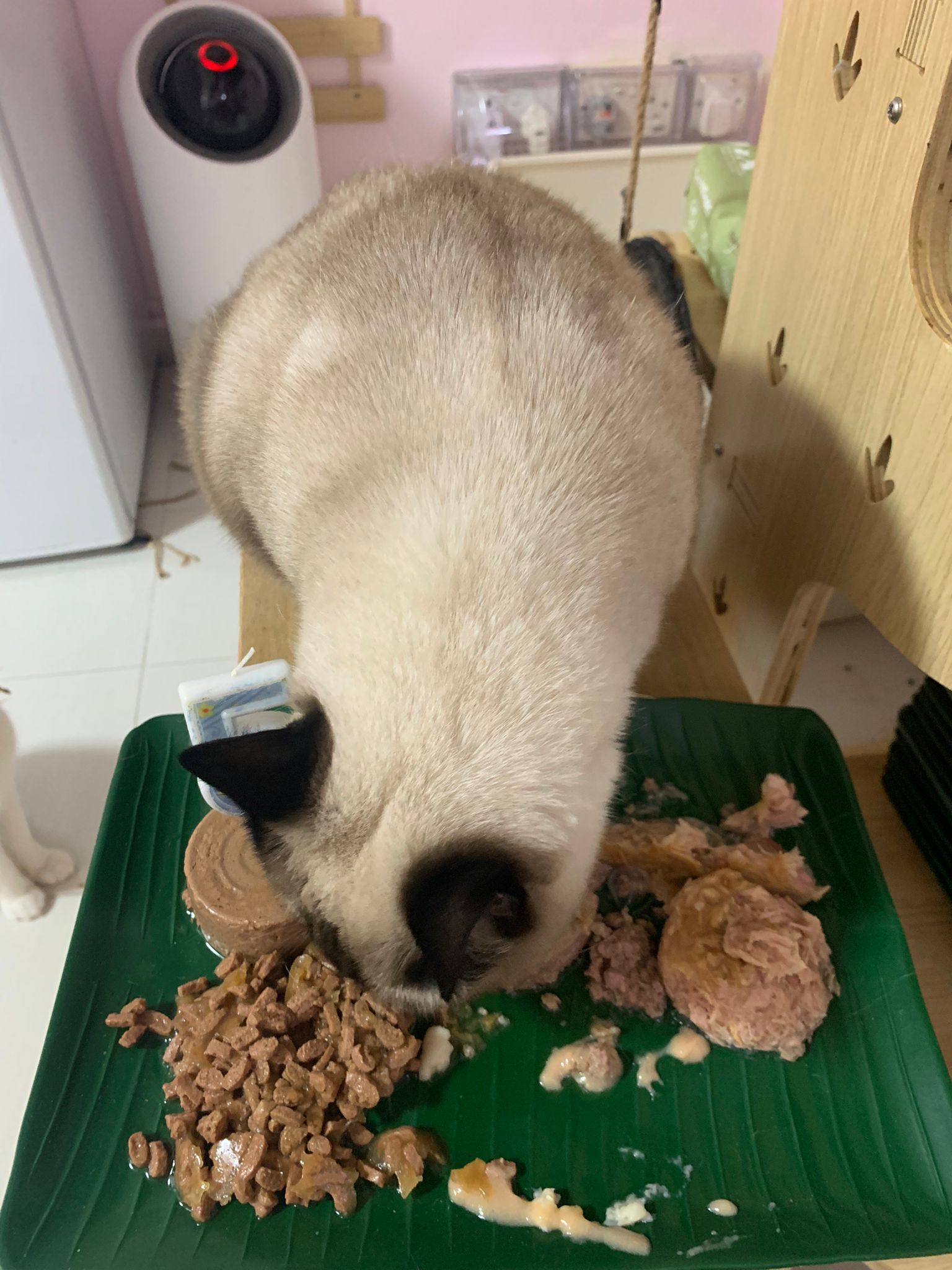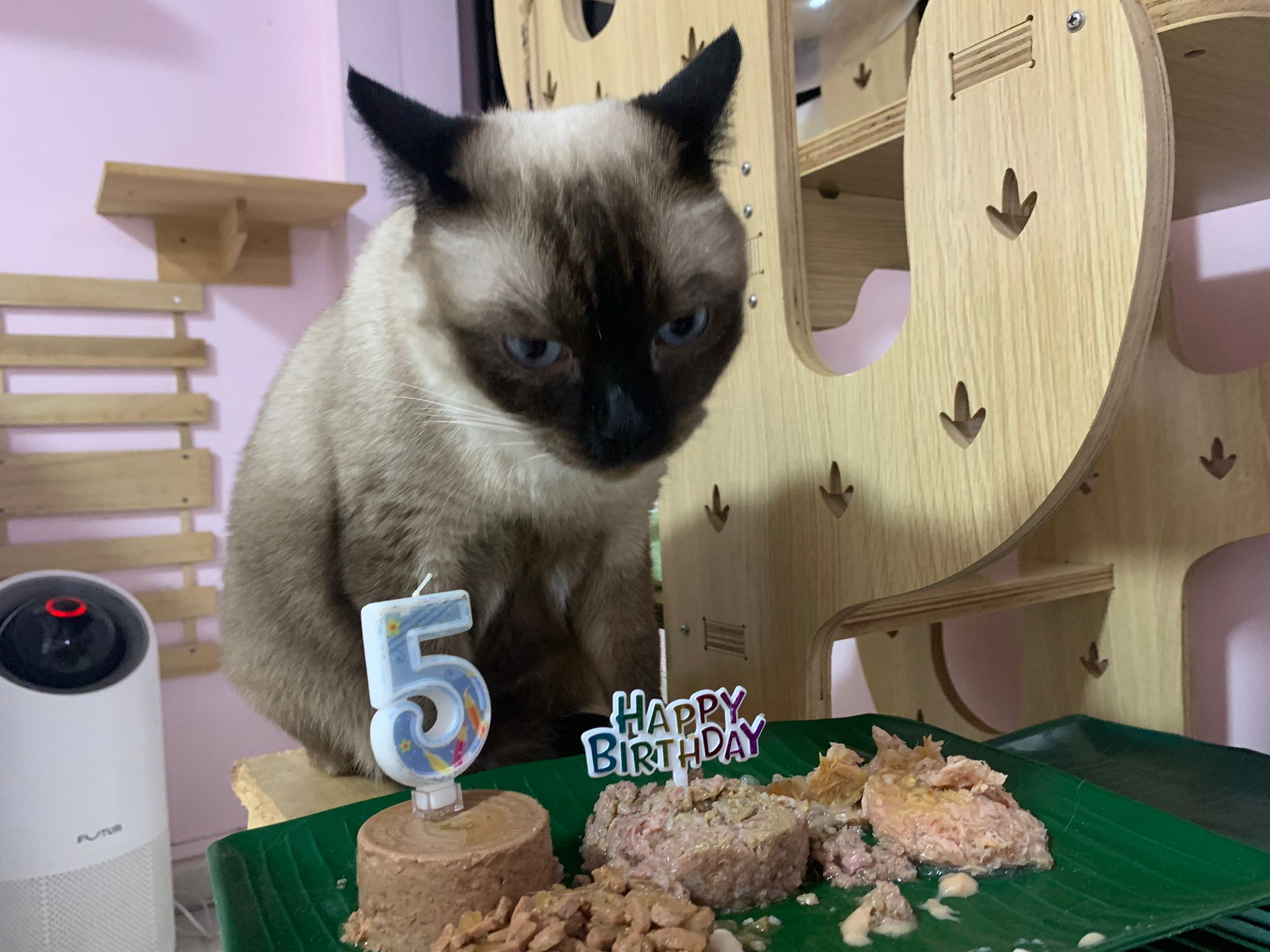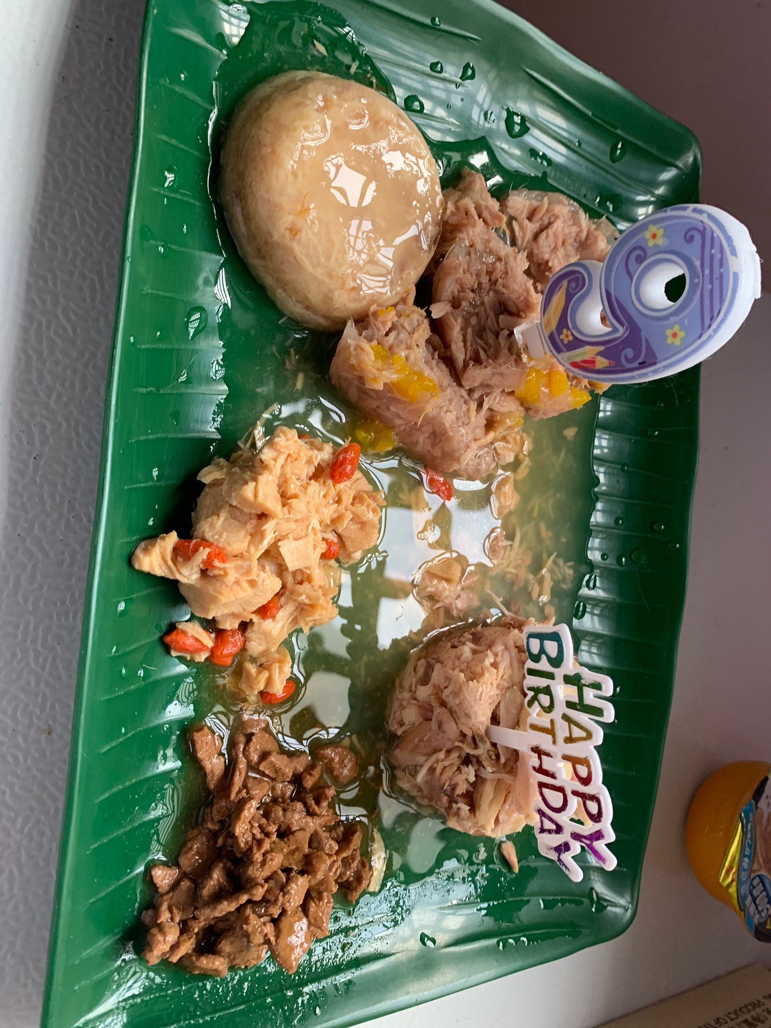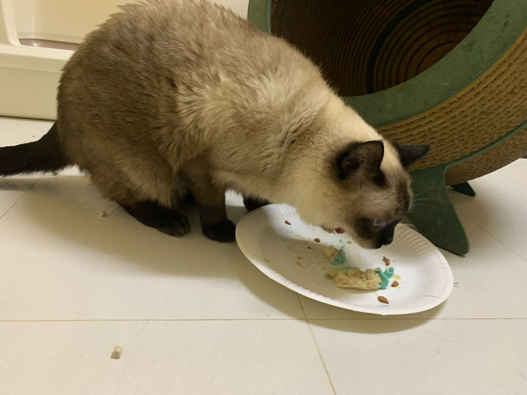 Prep her bday plate n manja n rena alr corner me for food. Carry her to fridge to eat first. She attack ciao cup and move away, not that keen on food so I let her start her cat nip party.