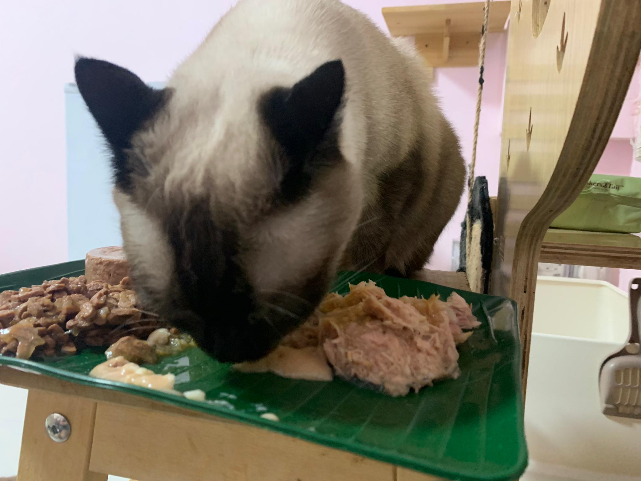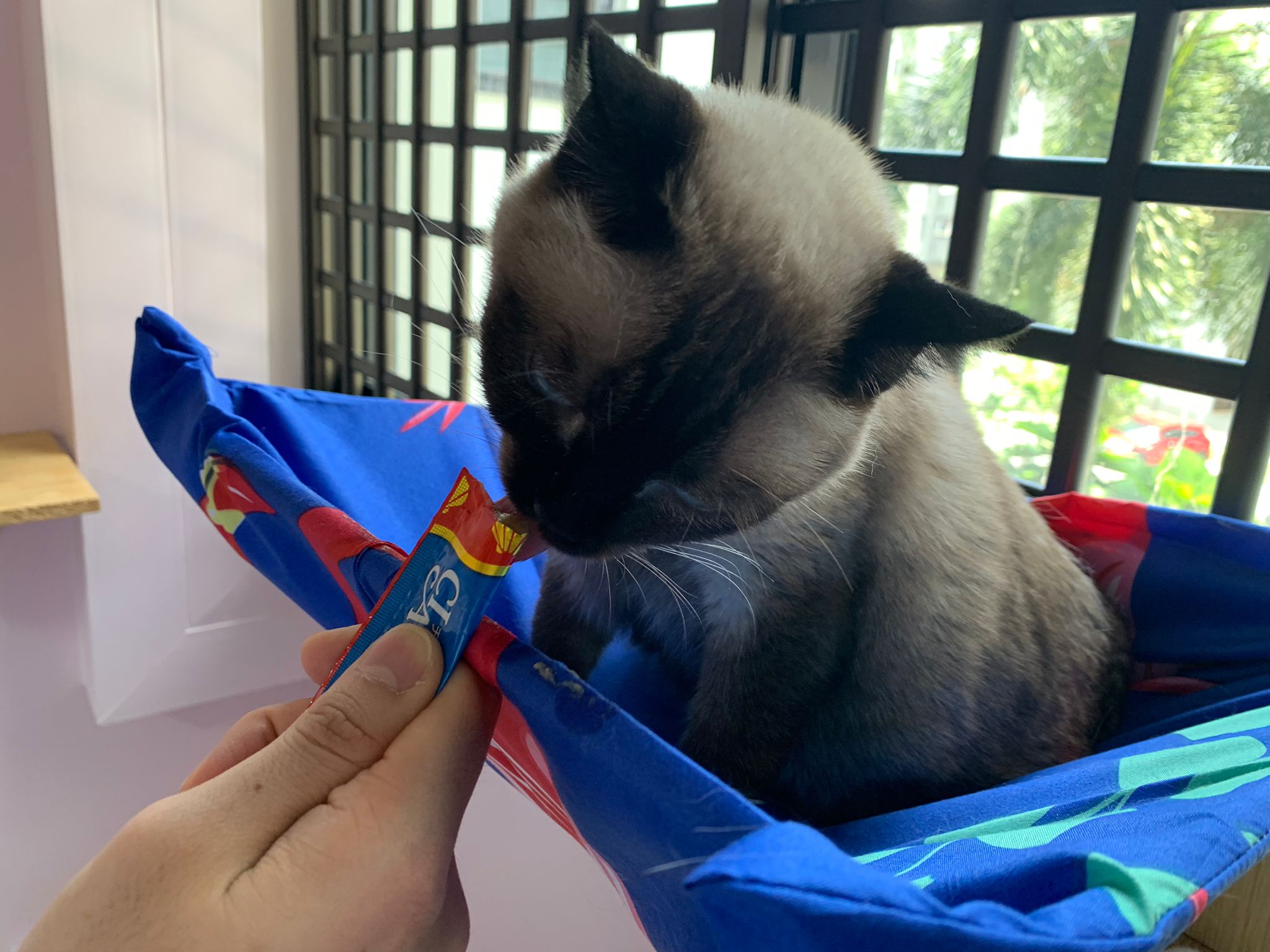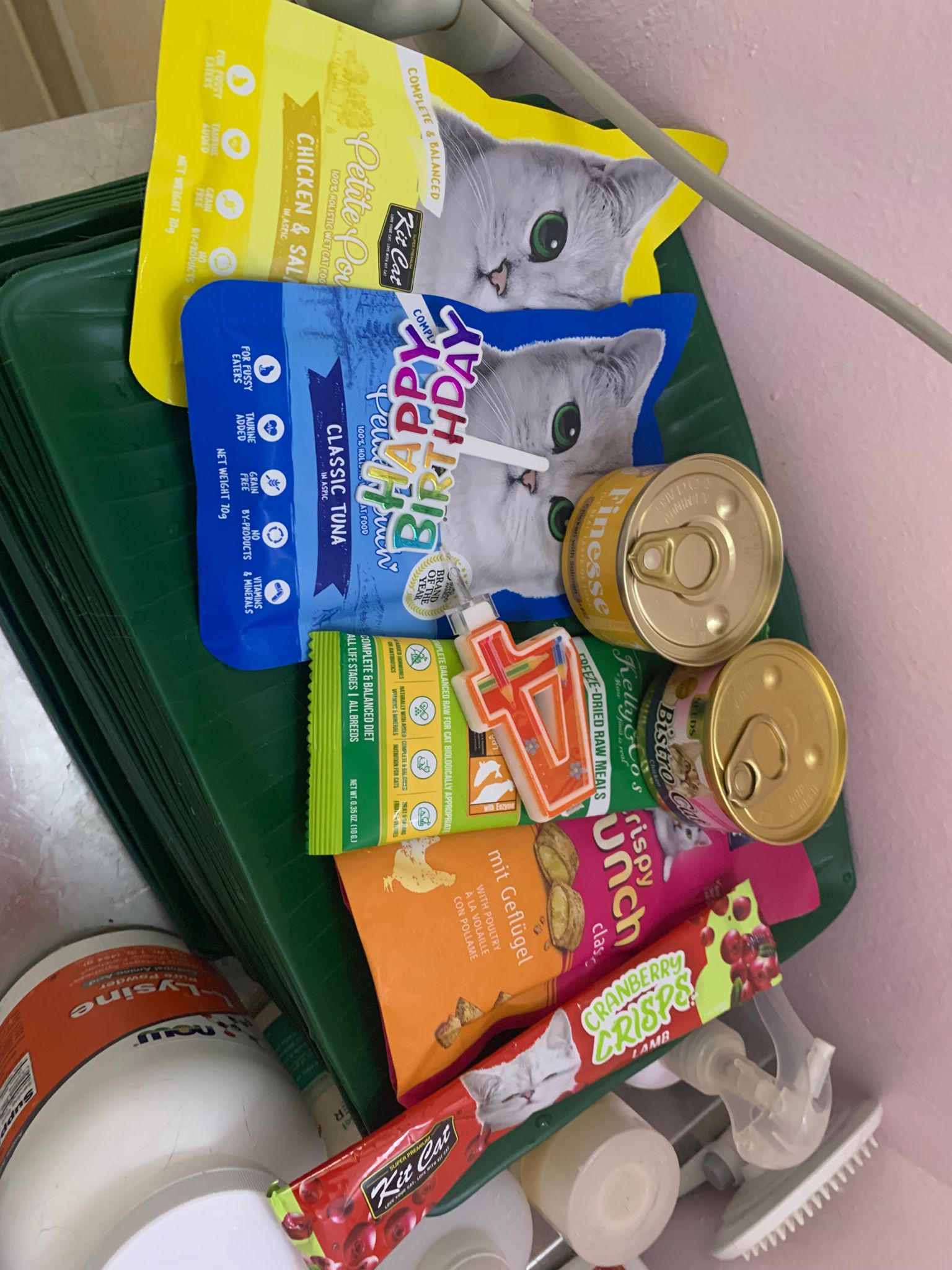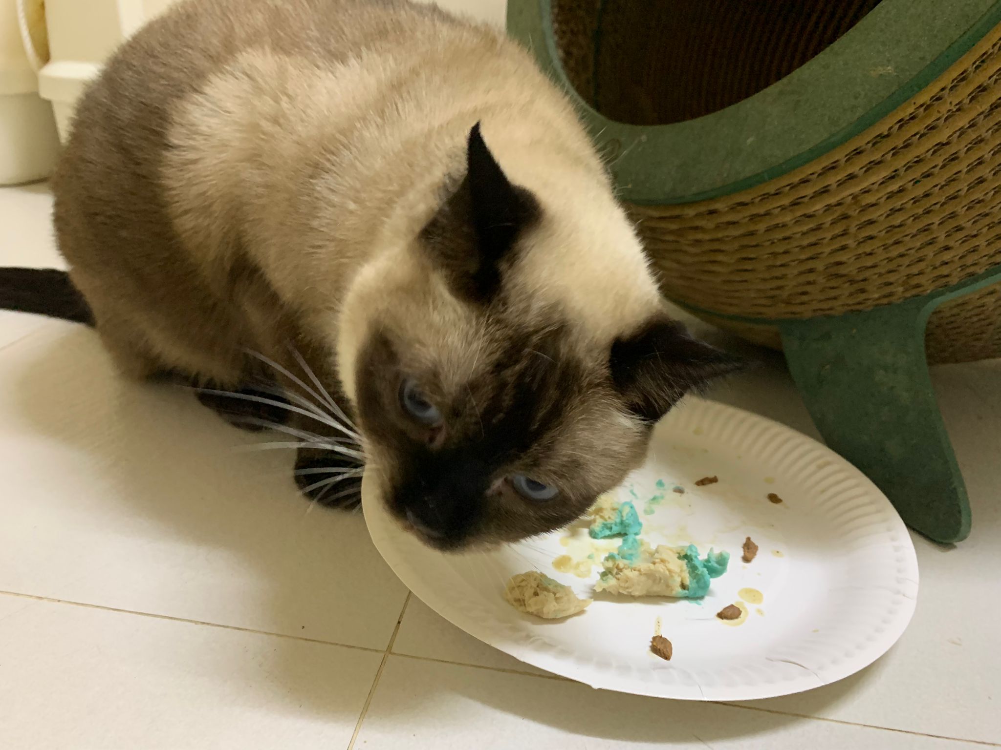 Prep her bday plate n manja n rena alr corner me for food. Carry her to fridge to eat first. She attack ciao cup and move away, not that keen on food so I let her start her cat nip party.