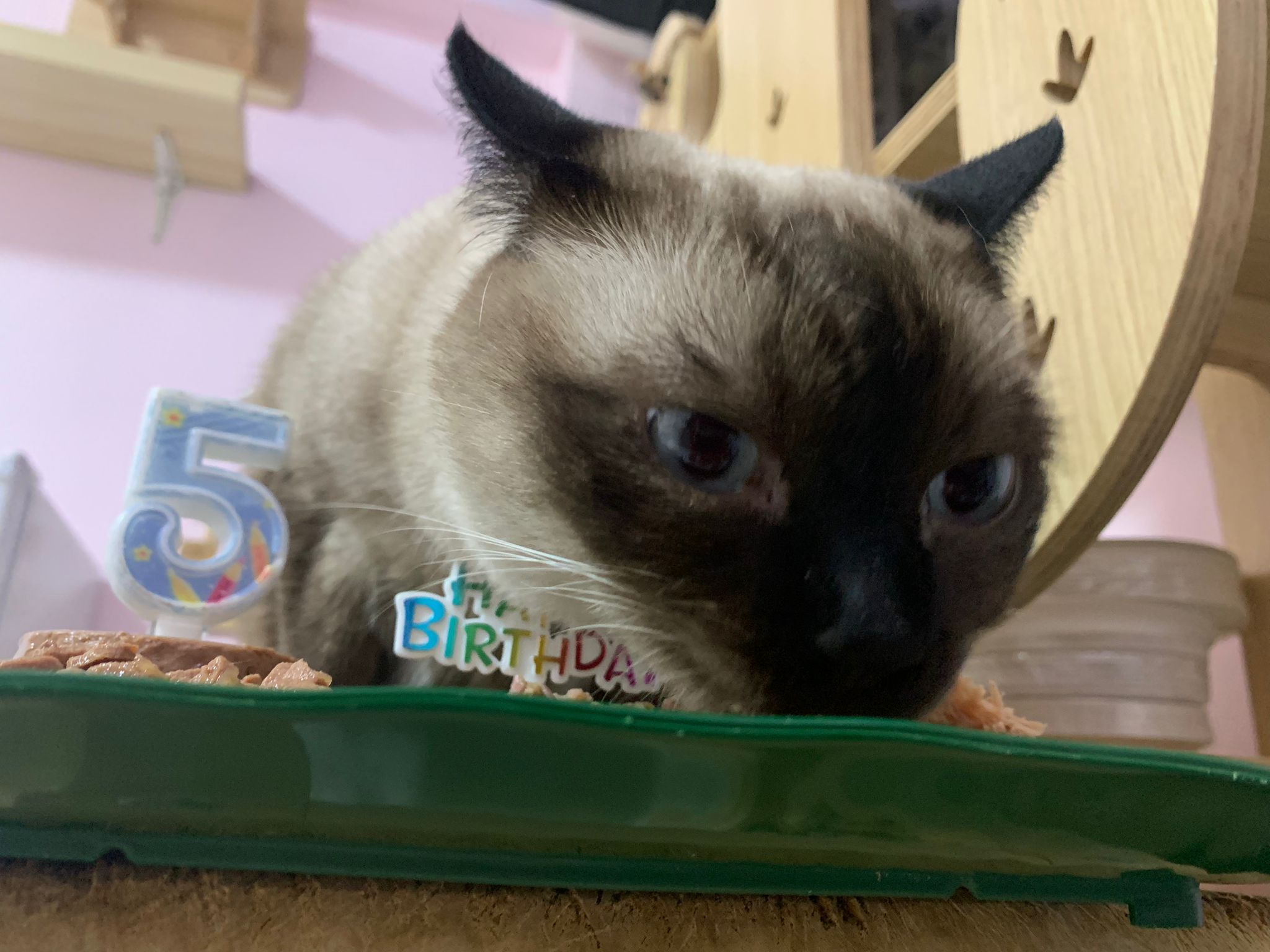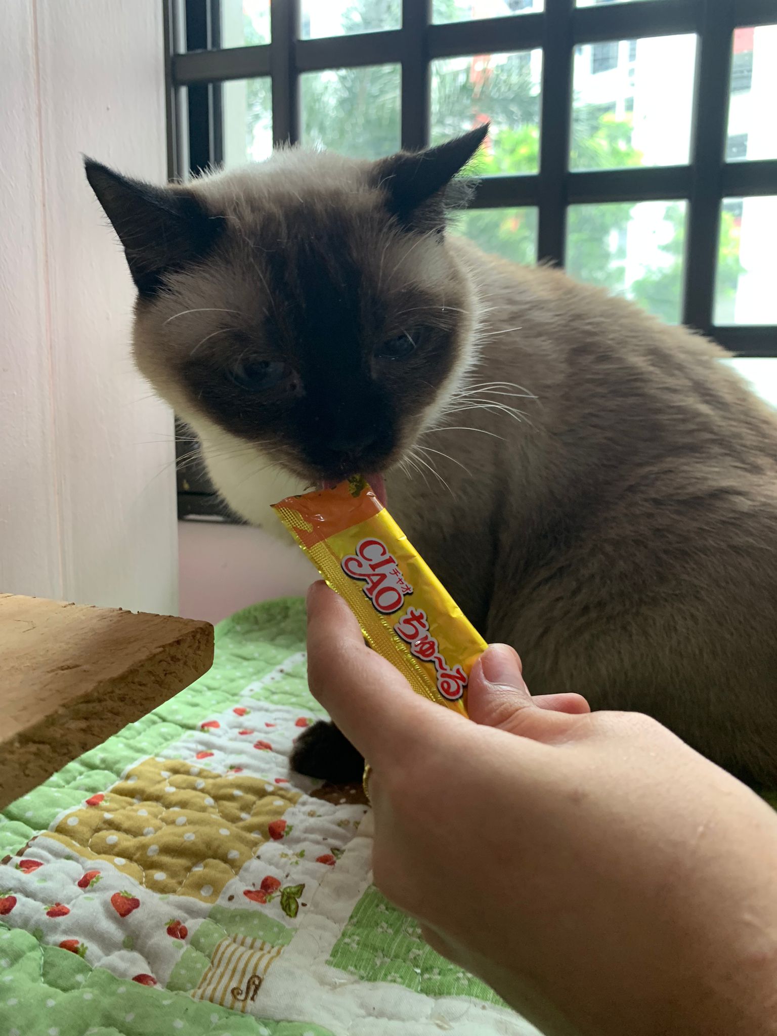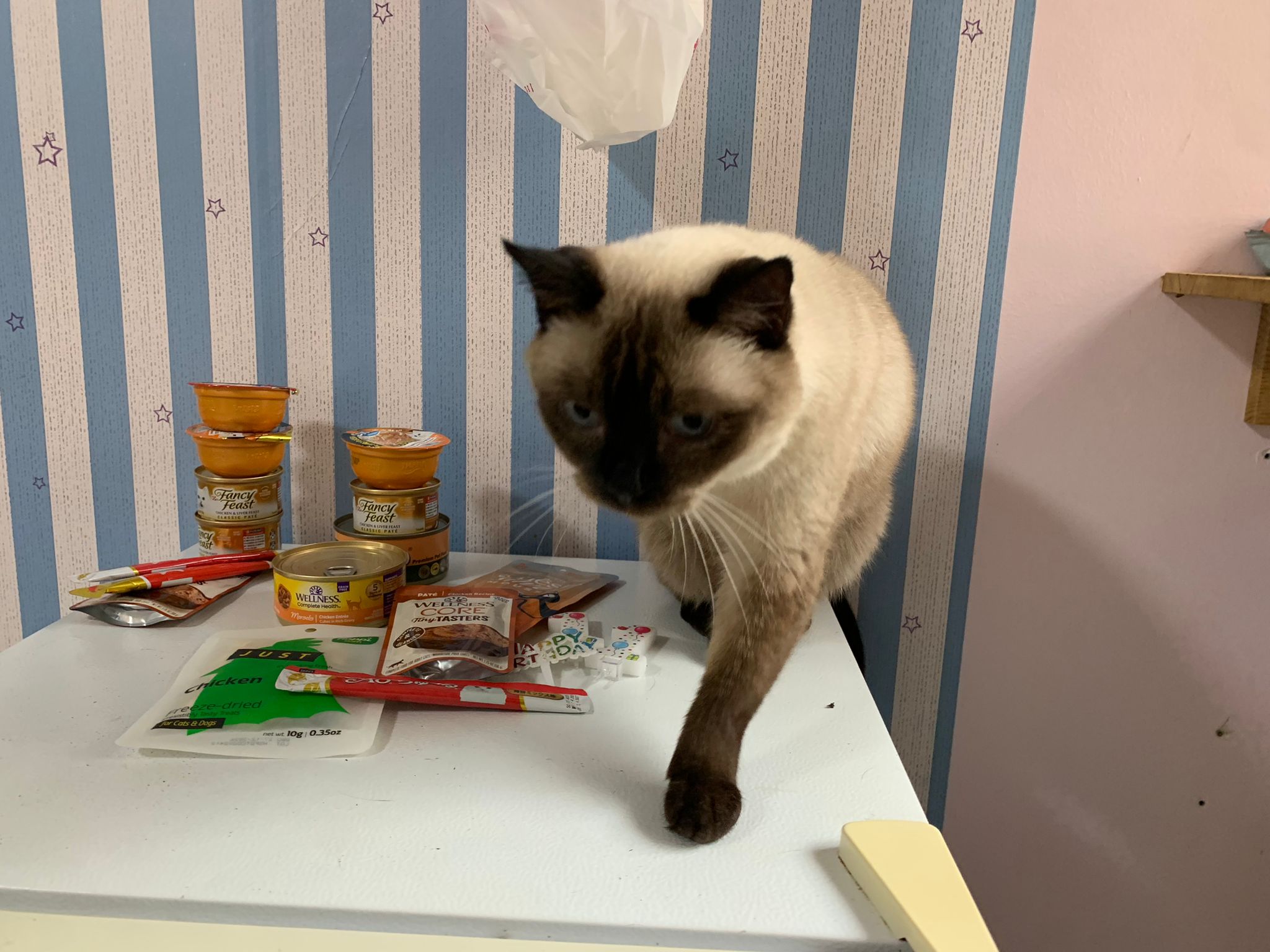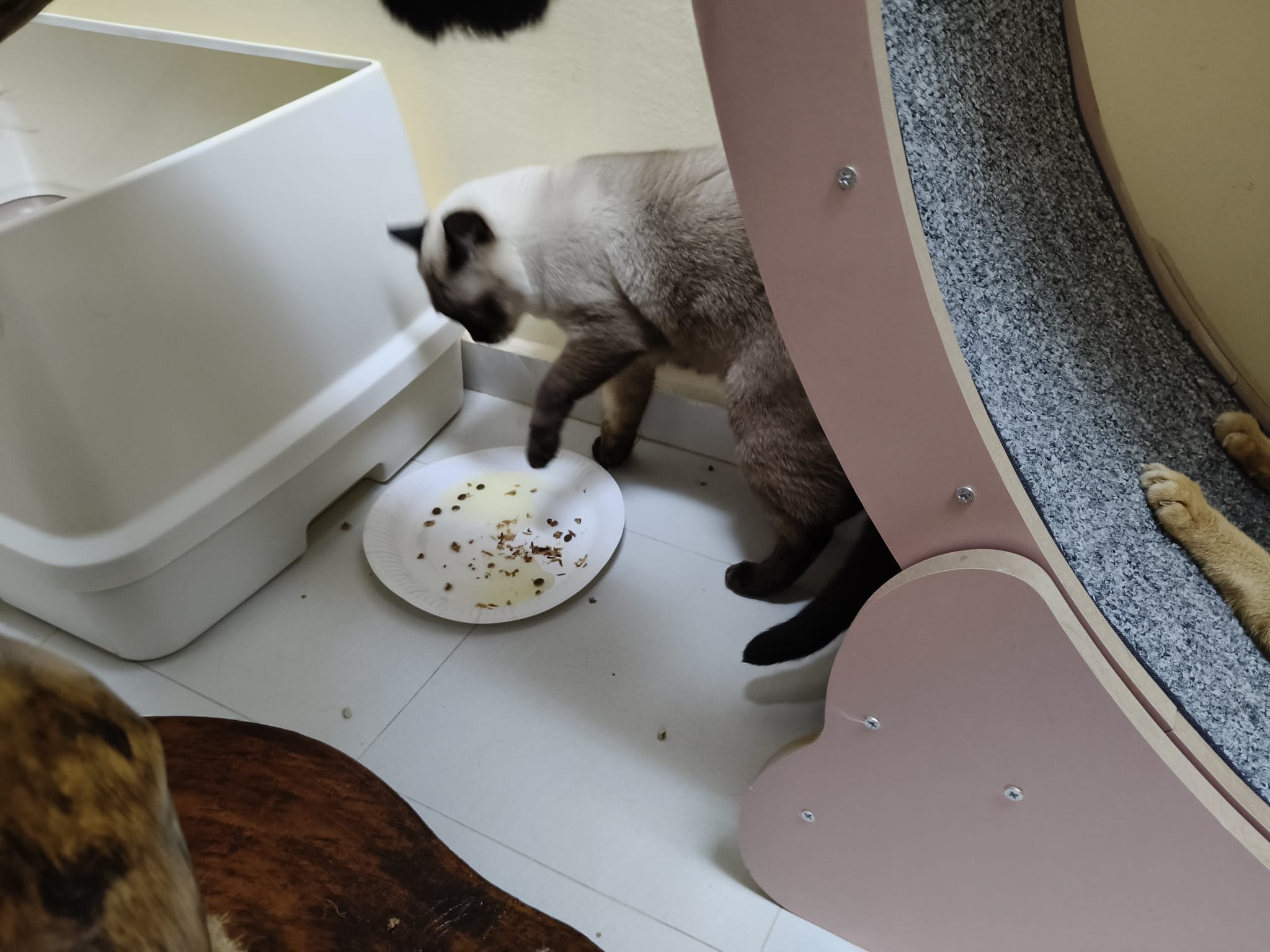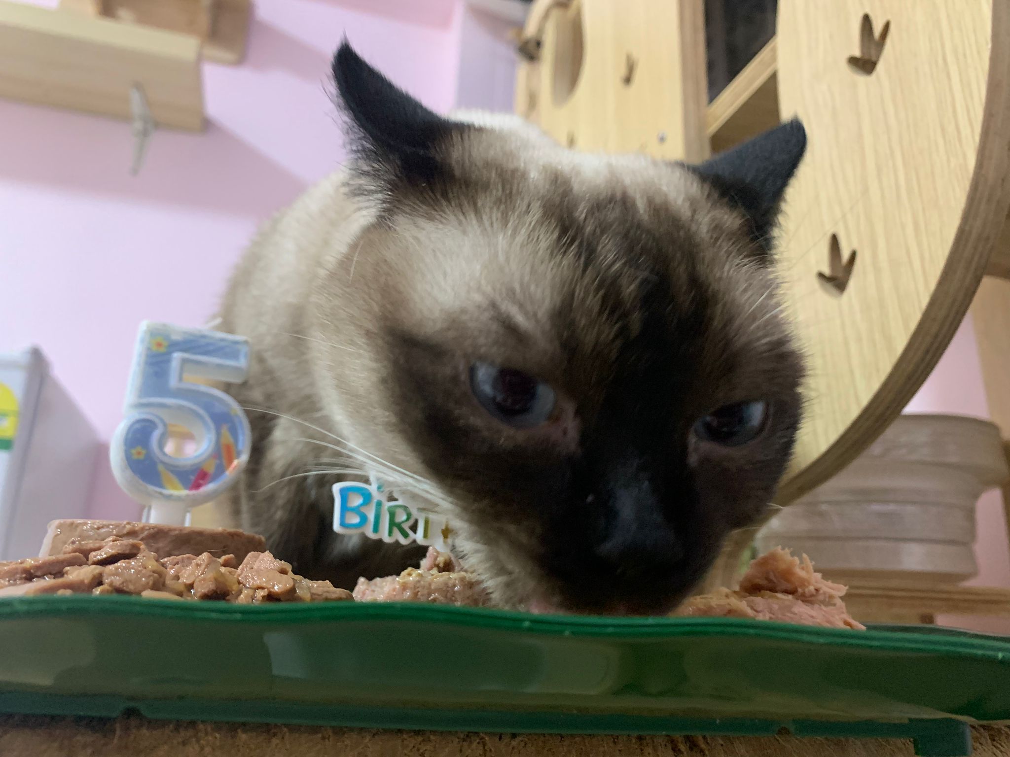 Prep her bday plate n manja n rena alr corner me for food. Carry her to fridge to eat first. She attack ciao cup and move away, not that keen on food so I let her start her cat nip party.