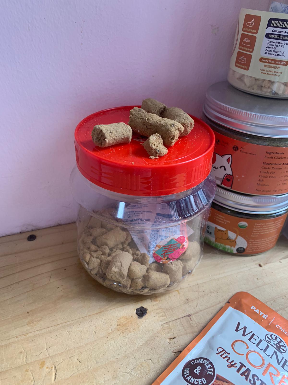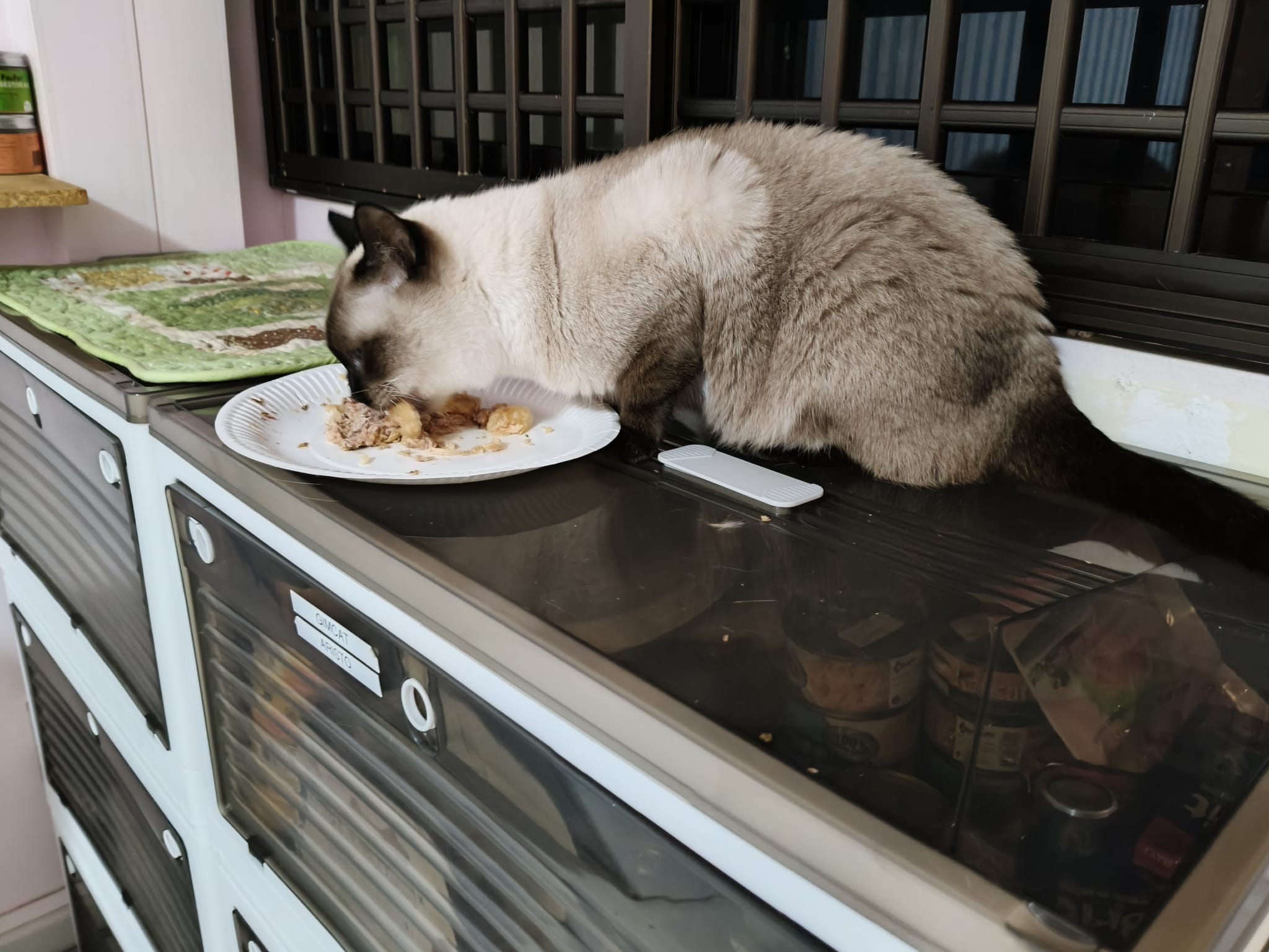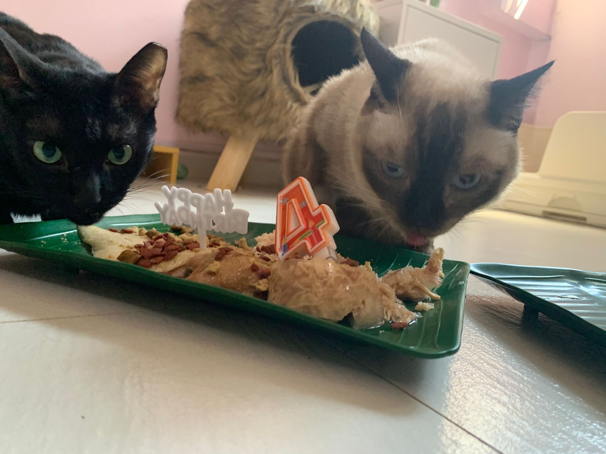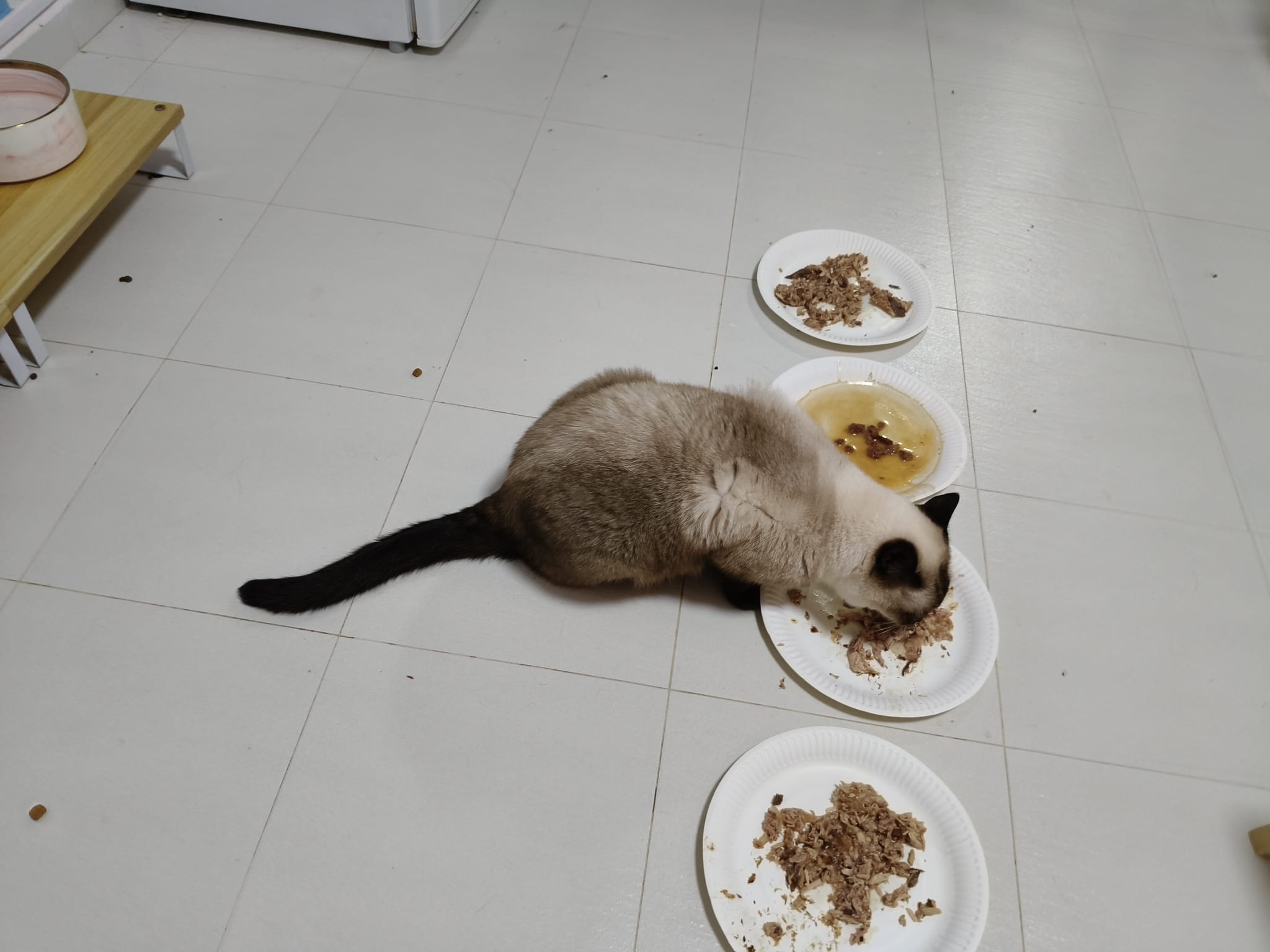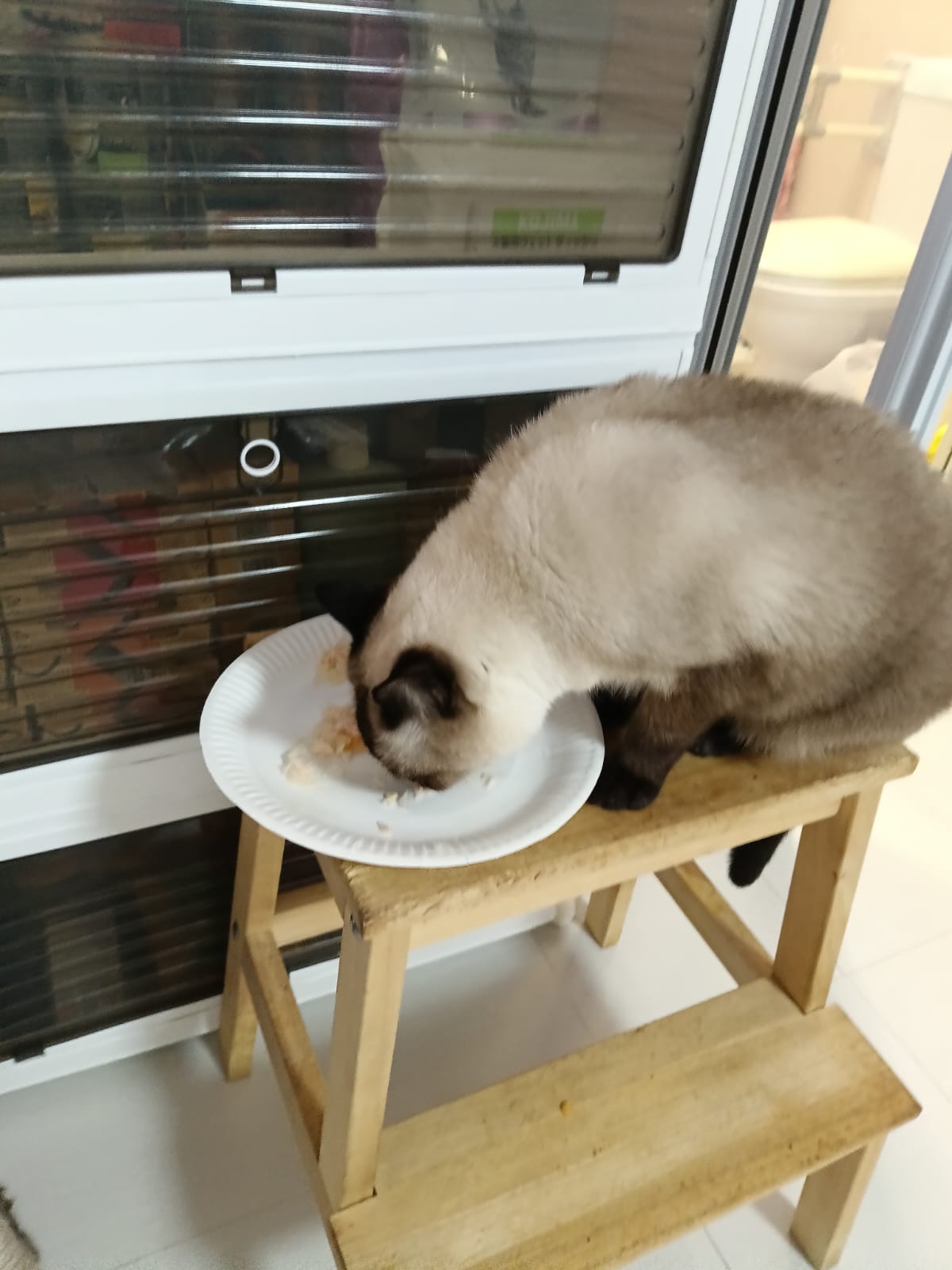 Prep her bday plate n manja n rena alr corner me for food. Carry her to fridge to eat first. She attack ciao cup and move away, not that keen on food so I let her start her cat nip party.