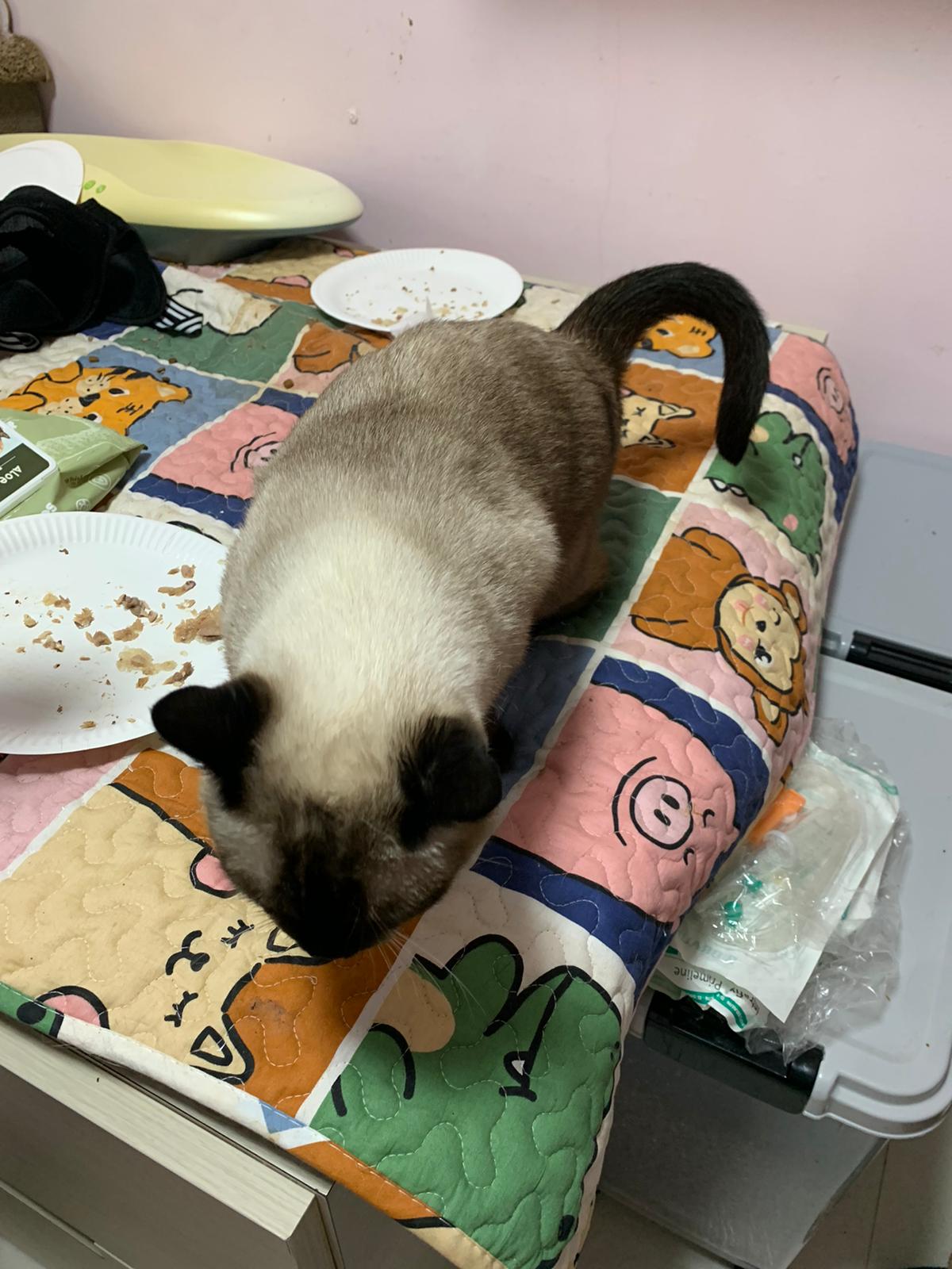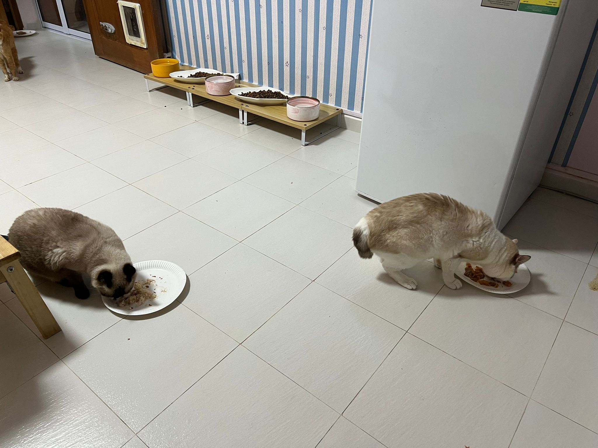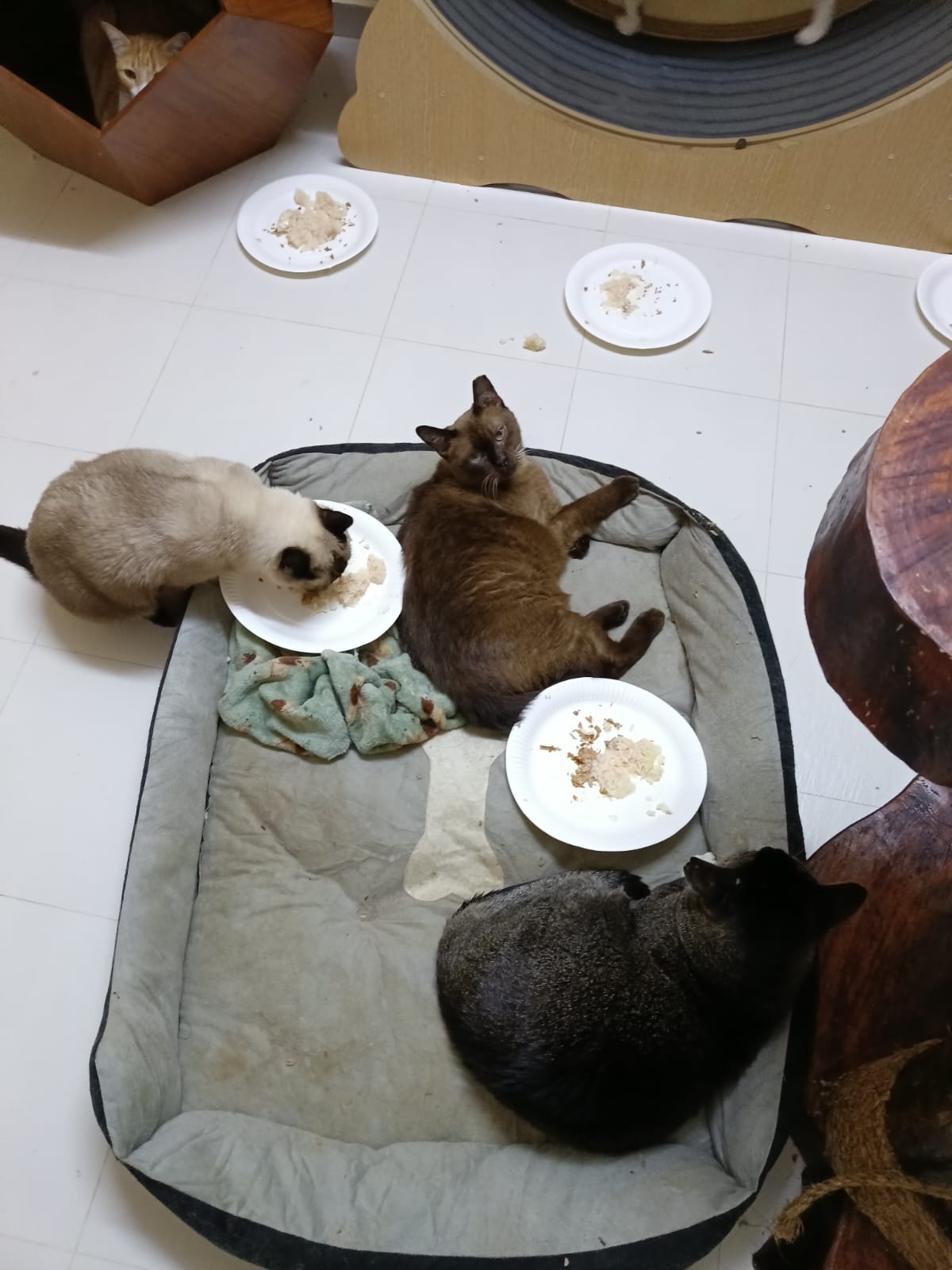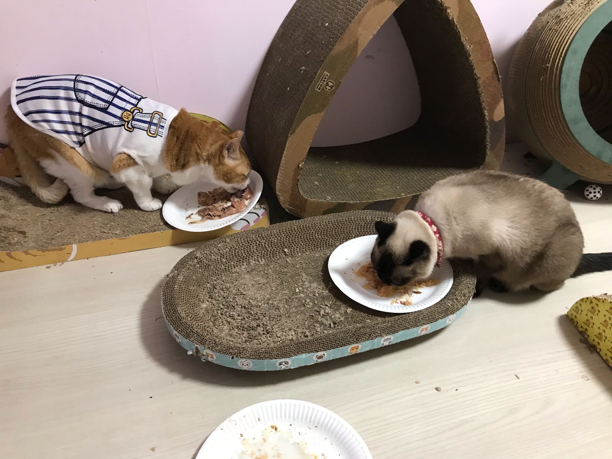 Morning: agnes come 猫房 celebrate her bday w the cats. She bring treats for them n tao eat quite a lot.
