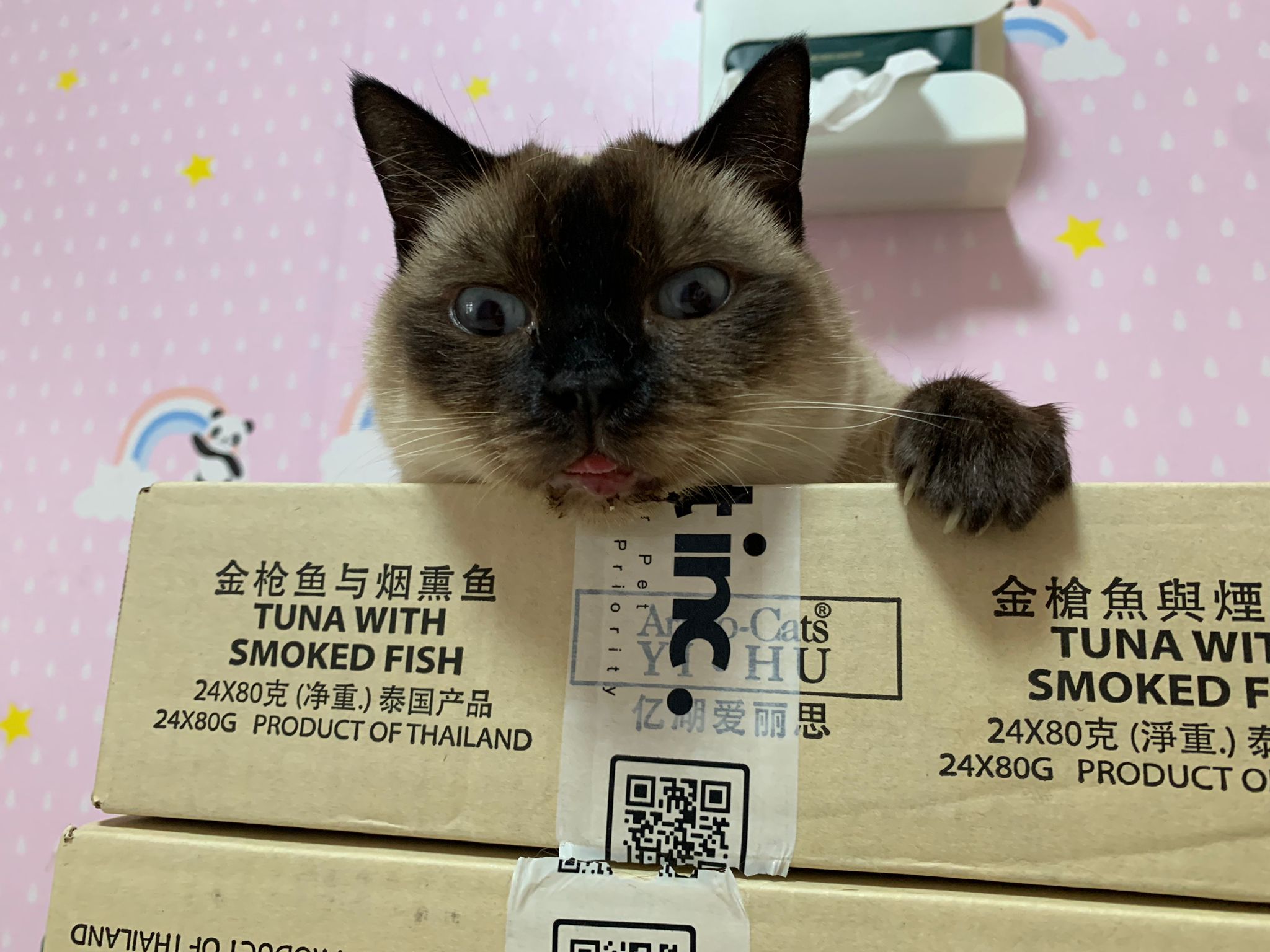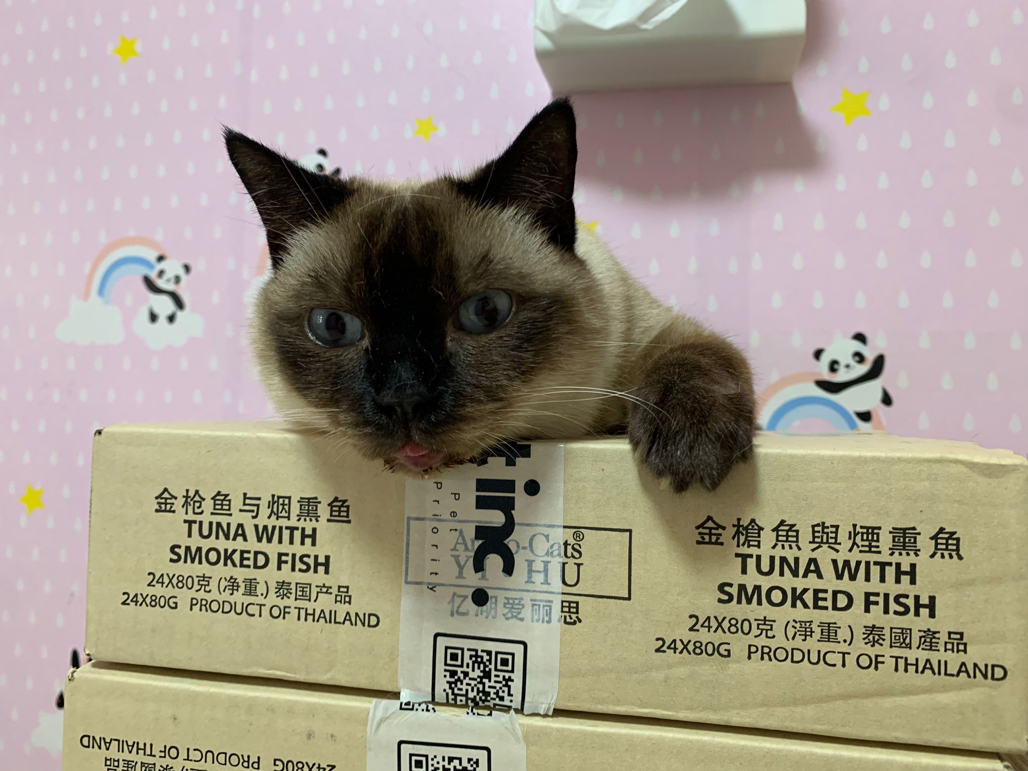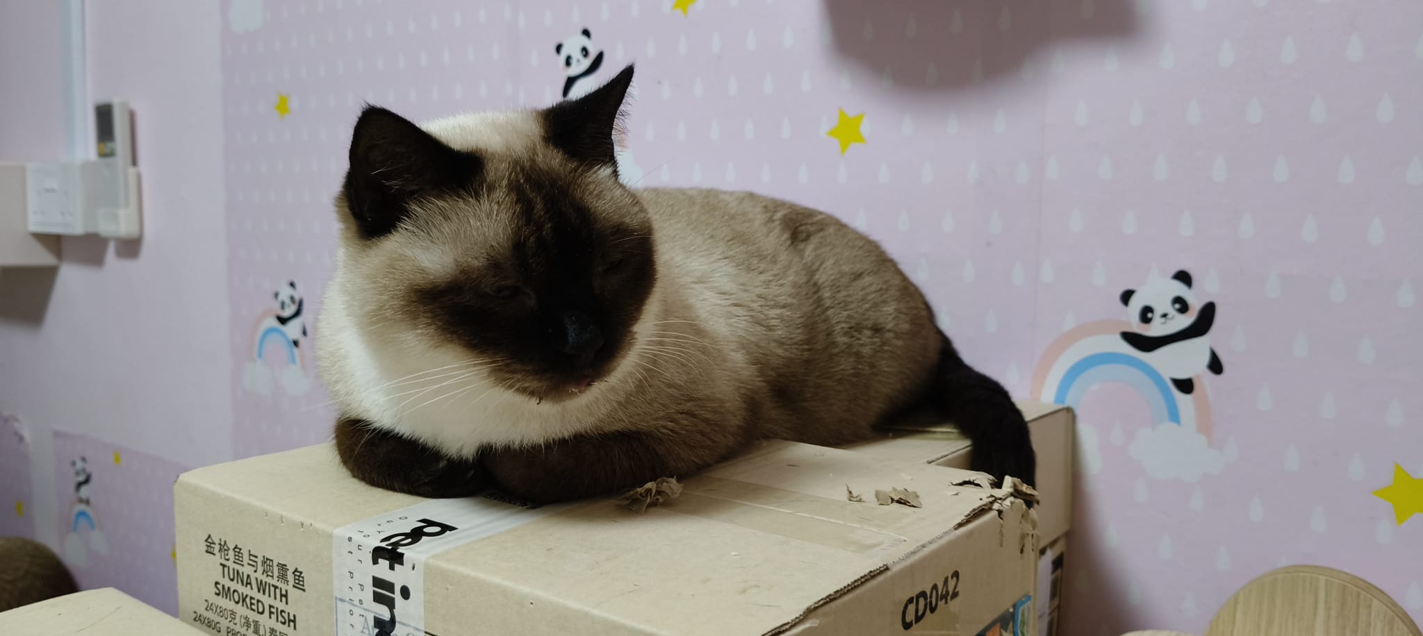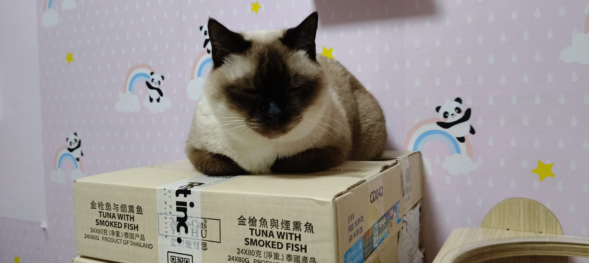 11am+: this girl super cute lying flat and I sayang her n she keep following me. Give her FFG CHICKEN n I know she is still waiting for ciao fillet. I bought a lot for them le. Later then give again. Need to pack 猫房 again. Today stock a lot of baby wipes need to find things to throw to make Space.