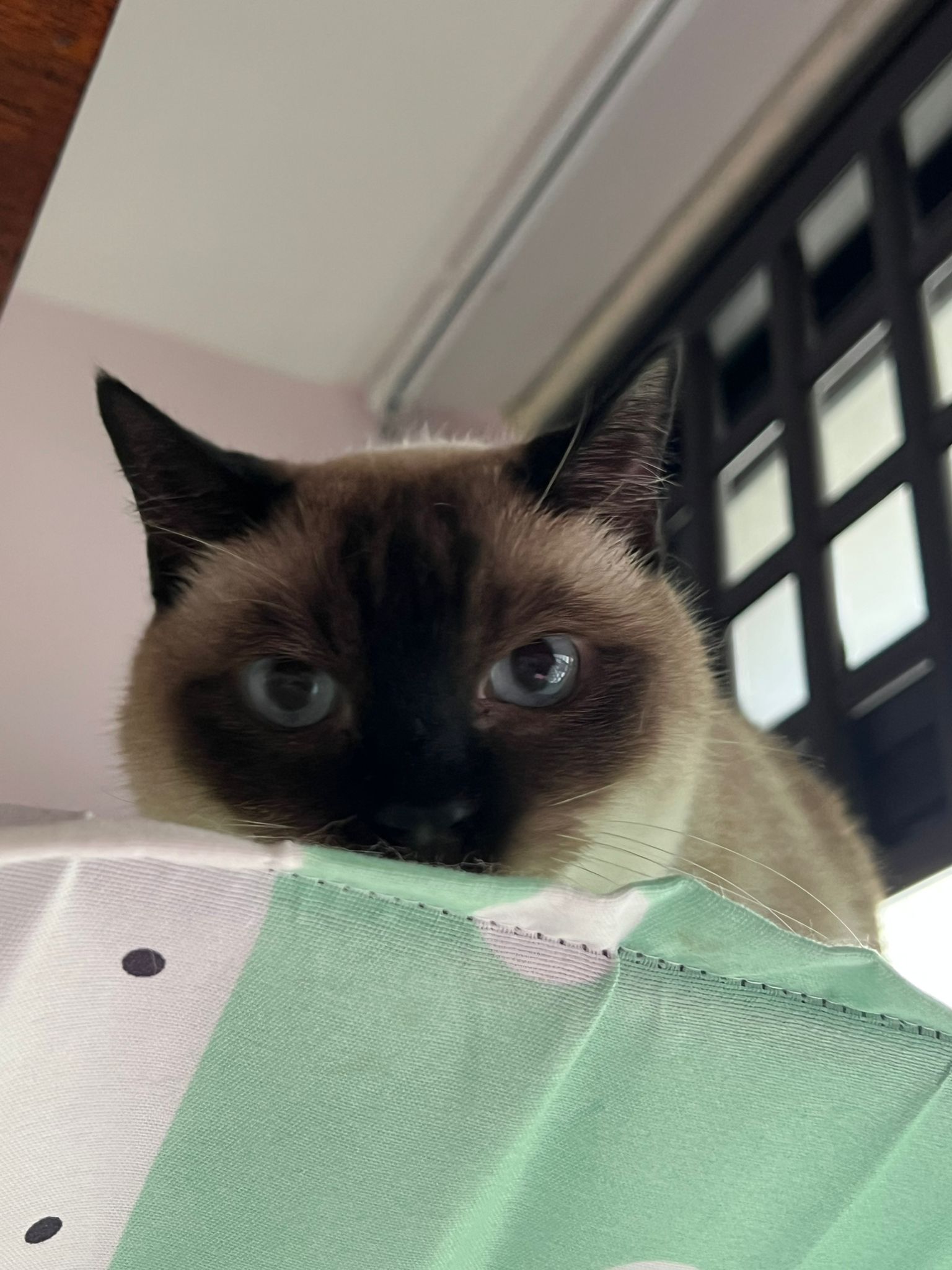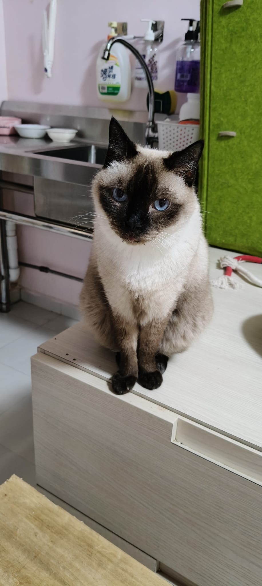 Morning; taotao like to stick to me. Ha today change necklace. The xmas one throw away, change to new year collar. and she kpo when the handyman help us change the water filter sensor.