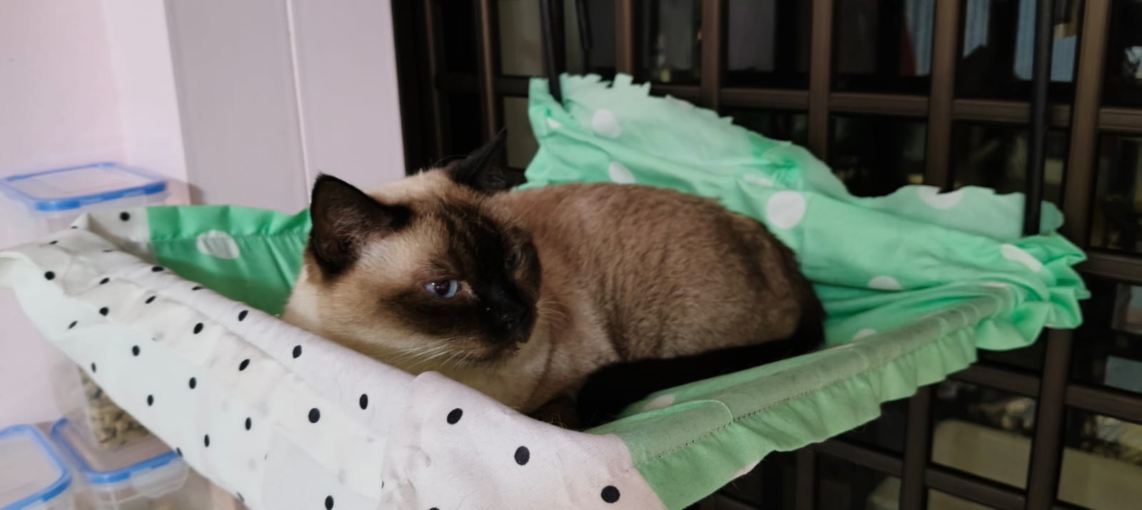 Today grooming day. But didn’t have her chance. She just laZe ard on the hammock and reappear for snack. Next round then let her bath.