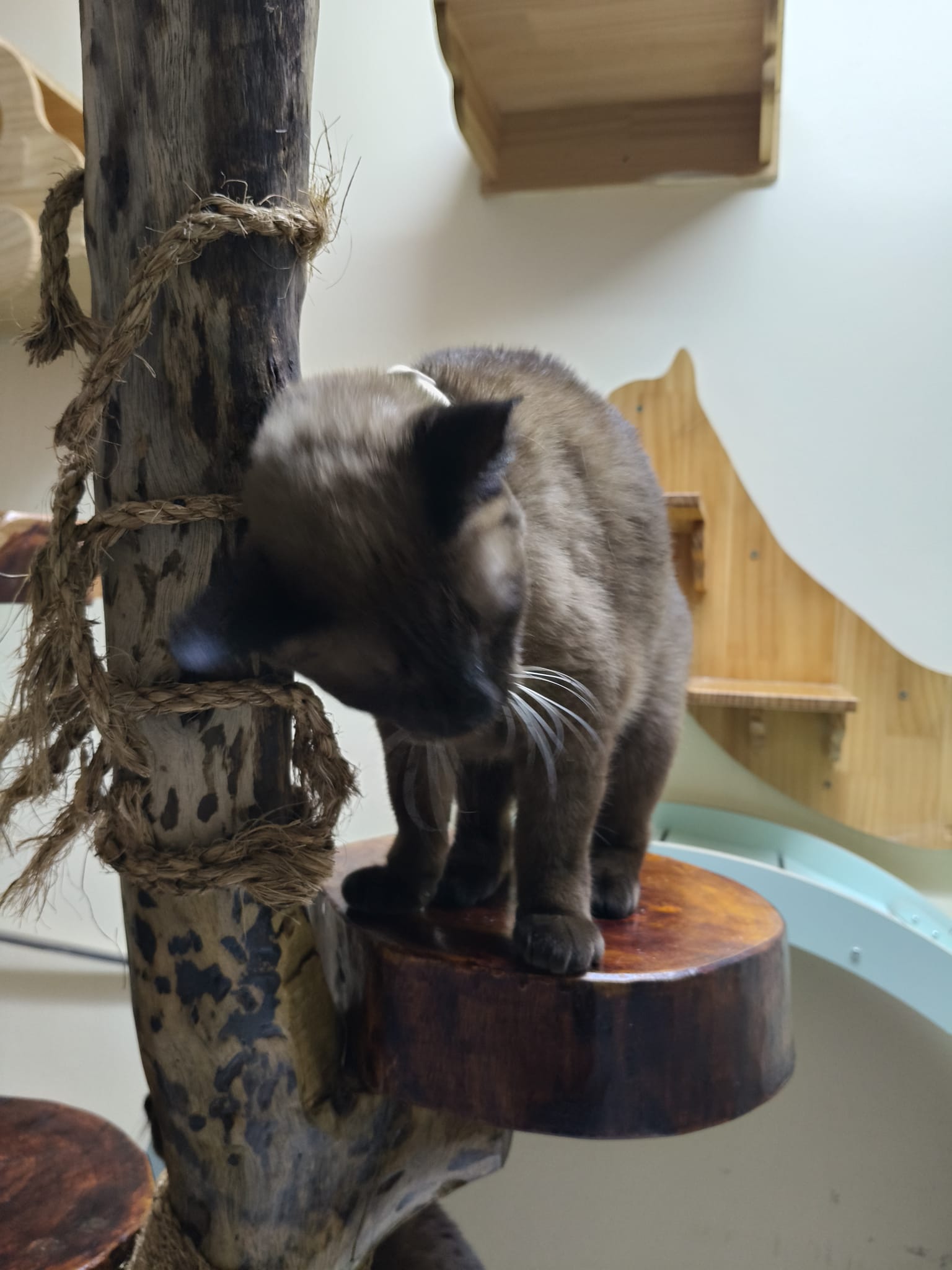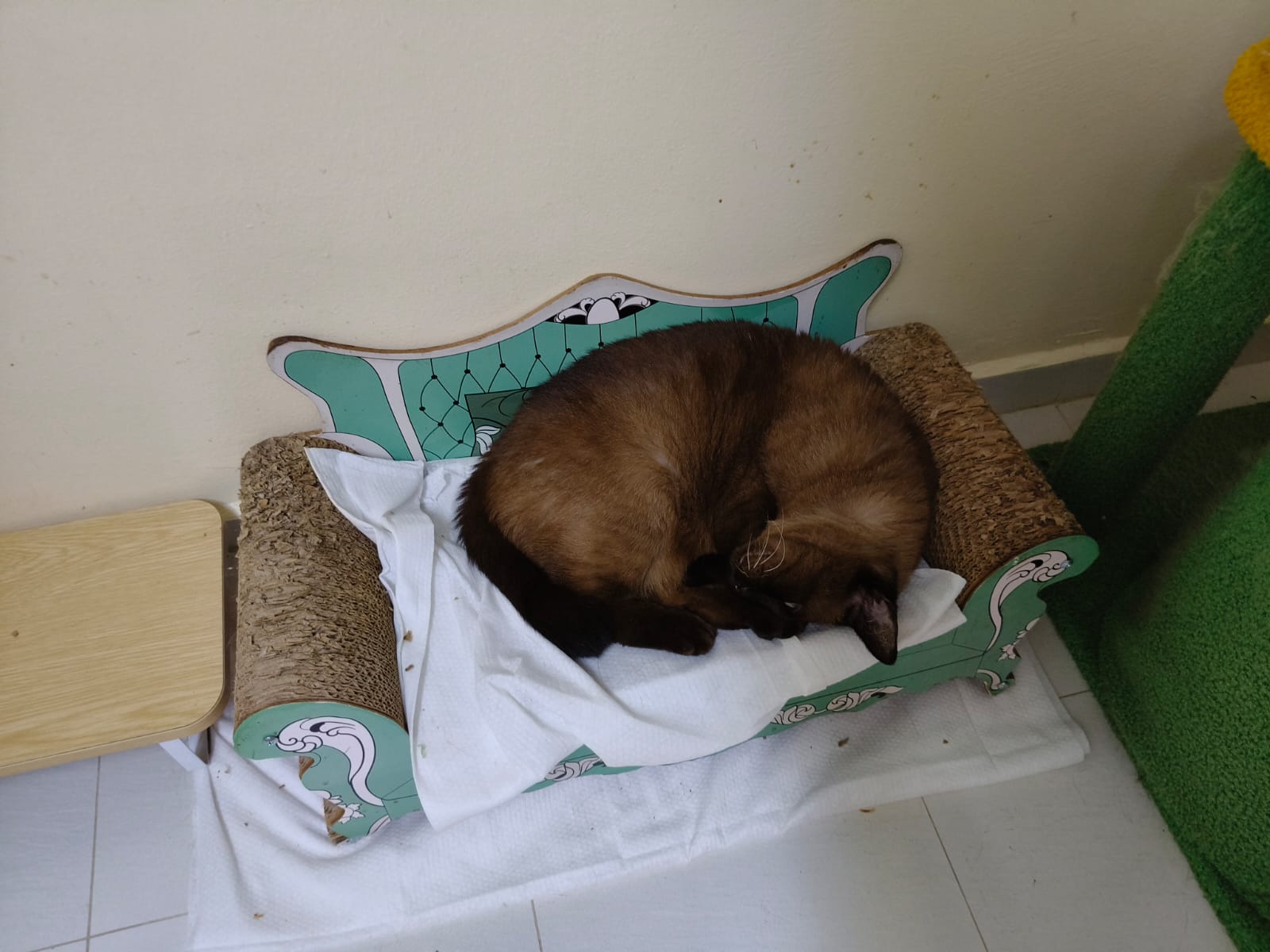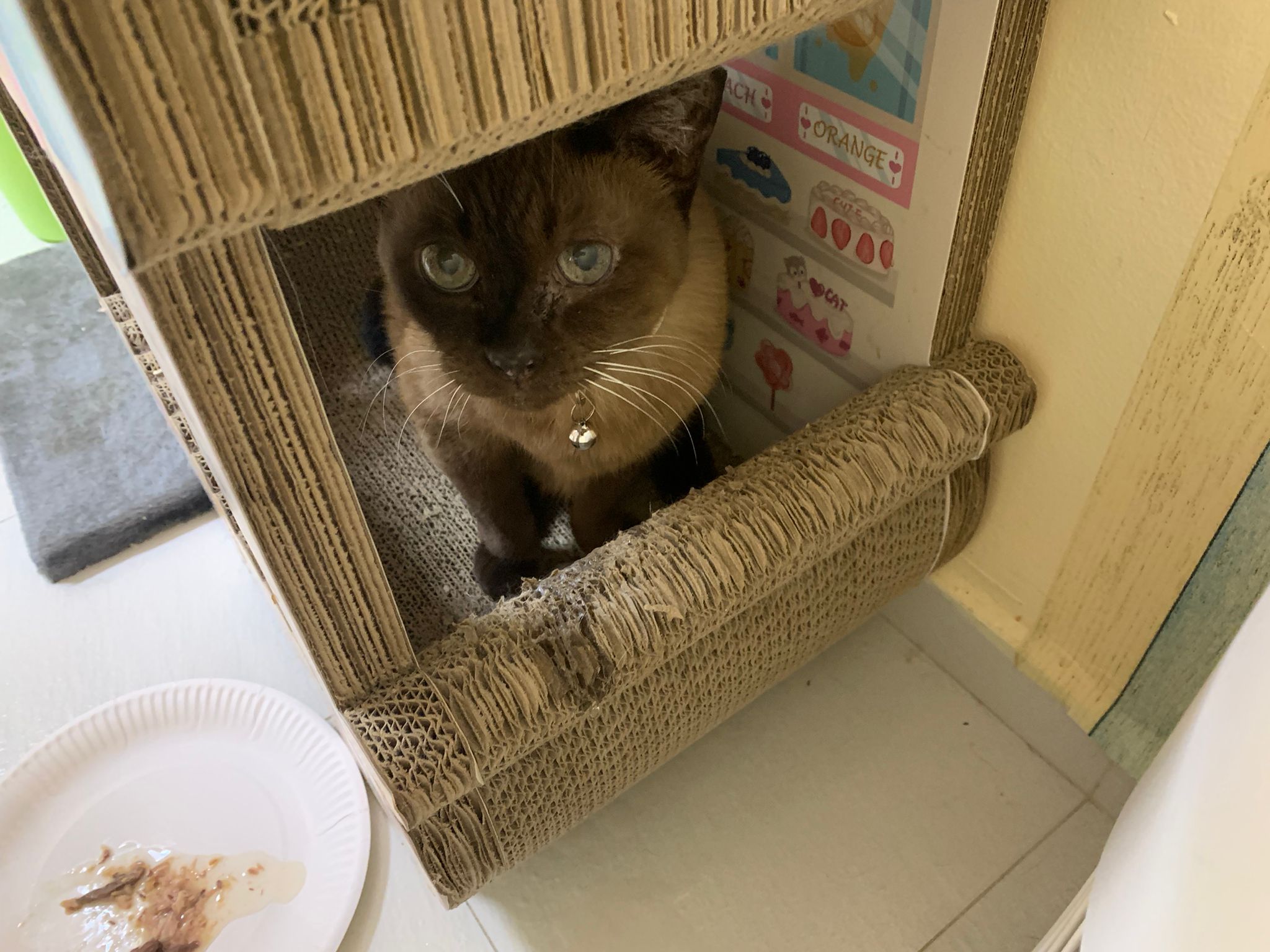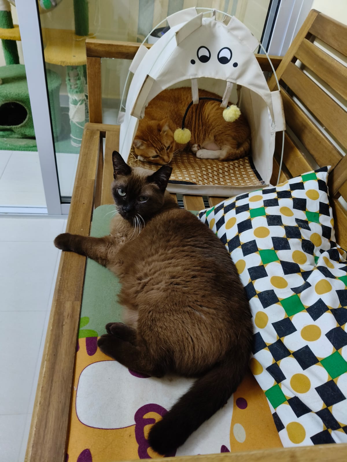 Morning: quarantined tgt w Princess sweetheart, char, rena and mama Mimi in new room for the installation of aircon, cos she is always in the cat tree. Throughout the whole morning Iâm there, she didnât come out, also didnât see her eat.