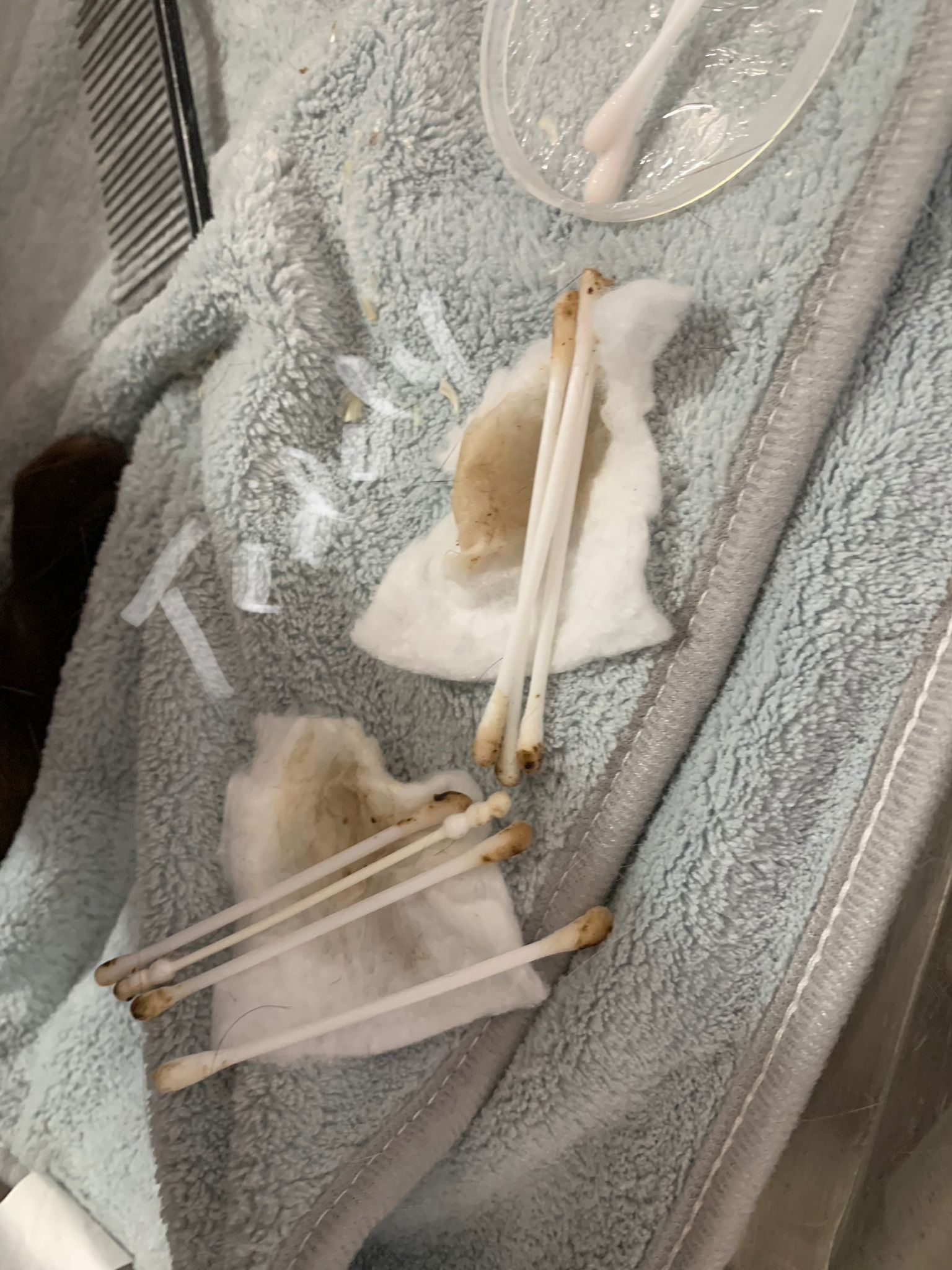 Morning: today basic grooming. Cut nails and clean ears and comb fur.
