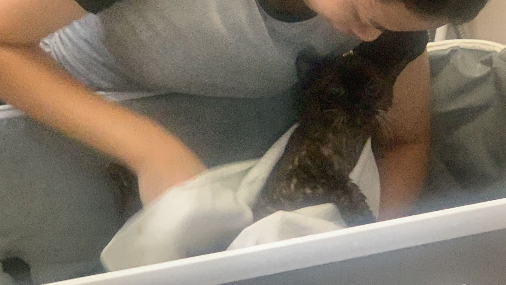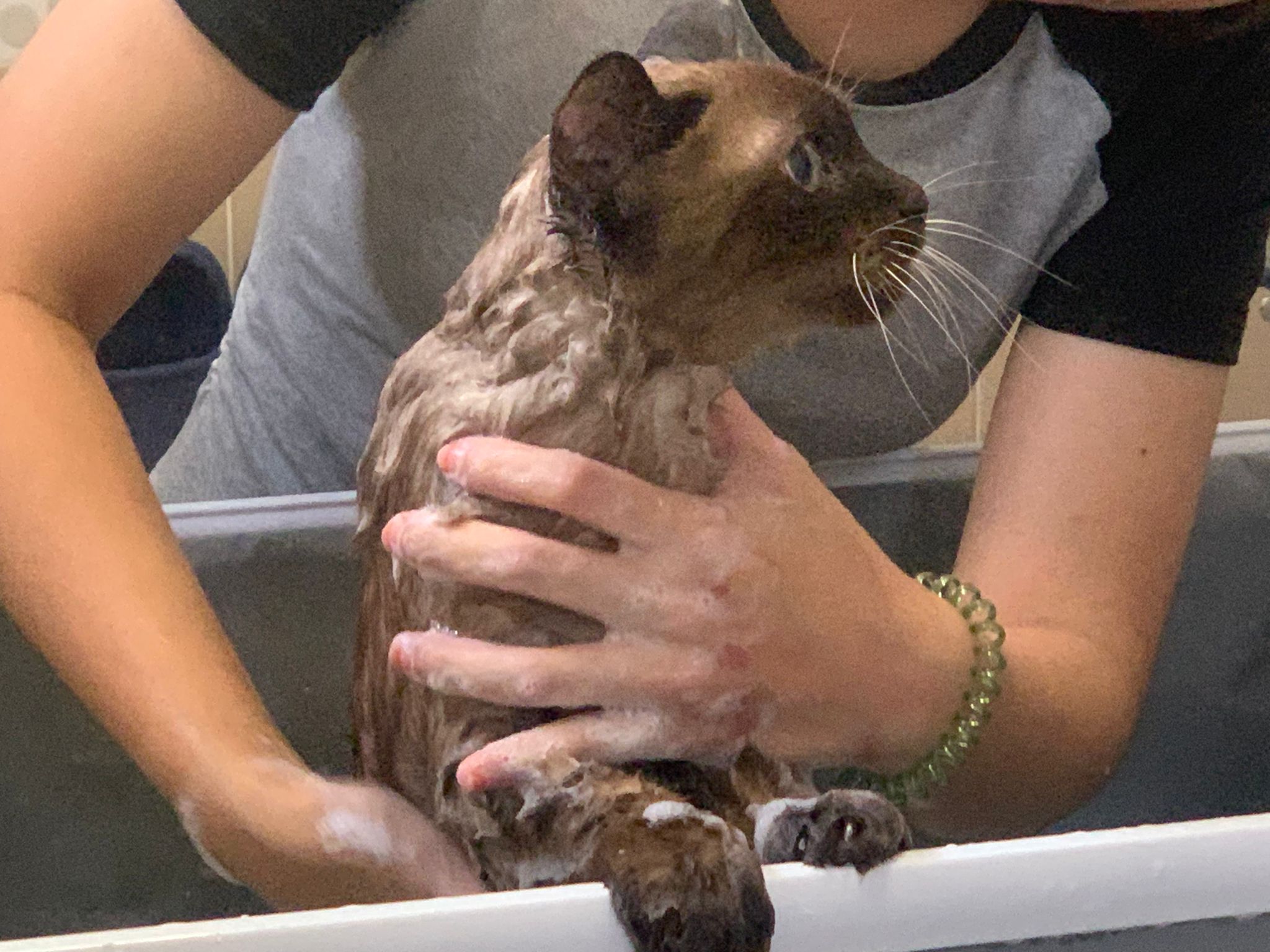 Morning: bath her today. I comb her twice, her tail v wet still. I leave her to dry in machine n told jo to just release her when she leave, cos I bring bai bai mama to vet.
