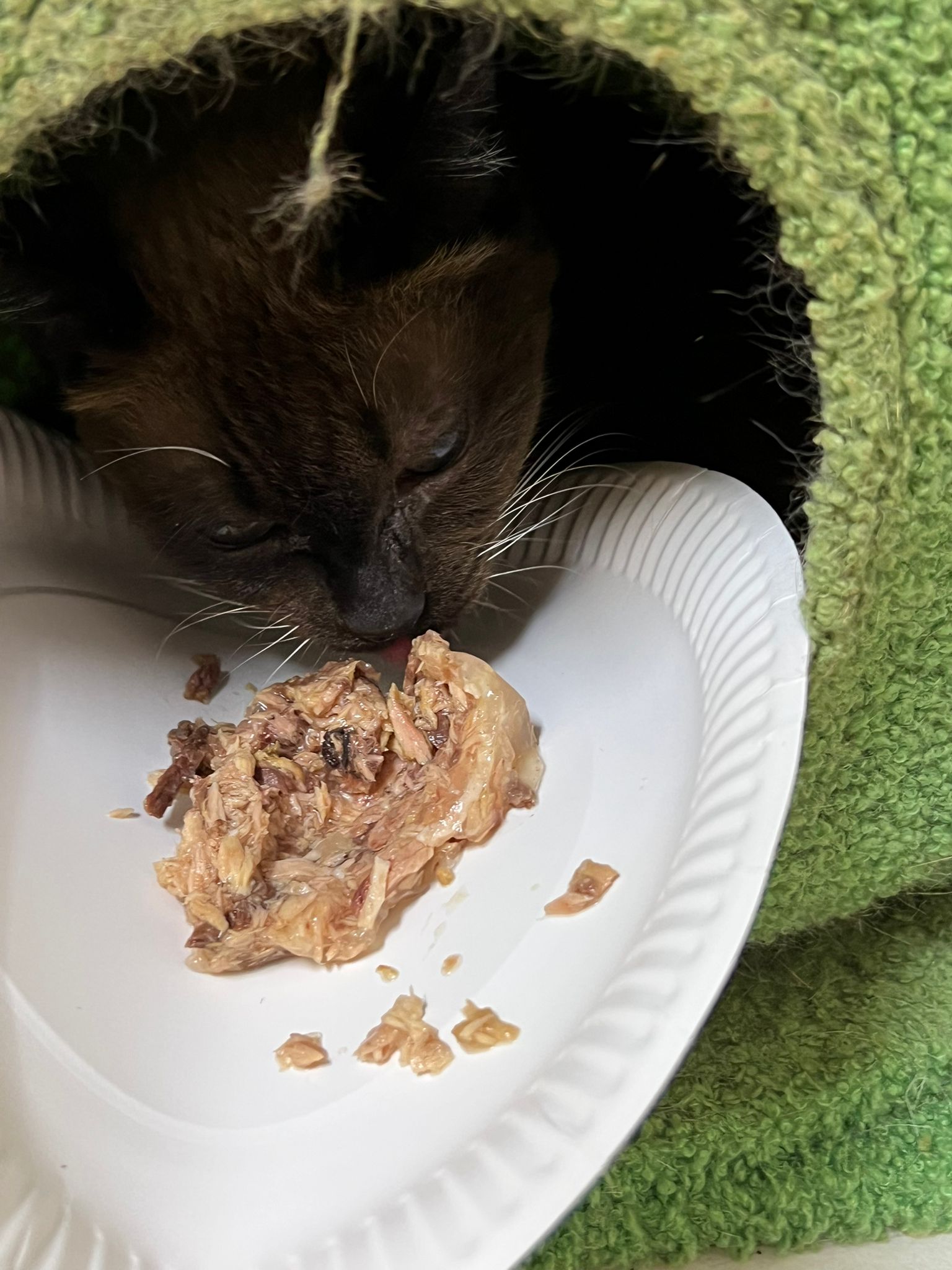920am: serve breakfast w Tuna w chicken + new food loveabowl chicken w salmon for skin coat – she got eat finish and continue w usual food