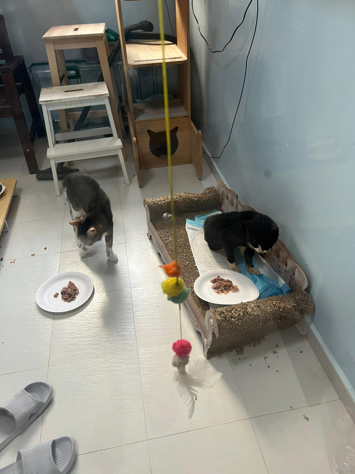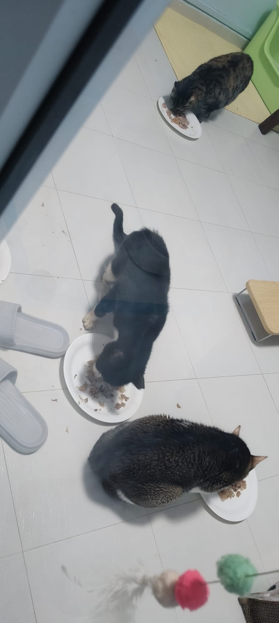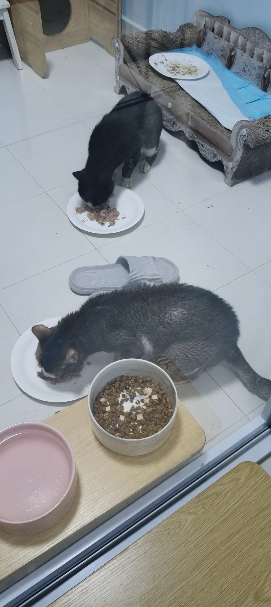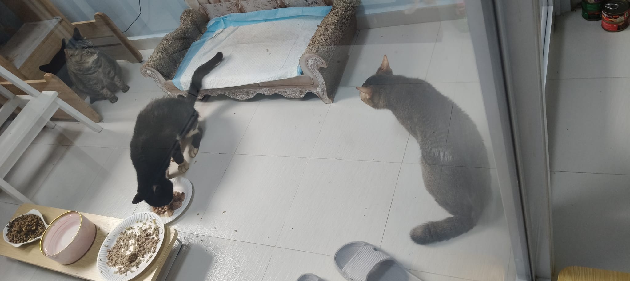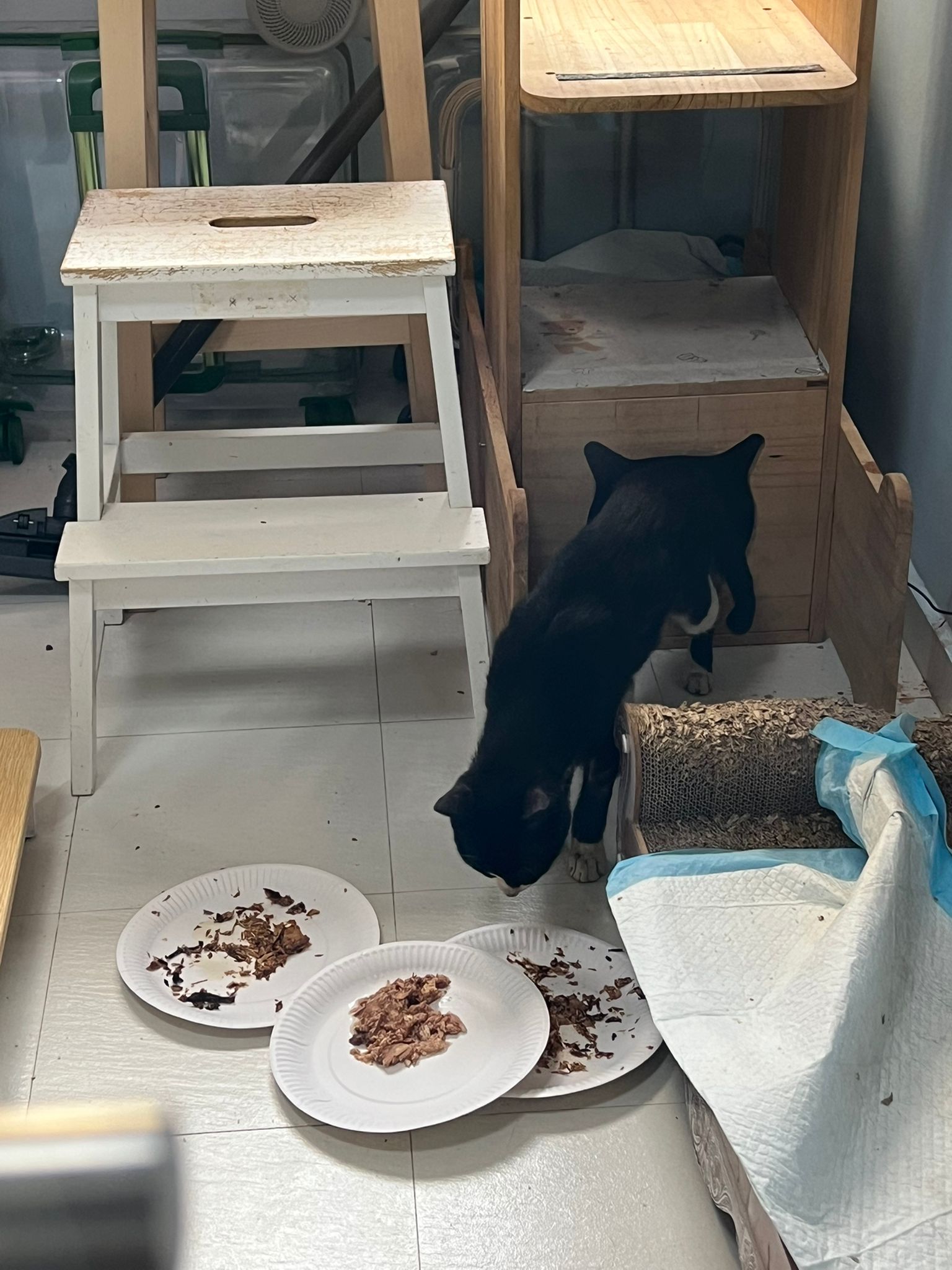 Reach 猫房 and he hiss at bai bai mama after she hiss at him. Remind them their relationship. Serve food I did touch him. No eat for both. Mama alr eat b4 I move her to iso room to join toy. Lights out. Let him settle down. 4.65kg, fur not nice. So far didn’t show aggression.