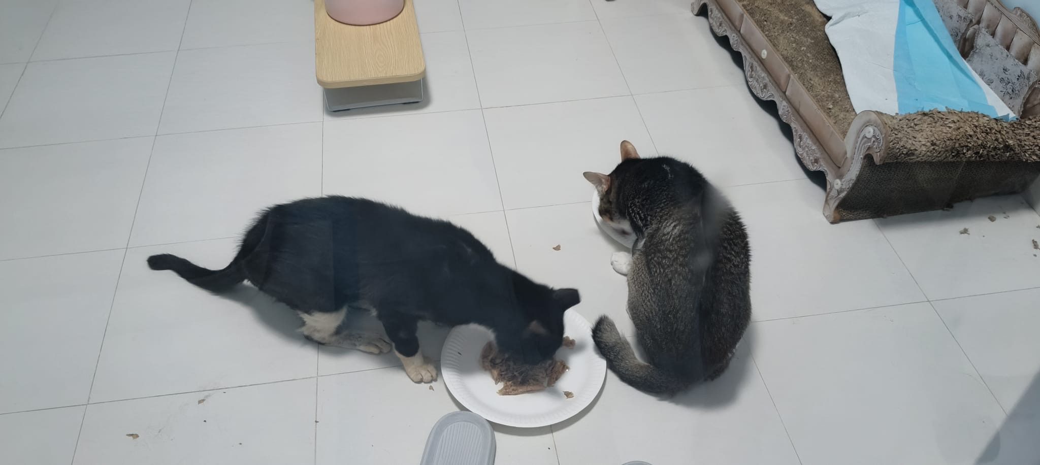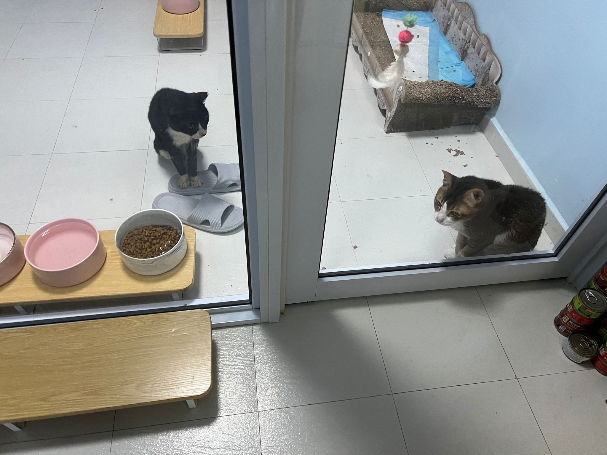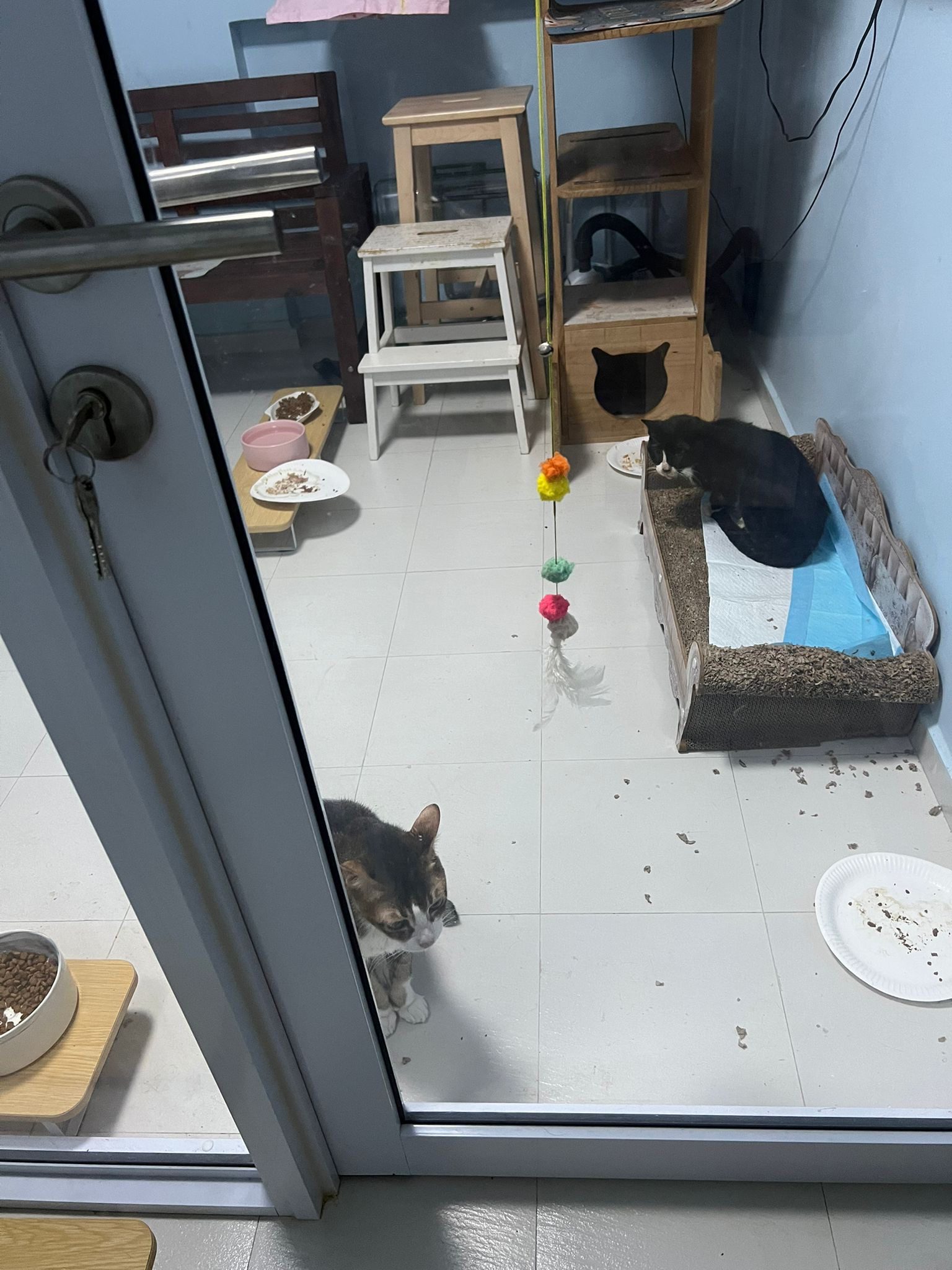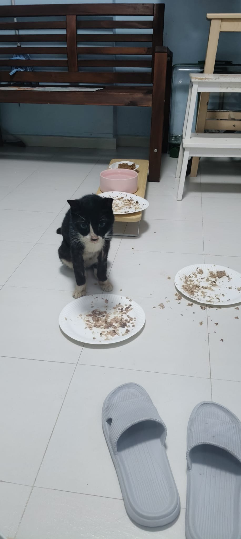 Reach 猫房 and he hiss at bai bai mama after she hiss at him. Remind them their relationship. Serve food I did touch him. No eat for both. Mama alr eat b4 I move her to iso room to join toy. Lights out. Let him settle down. 4.65kg, fur not nice. So far didn’t show aggression.