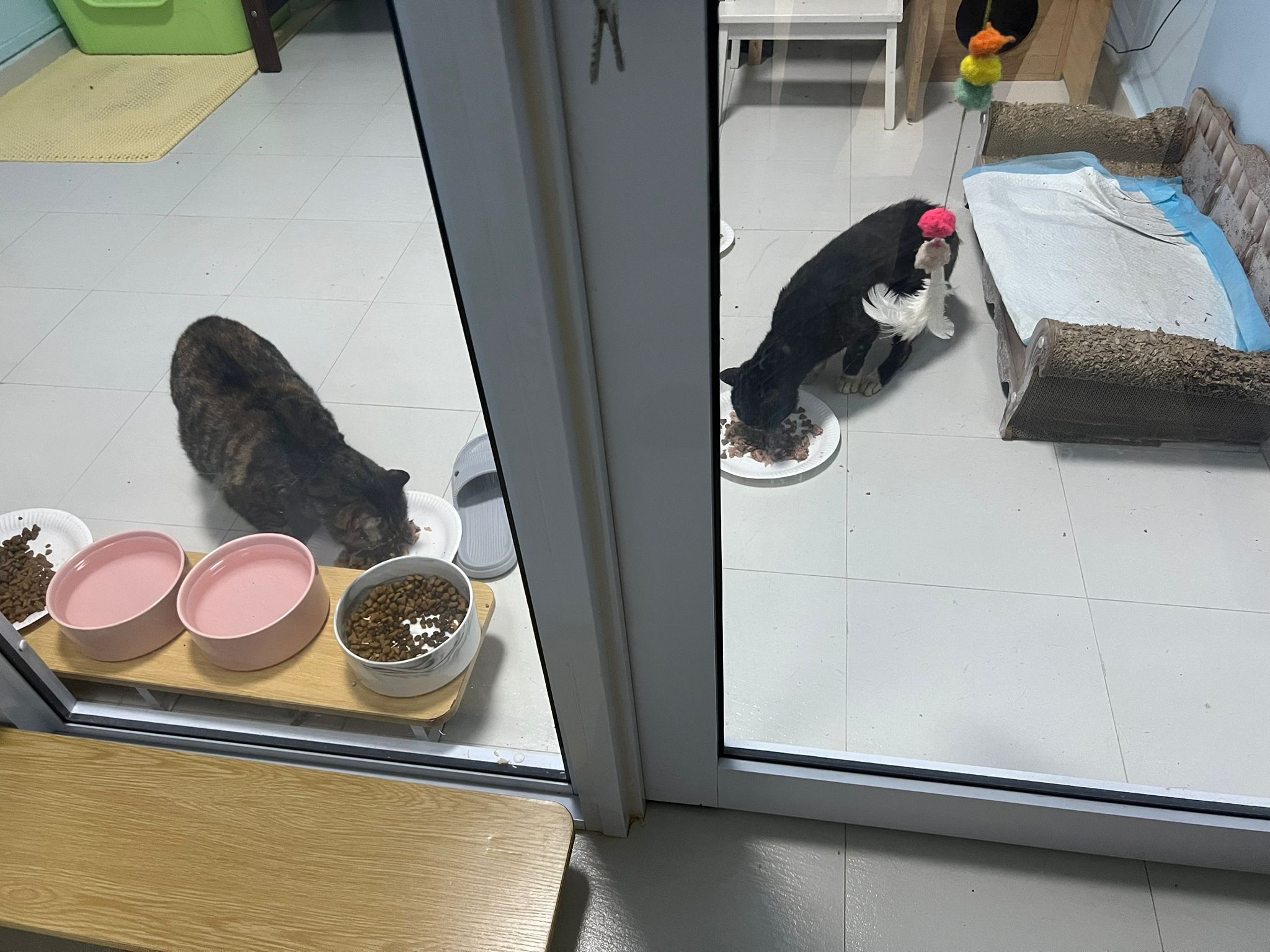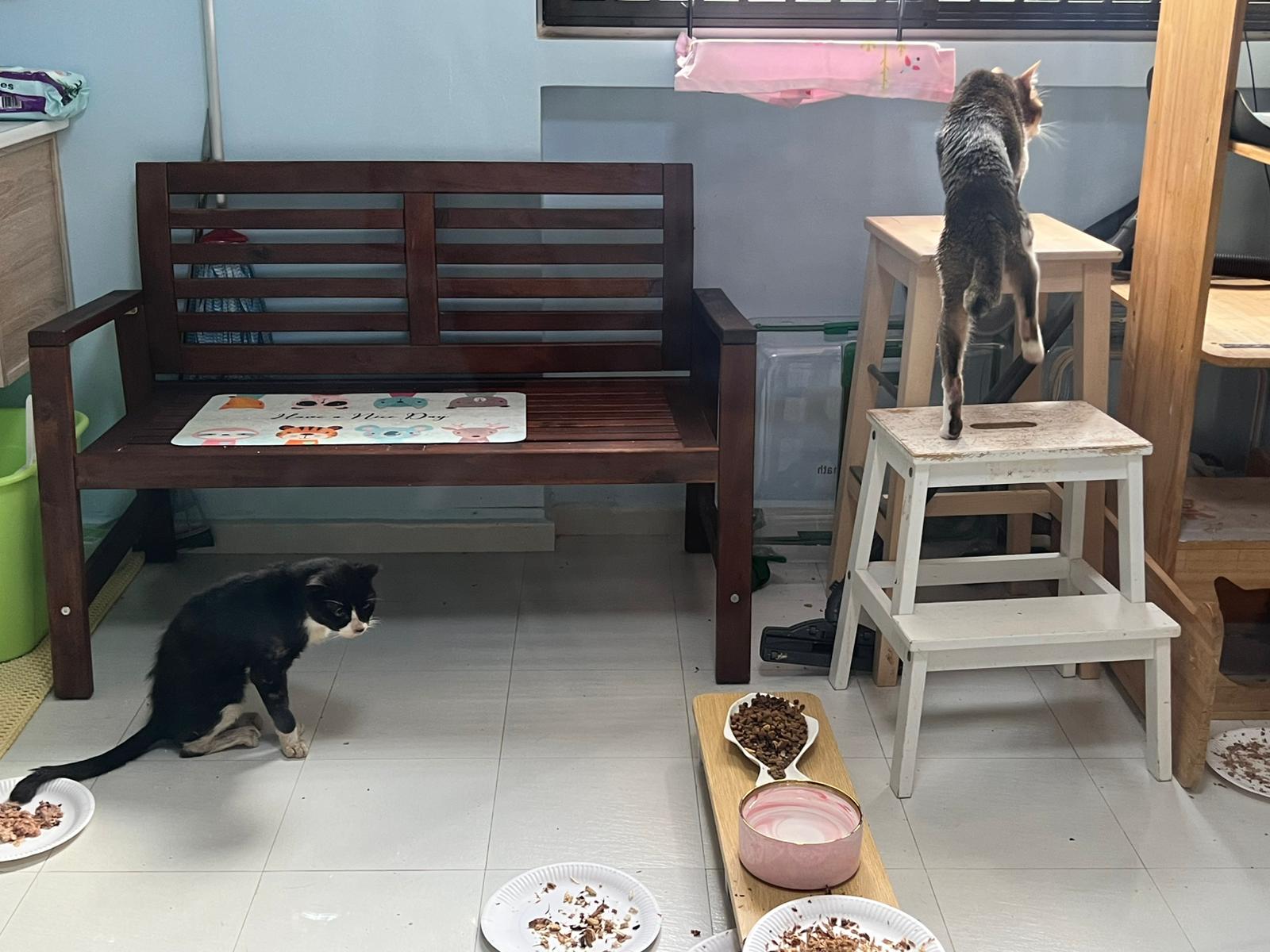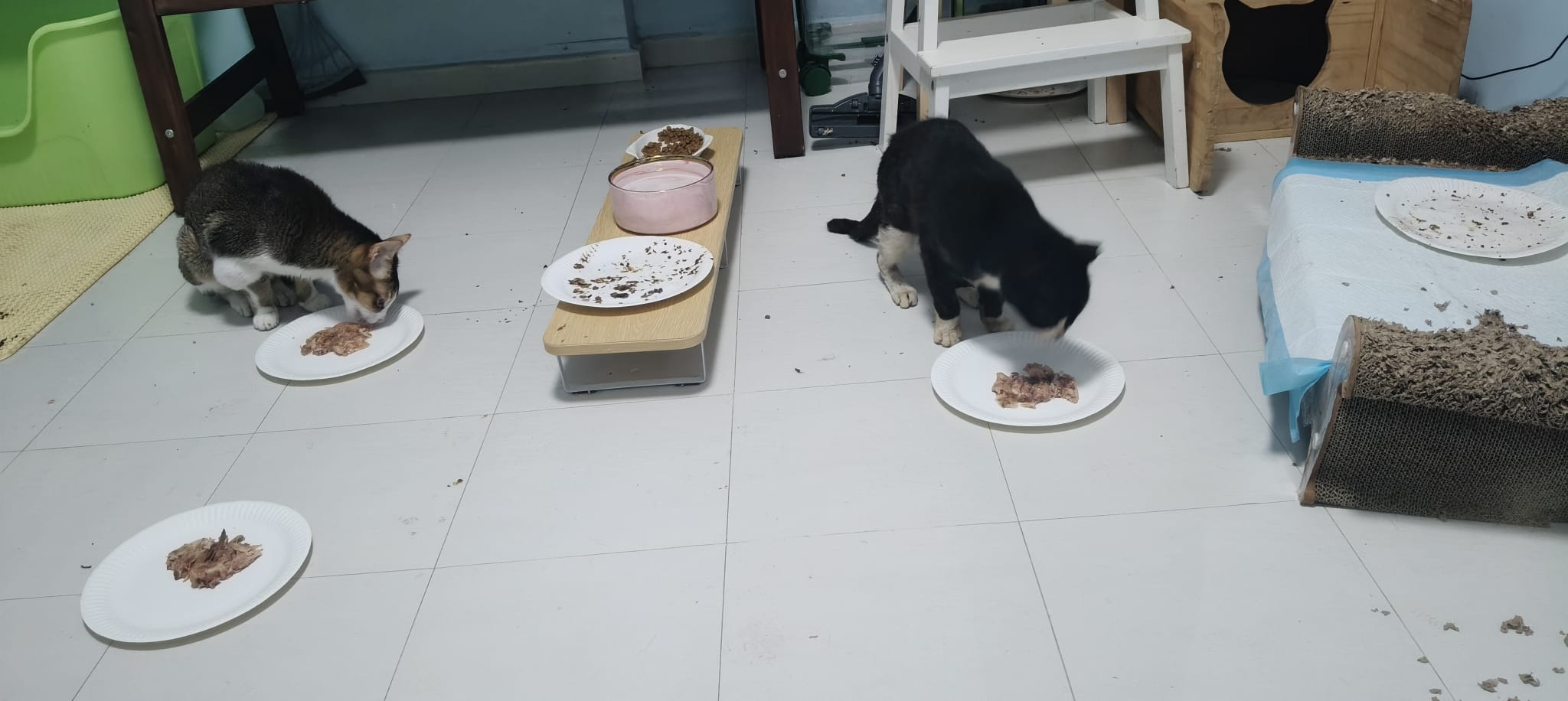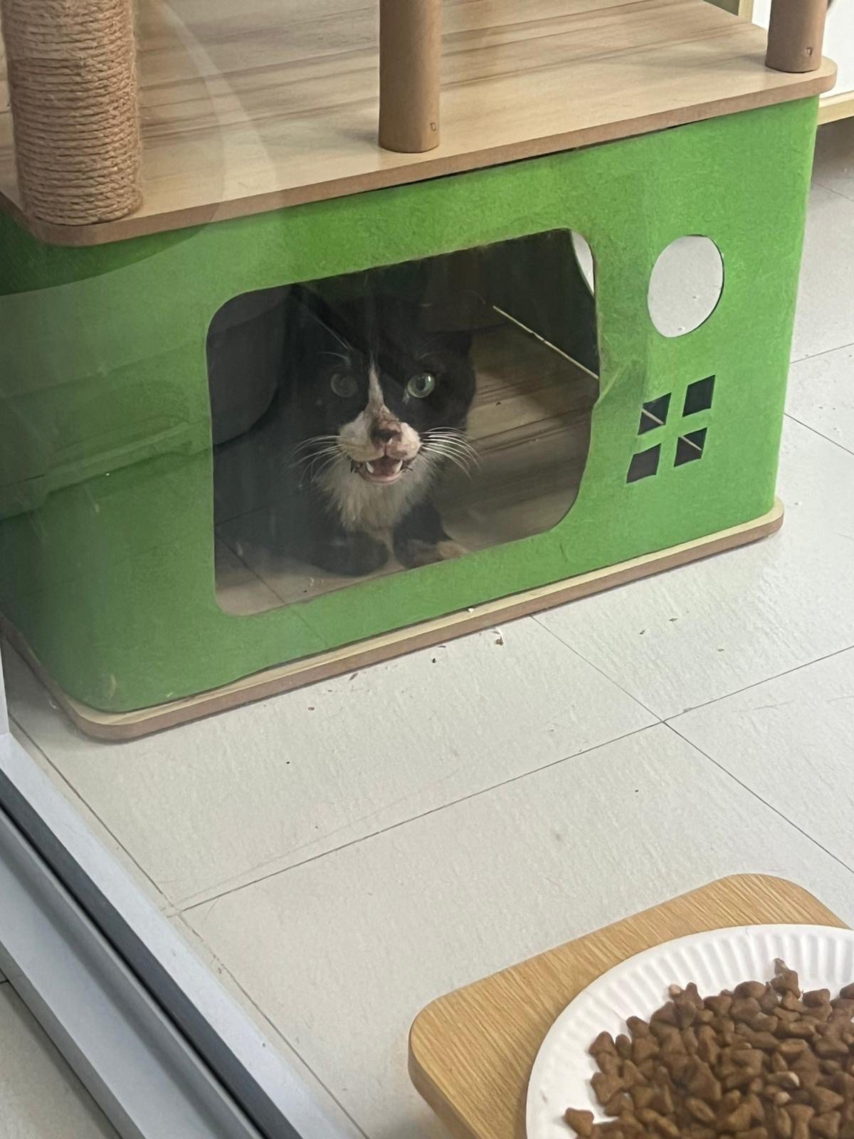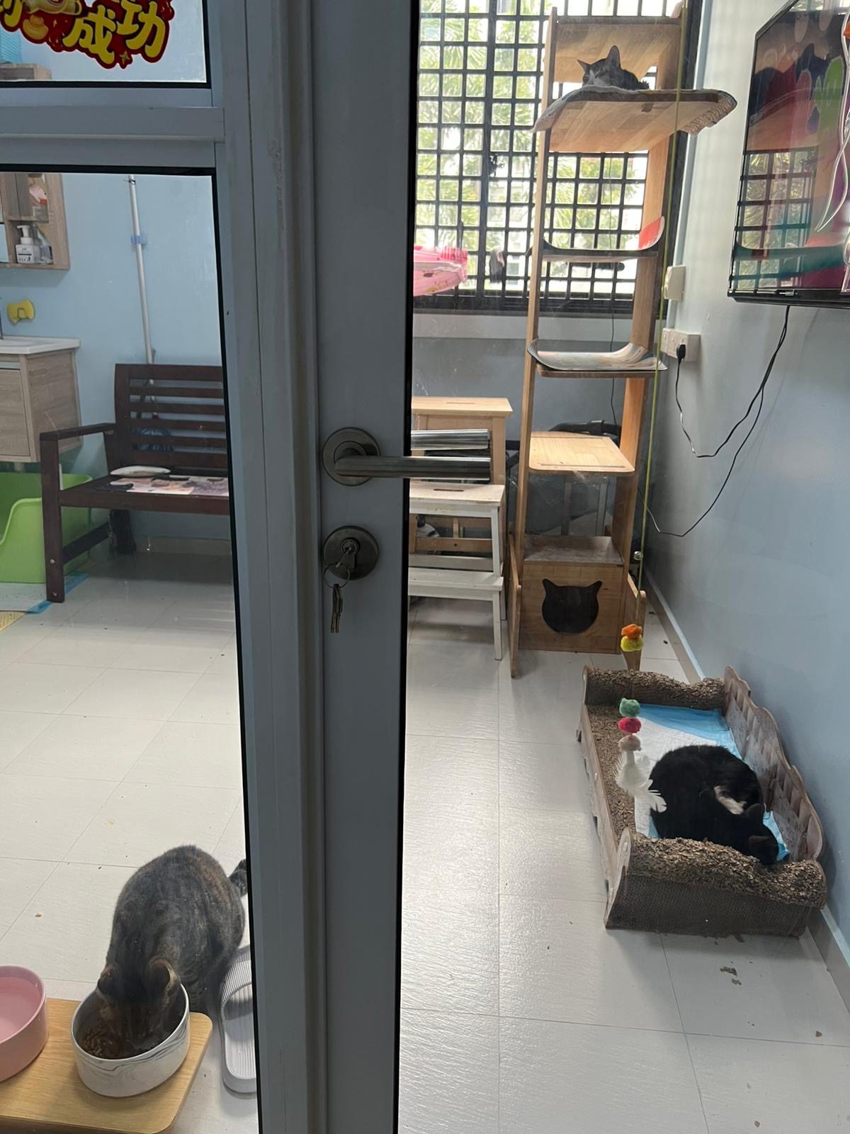 Reach 猫房 and he hiss at bai bai mama after she hiss at him. Remind them their relationship. Serve food I did touch him. No eat for both. Mama alr eat b4 I move her to iso room to join toy. Lights out. Let him settle down. 4.65kg, fur not nice. So far didn’t show aggression.