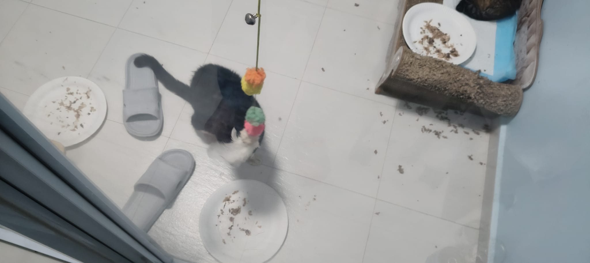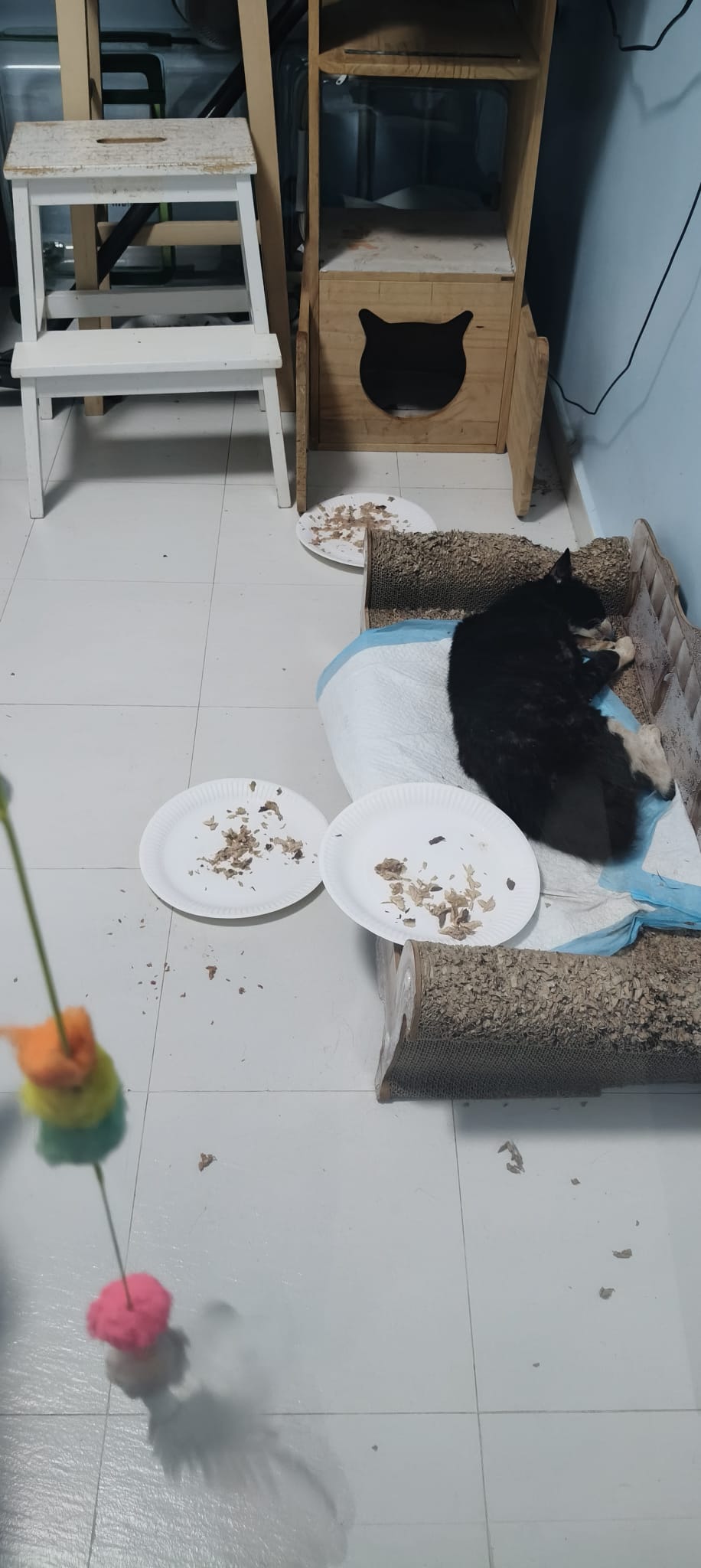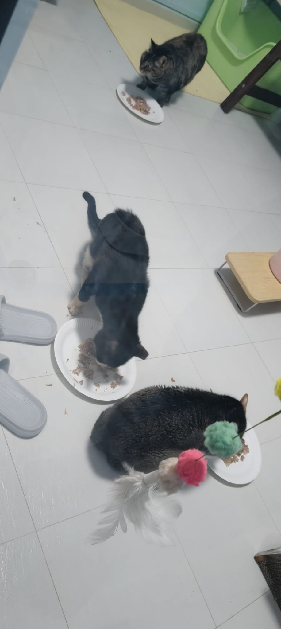 9Am: mmm:”Baibai hissing at toy toy whole night. Both didn’t eat. Baibai peed on floor” – then she say didn’t eat new food. Erm later I check but why bai will pee on floor? She know how to use bin. Must be toy on the bin maybe