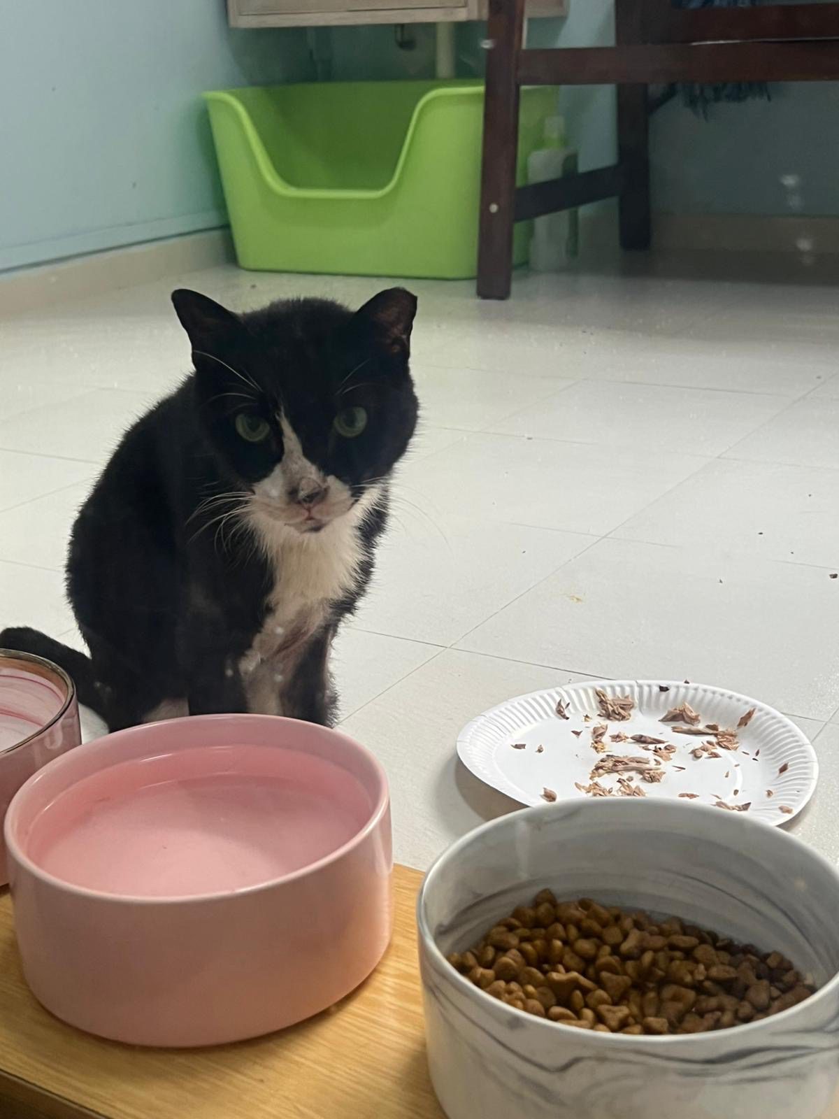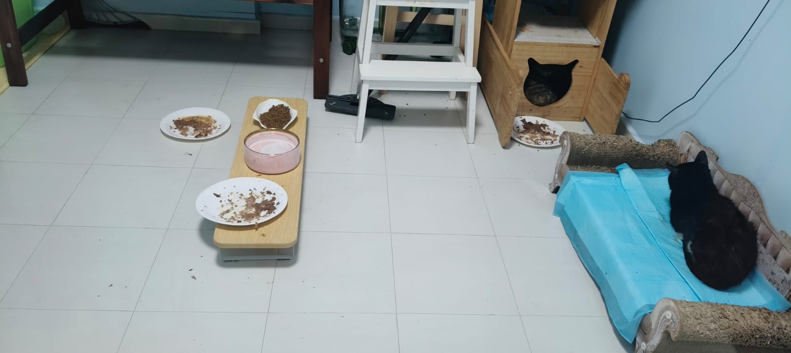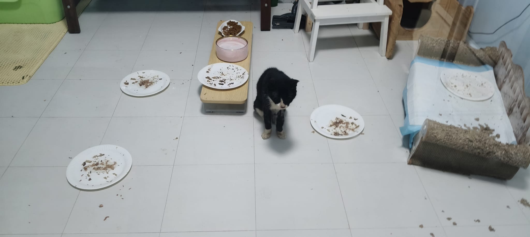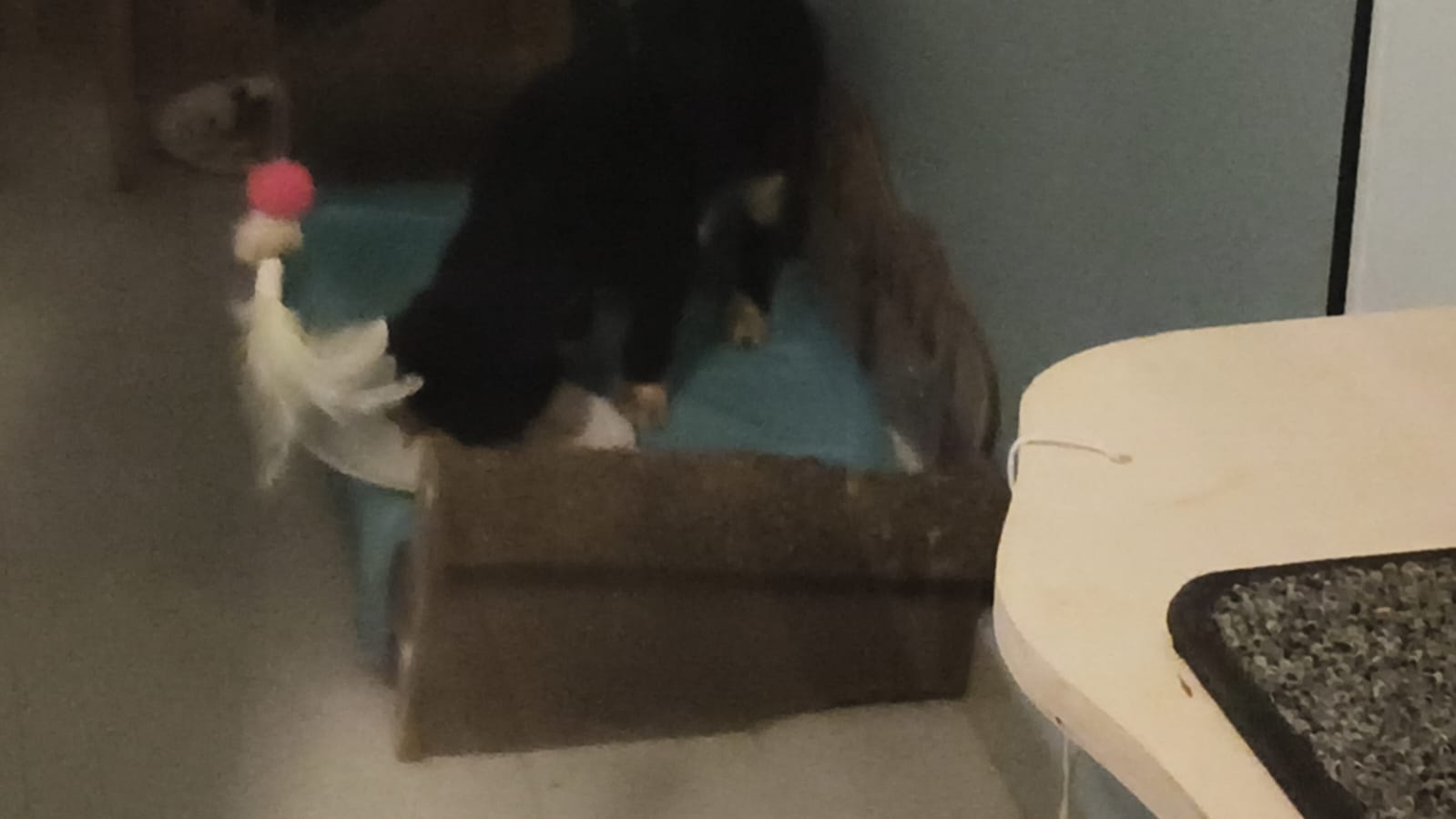 9Am: mmm:”Baibai hissing at toy toy whole night. Both didn’t eat. Baibai peed on floor” – then she say didn’t eat new food. Erm later I check but why bai will pee on floor? She know how to use bin. Must be toy on the bin maybe