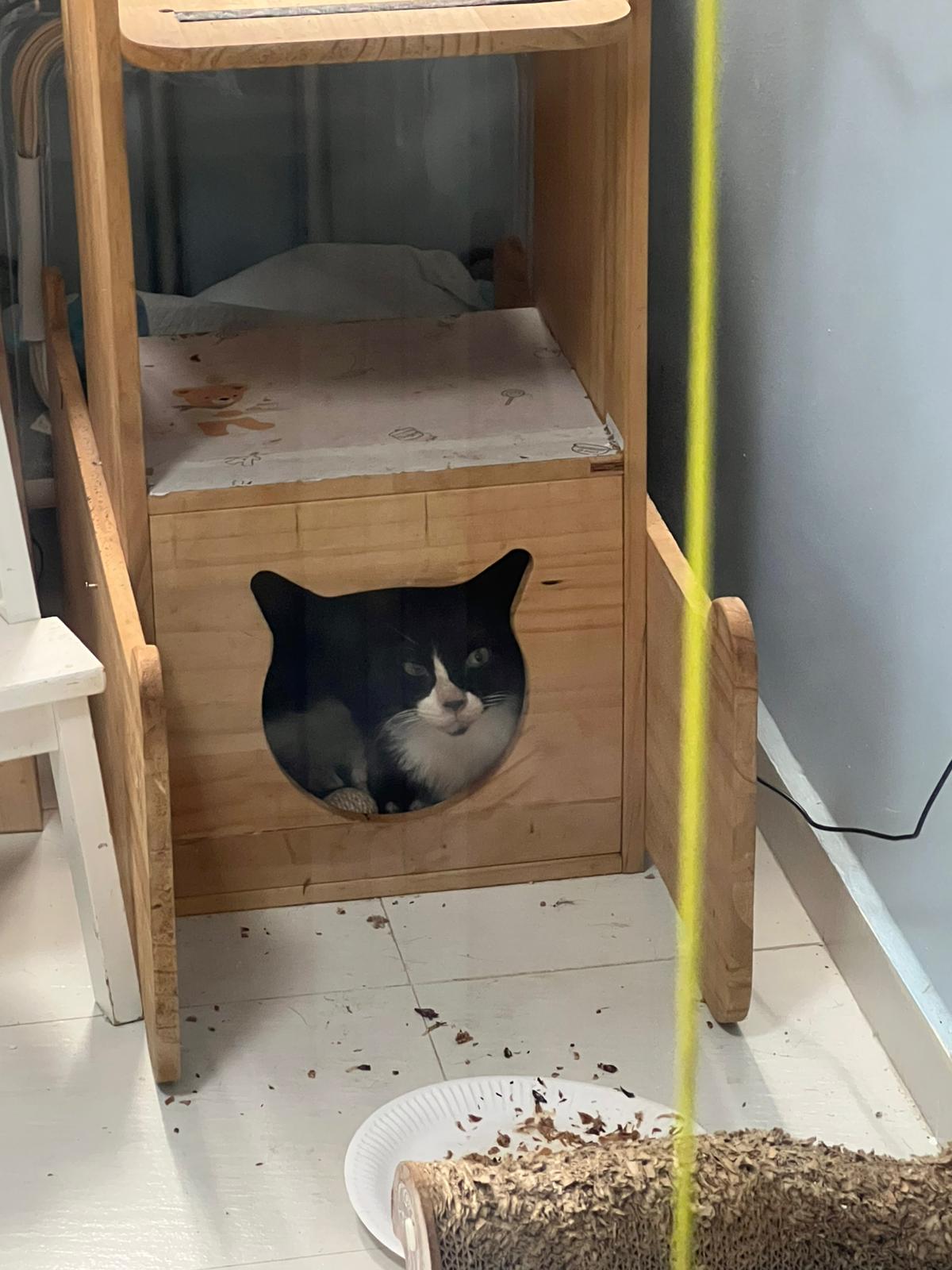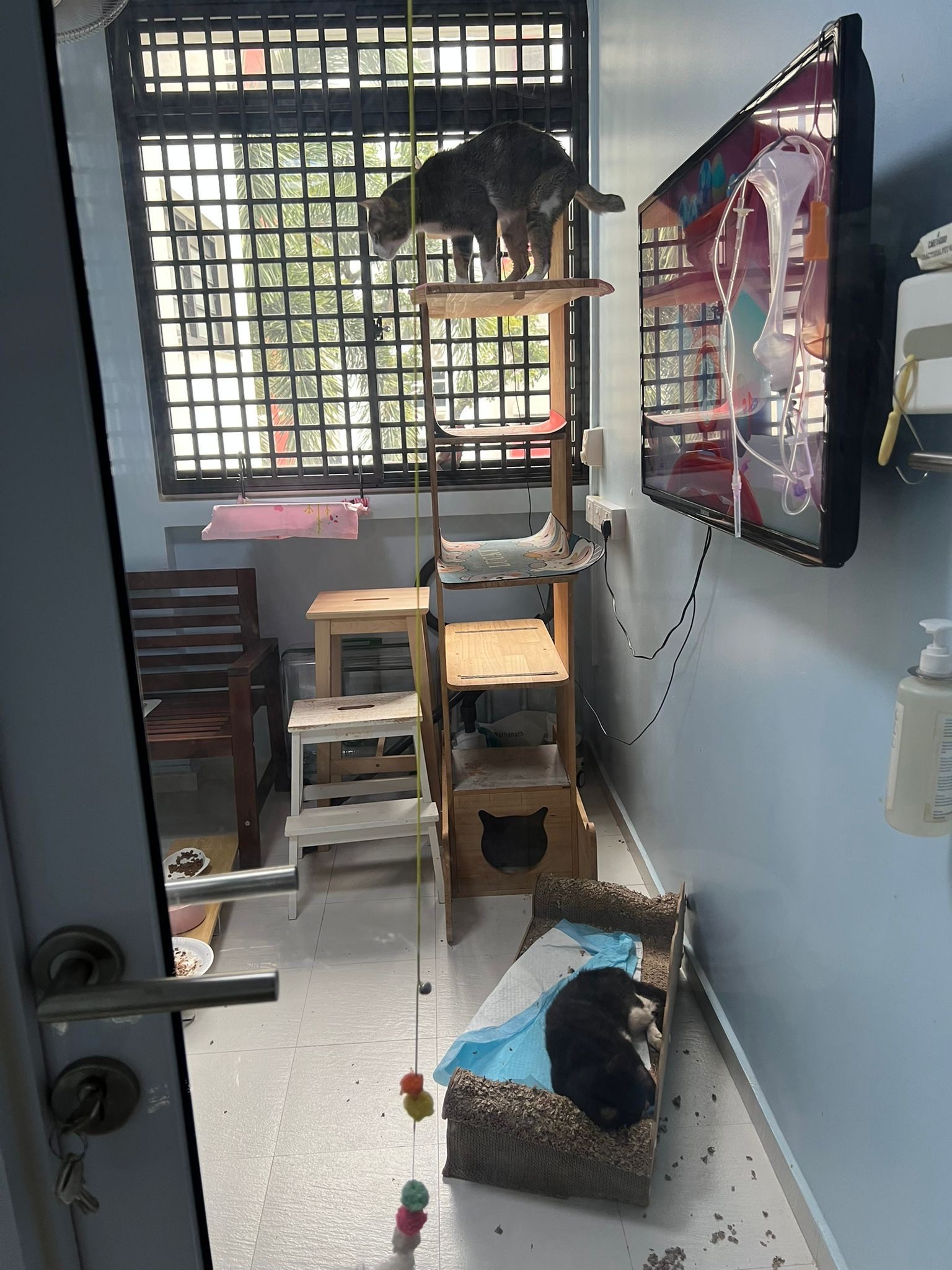 I move things one by one, and eventually he go into the cat tree and I shift the whole tree into the room. He officially move into Kerry room le. He got use frosty pearl. i throw away the big unicharm bin, see how. Hope all poo in frosty pearl. toy settle under the bench, maybe not used to aircon room.