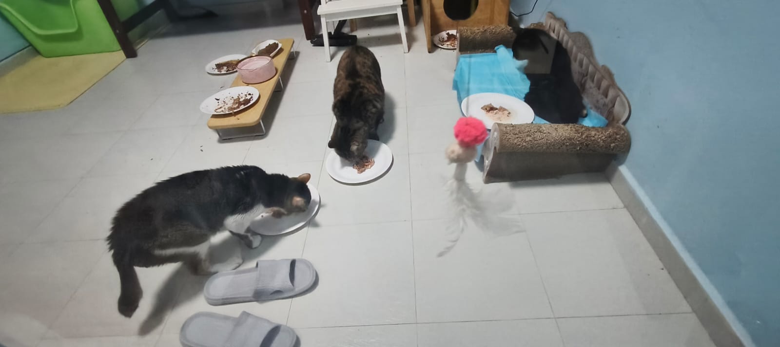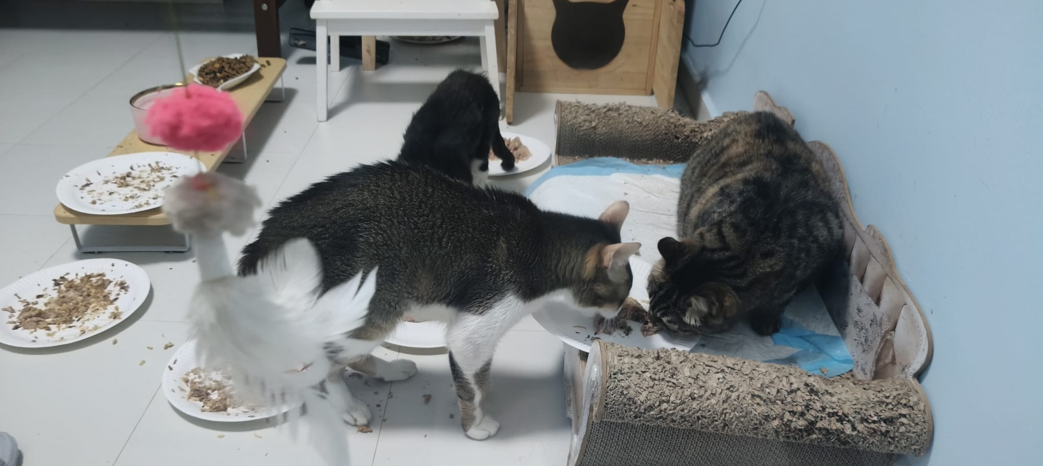 3.30pm+: I’m in and daring they all excited and wait at door, even toy is near the panel look out, happy want food too. Cos I need to finish char bday celebration then go in, Duno he sian or not. Or the flavours I serve: urinary, water and Aristocat, he touch a little and stop le. And generally i feel he bad temper, I can sense danger from him. He smack Kerry face. I put him on my leg to wipe his fur and clean only his right ear n it’s dangerous le. When he attack n smack he make the sound v fierce. Quite scary