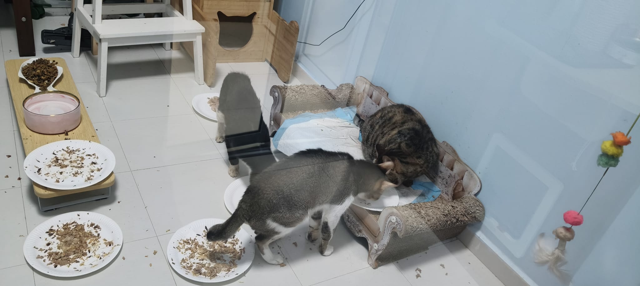 5.30pm: serve kakato tuna w chicken, he got eat a little and I start opening up the door and let daring and Kerry venture out. Daring came face to face w toy, toy keep growling and hissing n daring back off. I’m a little worried. He hiss at Kerry too. But generally he didn’t crazily pounce or still want to charge when they back off, or go off.