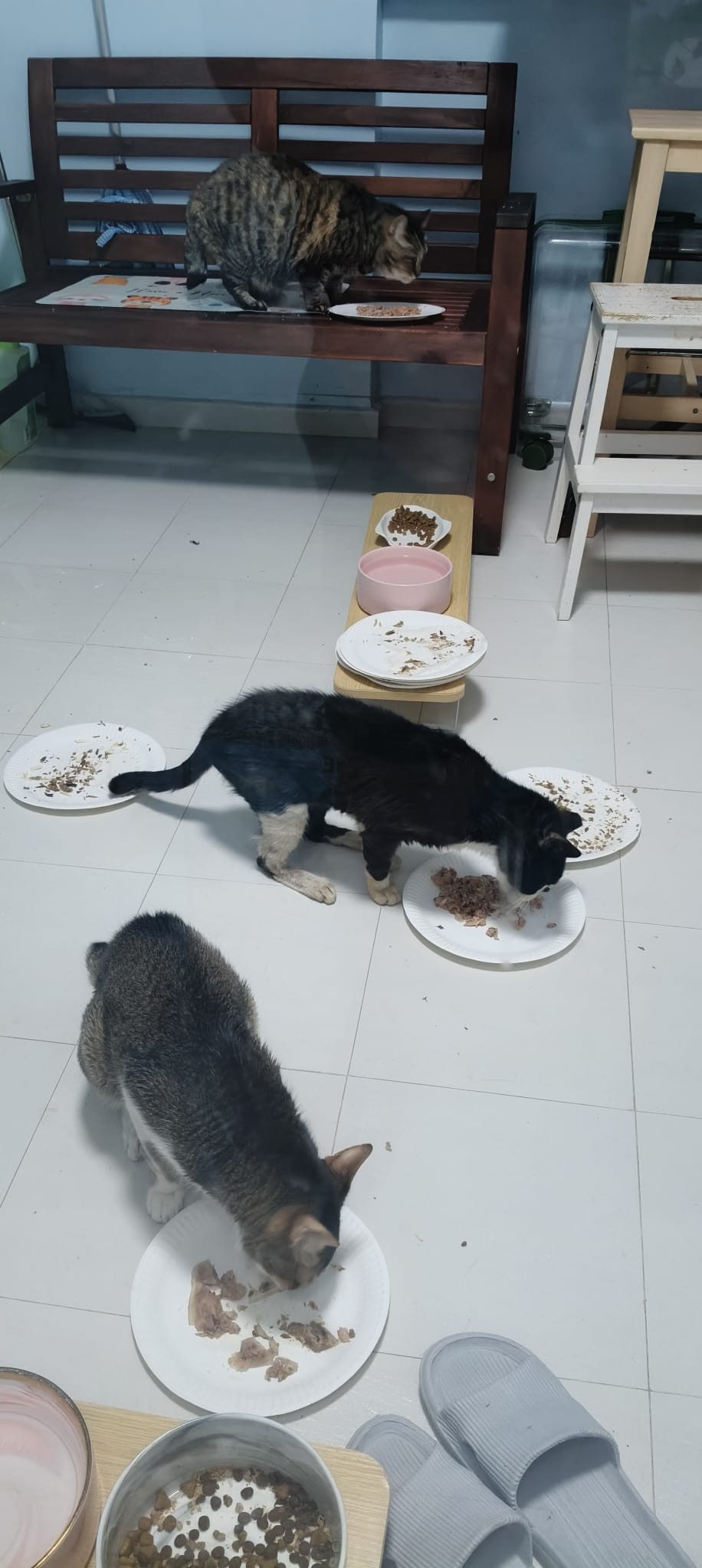 This is after another plate A 1/2 + 2/3 cans for toy toy. N plate B 1/2 + 1/3 for Kerry n Daring. Only Daring ate. Plates C are balance from Daring n toy toy dinner.