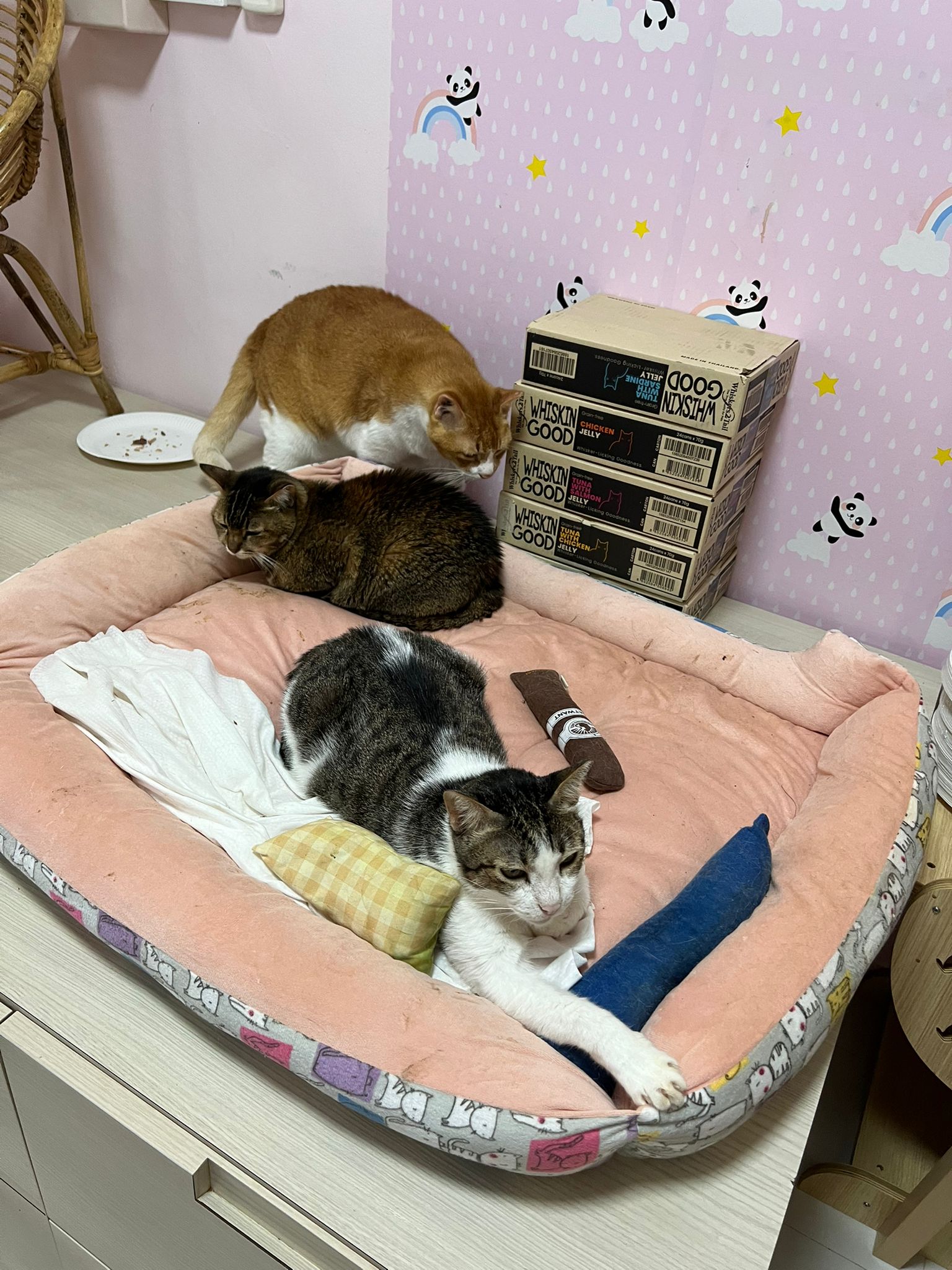 11.10am+: rena is back, n I bring her onto the bed, Jack, buddy sena is on it, so she can laze w them for a while. Kitty came to kiss rena, while I extract rena 10 years photos, last time Kitty and rena always in 2g kitchen food shelves š they r friends. told them Iām bringing rena back home to visit then go center prep her urn and party photos and labels.