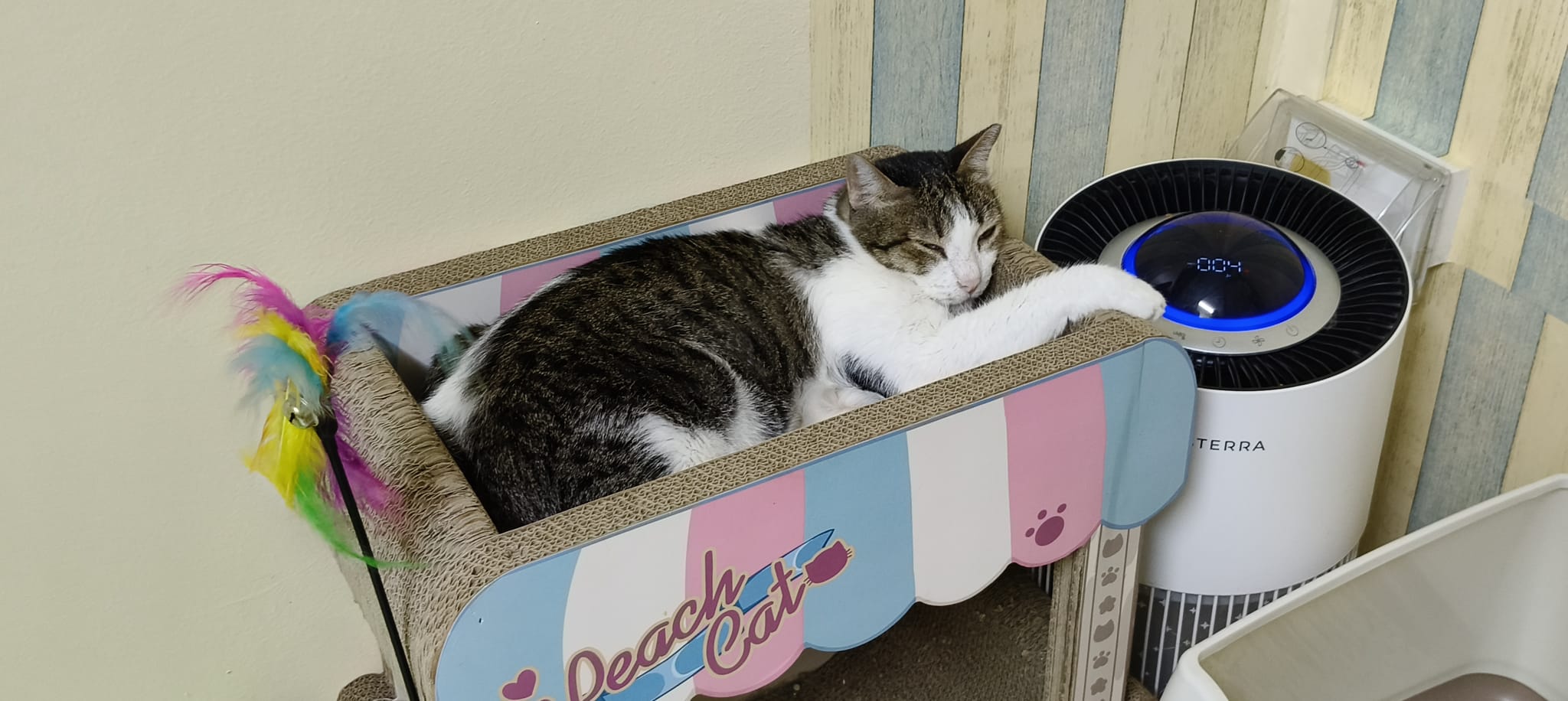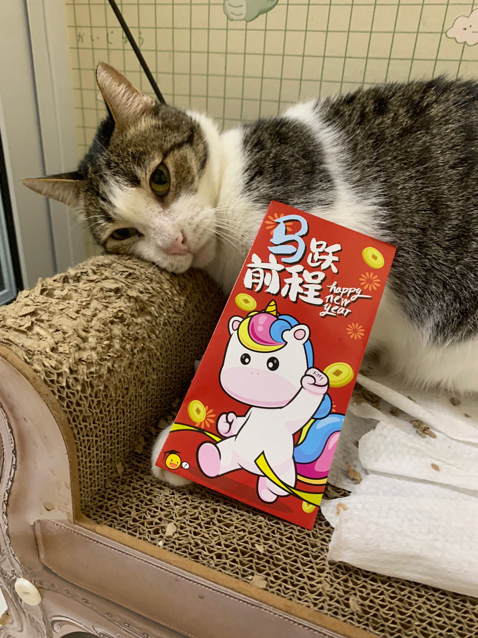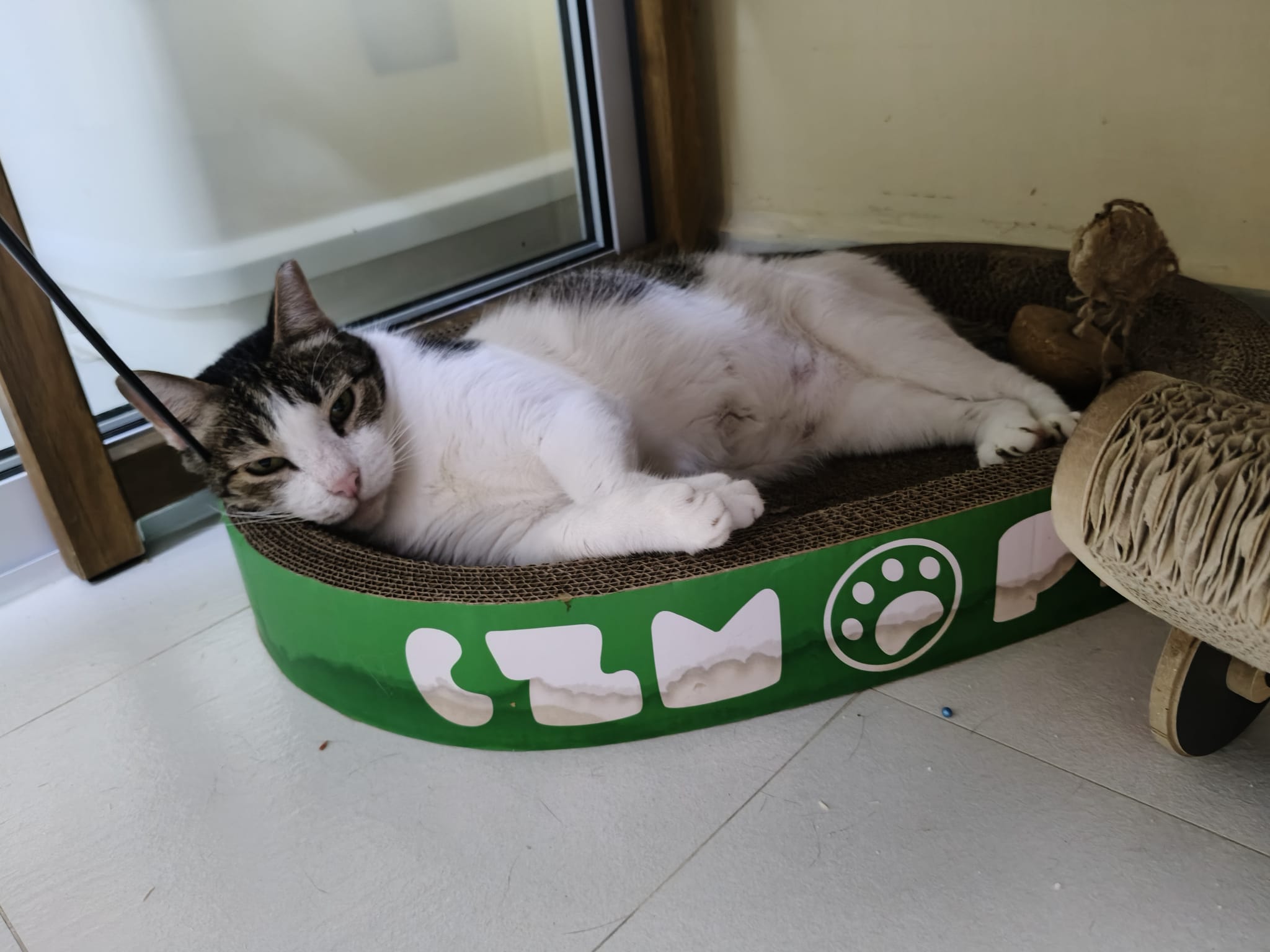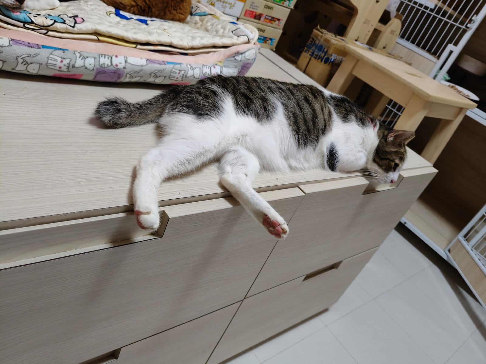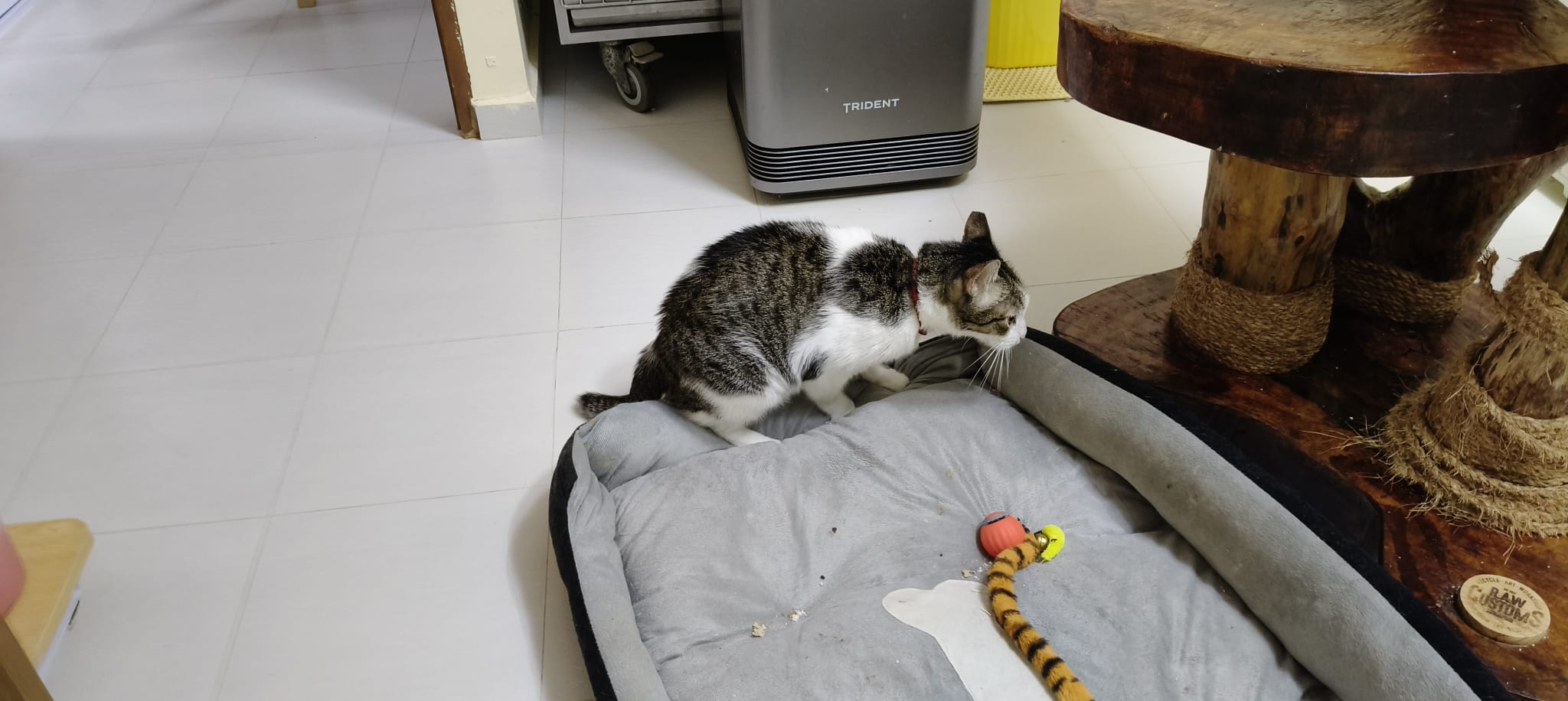 3pm+: Kitty also a little bore. He climb the cat tree and play on the floor cos he canāt go disturb ah boy now.