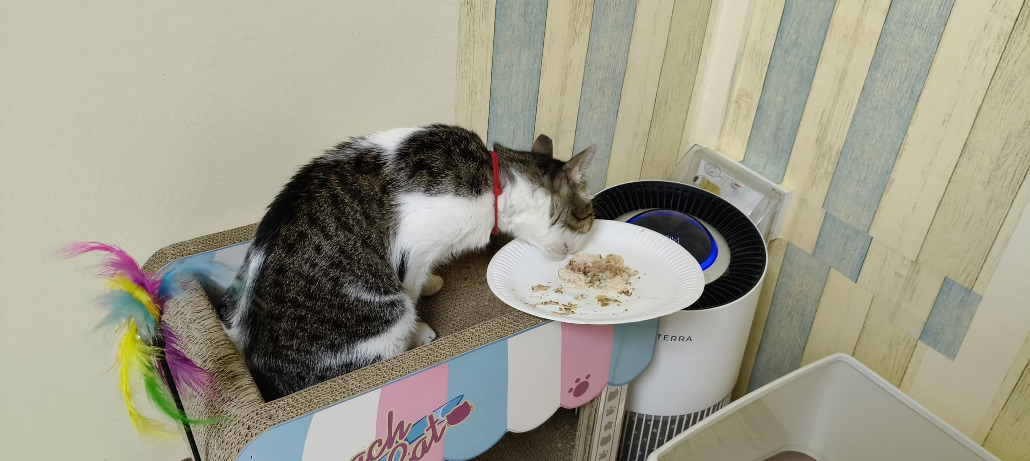 Lucky breakfast when he go room b poo I trap him in there so easier to get him into carrier