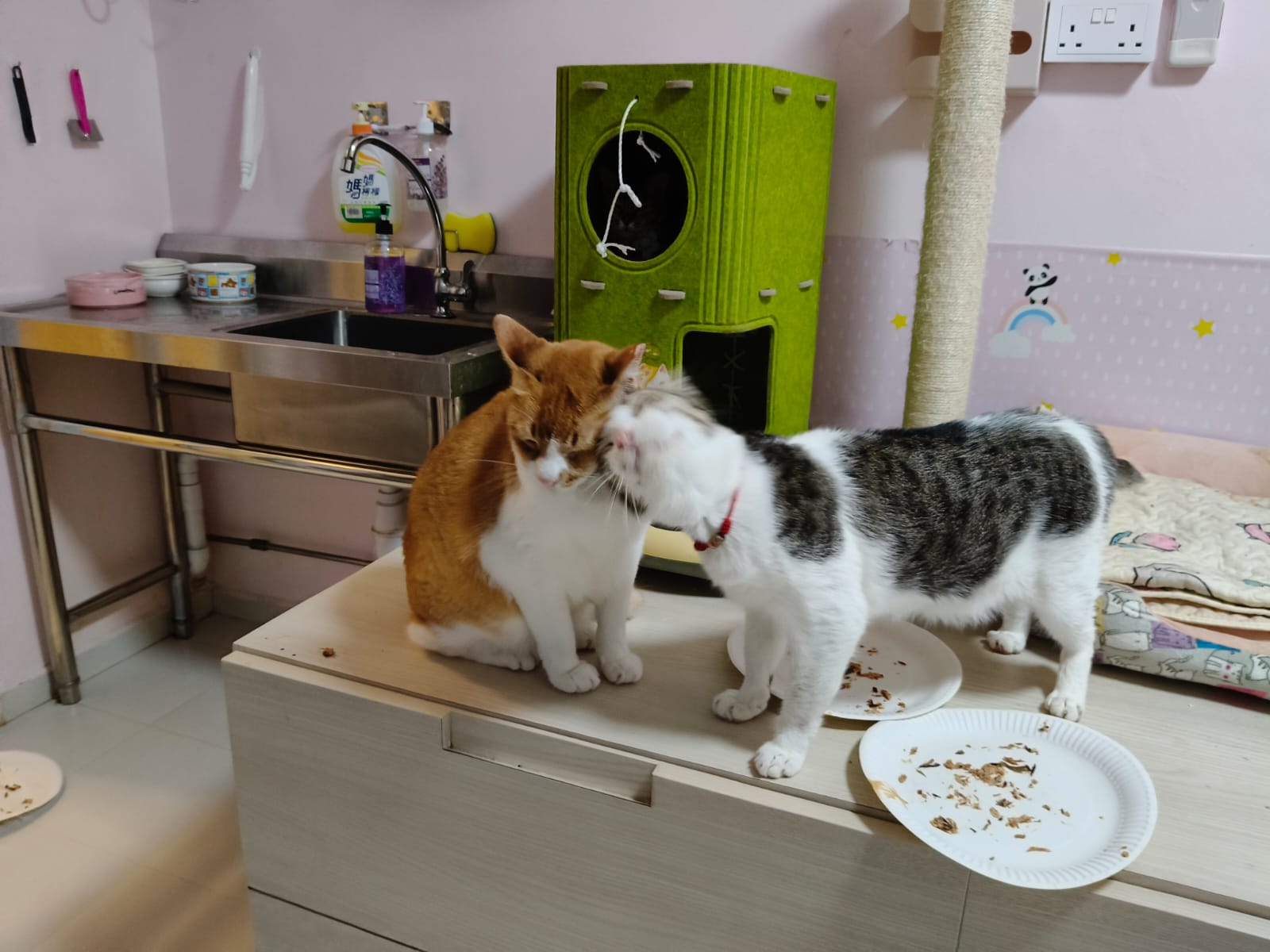 11.10am+: rena is back, n I bring her onto the bed, Jack, buddy sena is on it, so she can laze w them for a while. Kitty came to kiss rena, while I extract rena 10 years photos, last time Kitty and rena always in 2g kitchen food shelves š they r friends. told them Iām bringing rena back home to visit then go center prep her urn and party photos and labels.