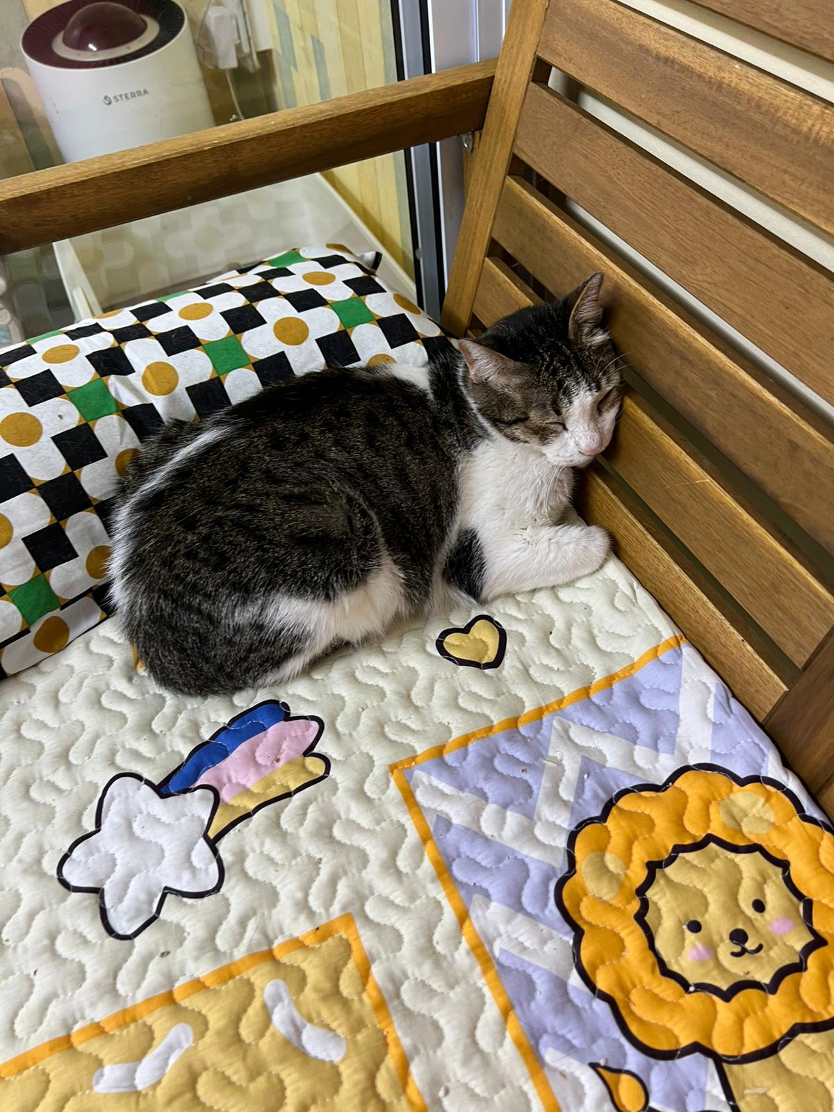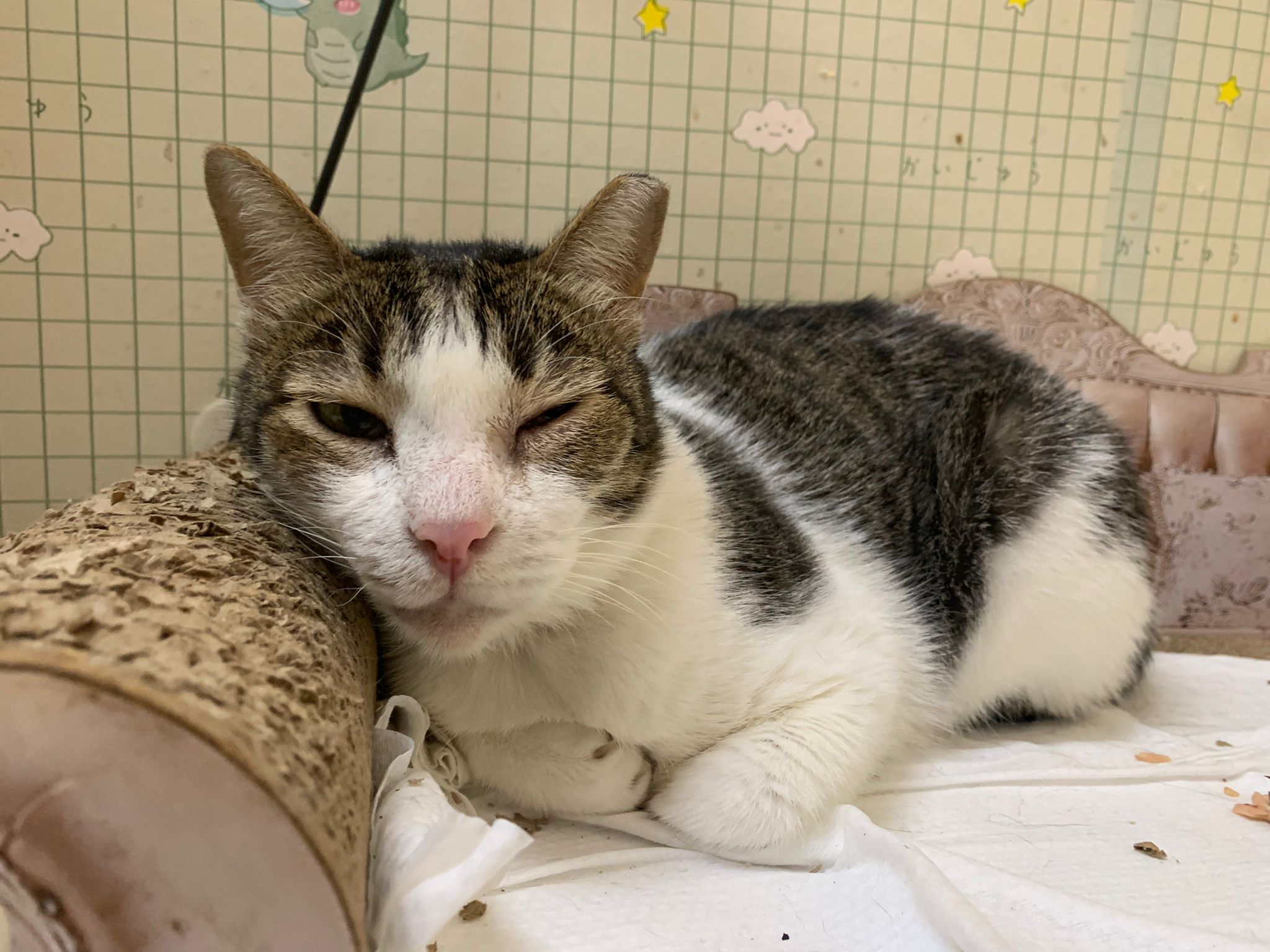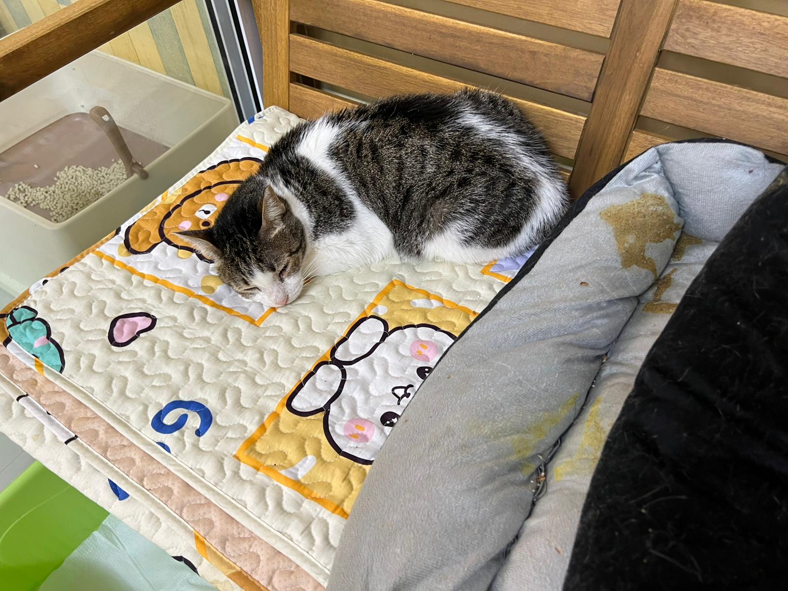 Morning: he likes to sleep on the princess sweetheart big sofa sb. Left eye a little discharge. Generally seem ok.