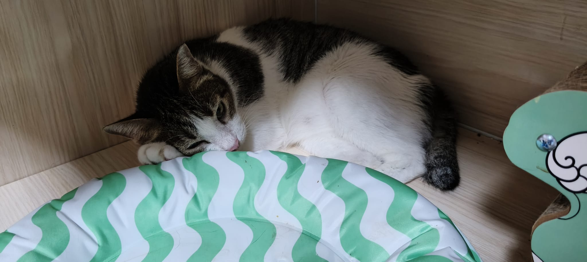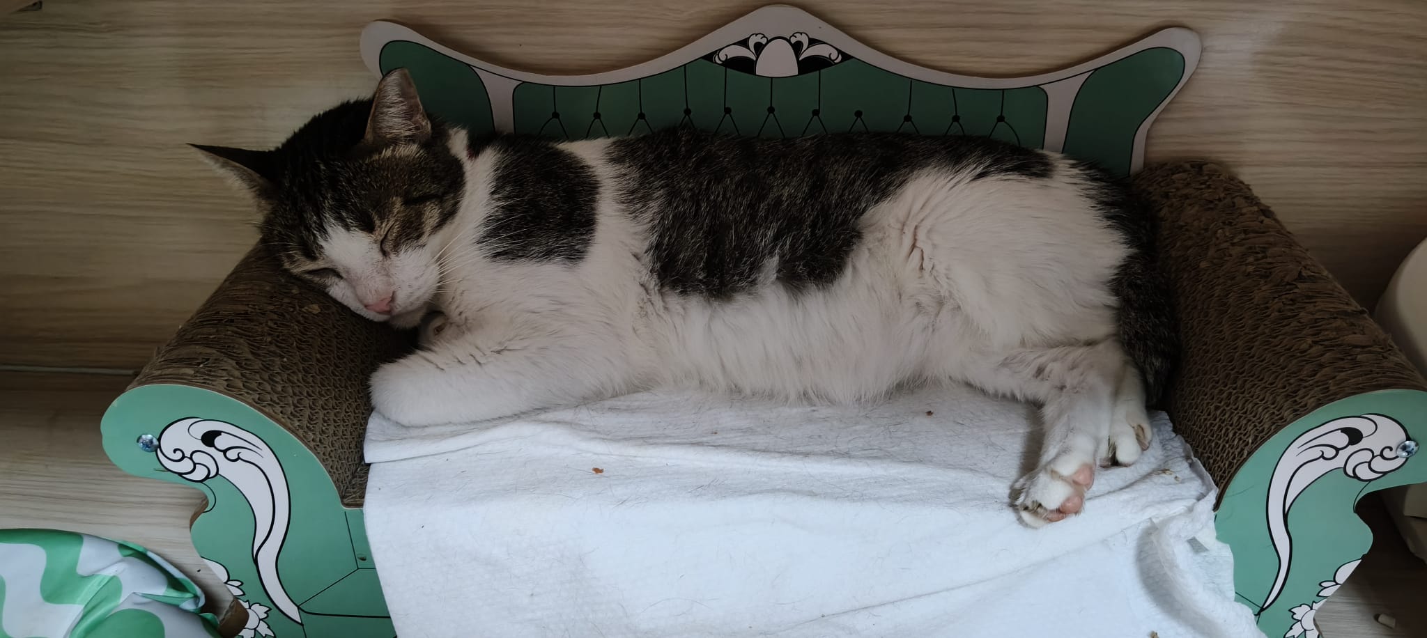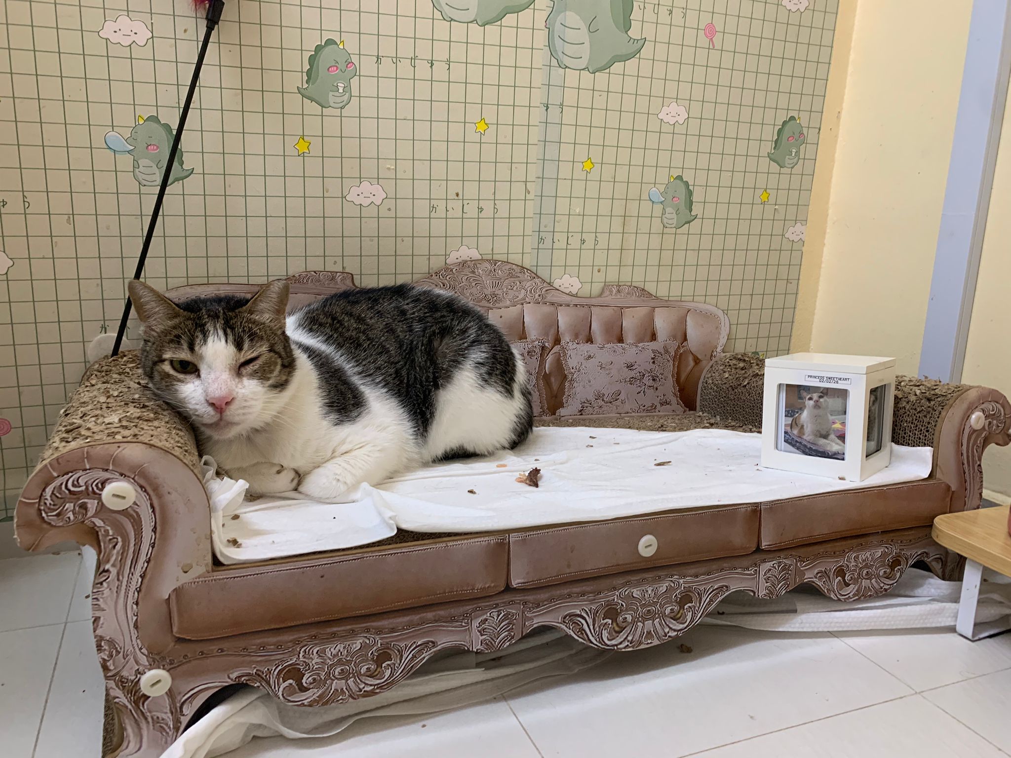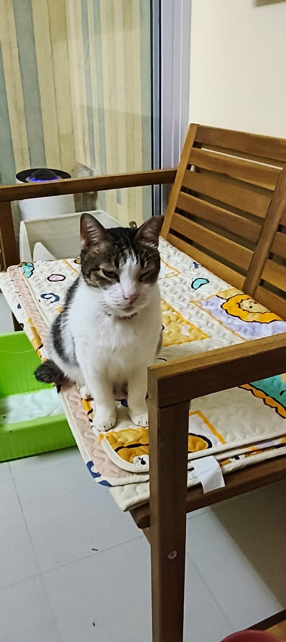 Morning: he likes to sleep on the princess sweetheart big sofa sb. Left eye a little discharge. Generally seem ok.