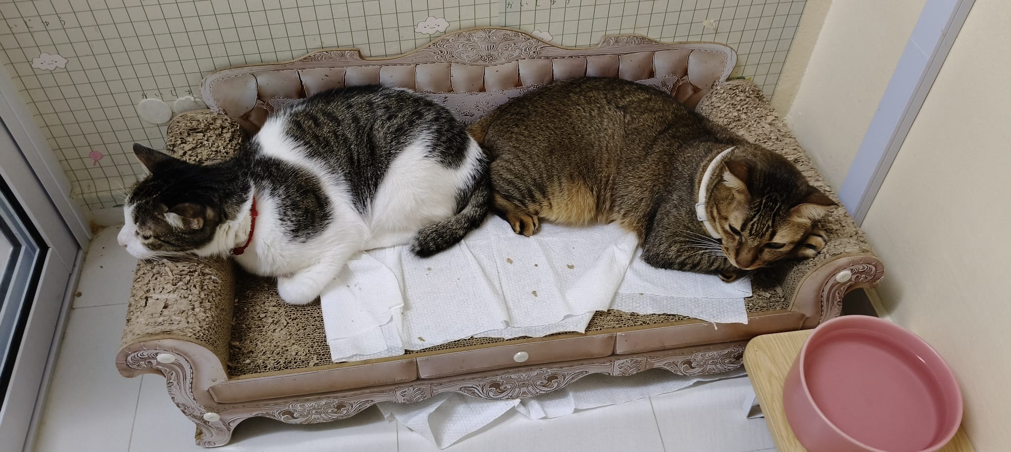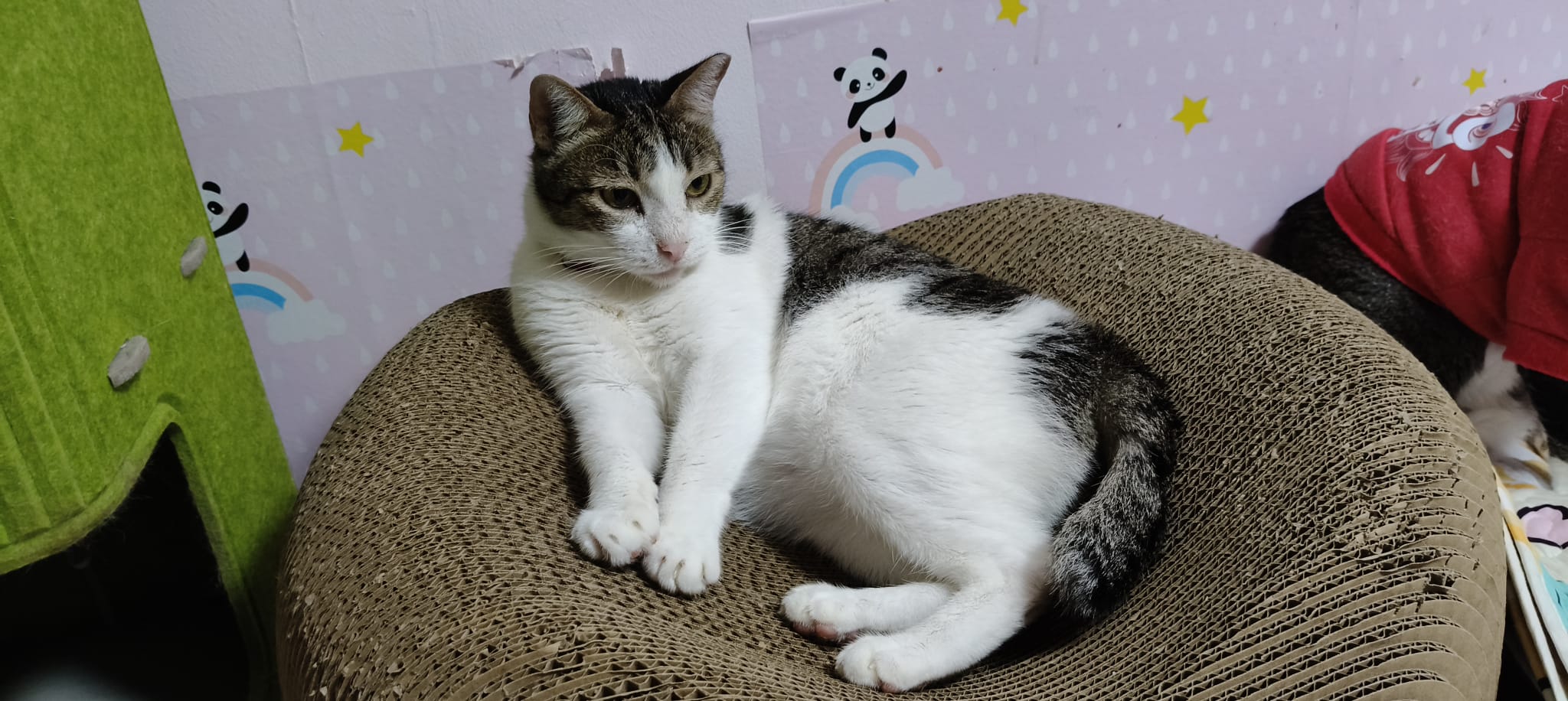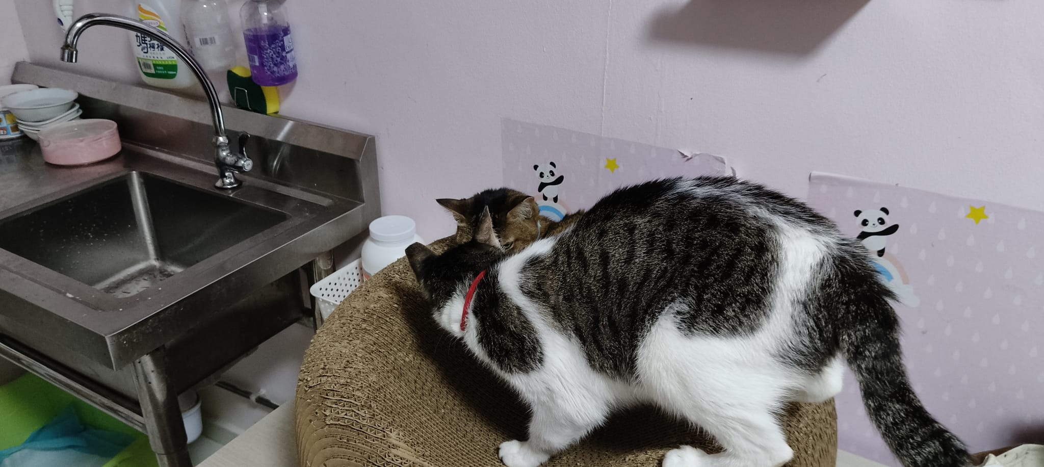 11am+: I open a catnip toy. Tao tao so calm licking it n hugging it. Kitty just sit beside her to wait. Kitty like to bite pple heAd – tao and buddy.
