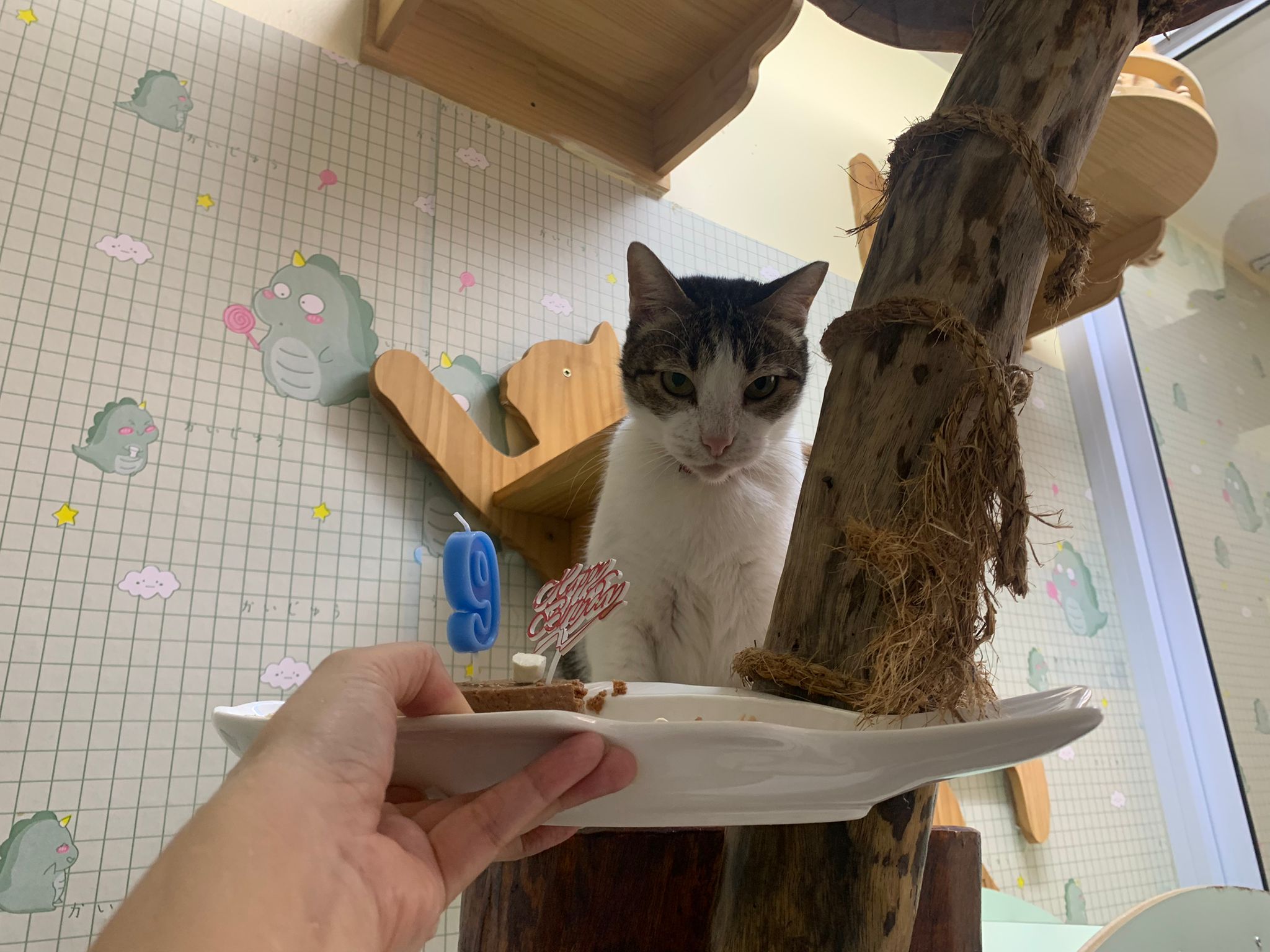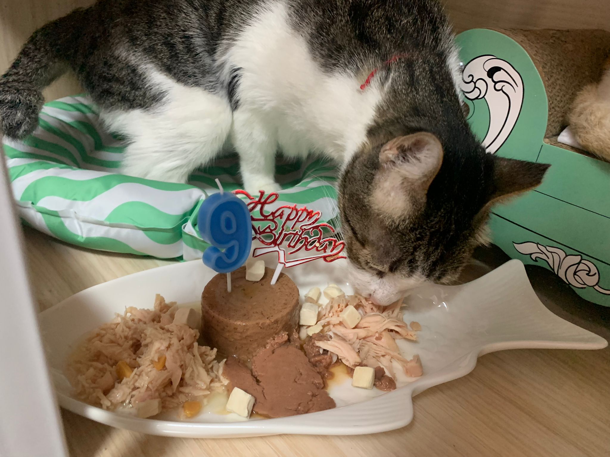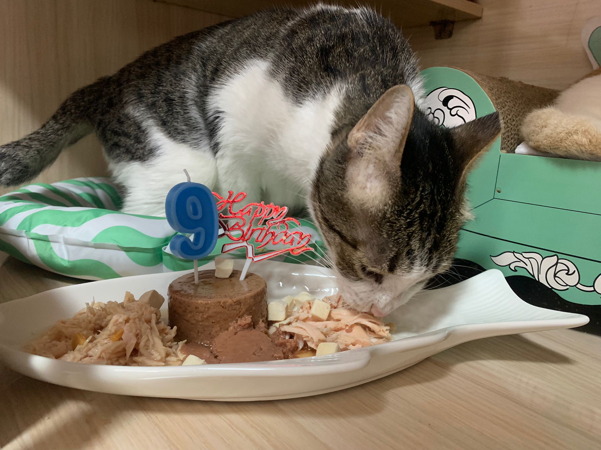 Morning: celebrate his belated bday. He eat a little bit of ciao fillet and run off le
