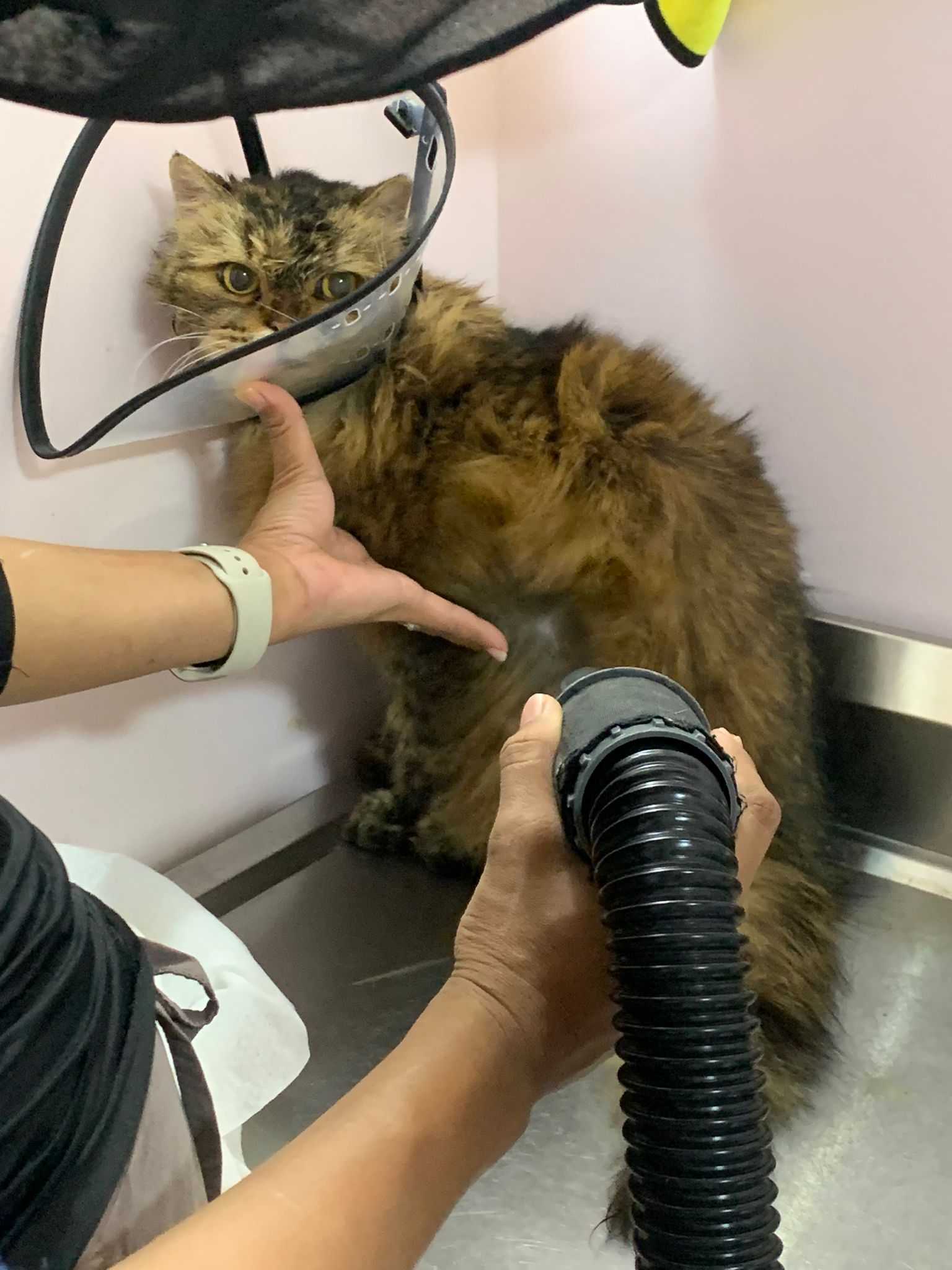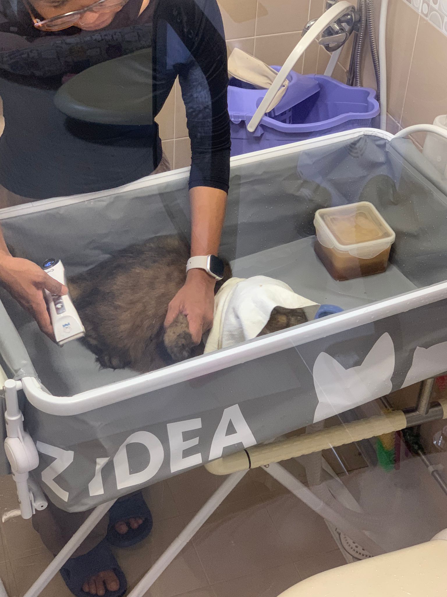 2.28pm: main groomer manage to hug her out using the dino blanket n she pee a lot on the big bed then Dyea wanna hug her to cut nails siak so 勇敢。 哈