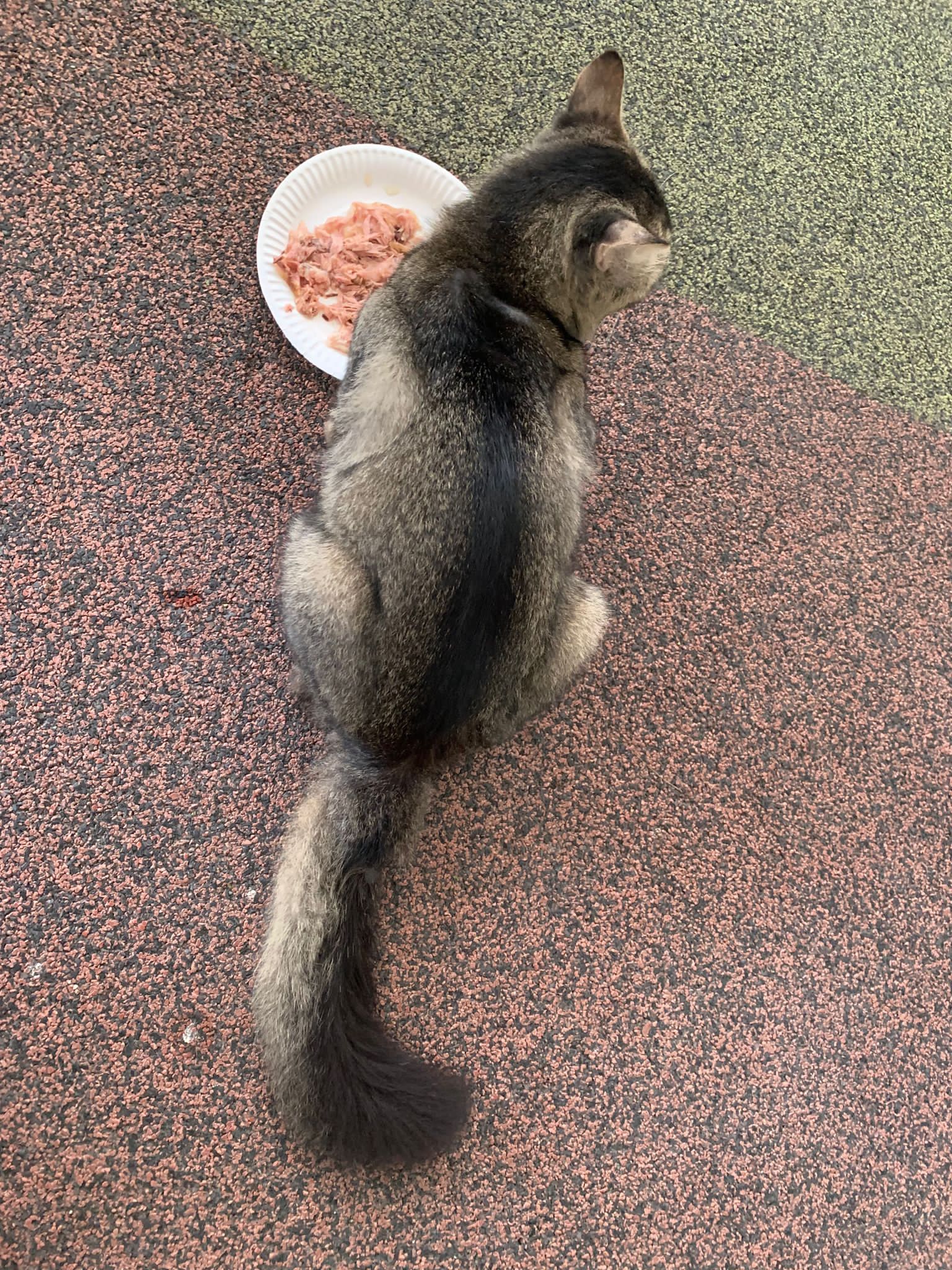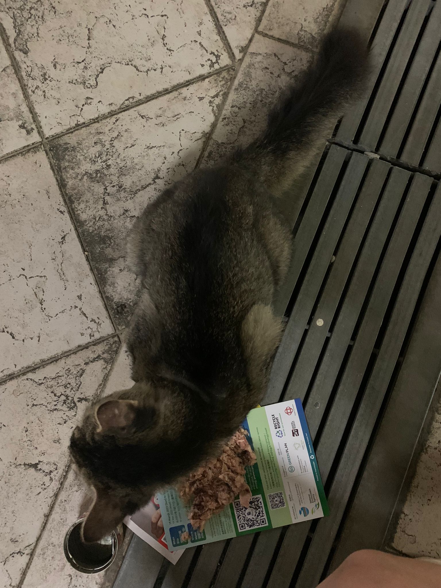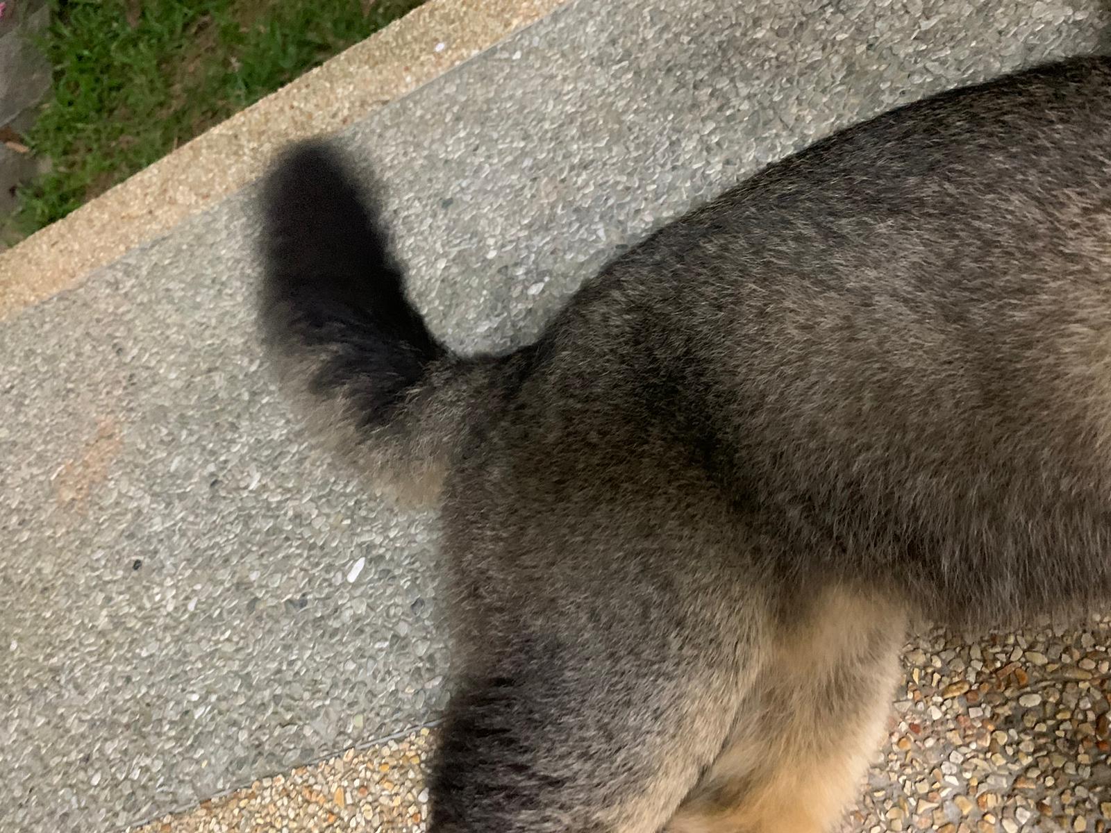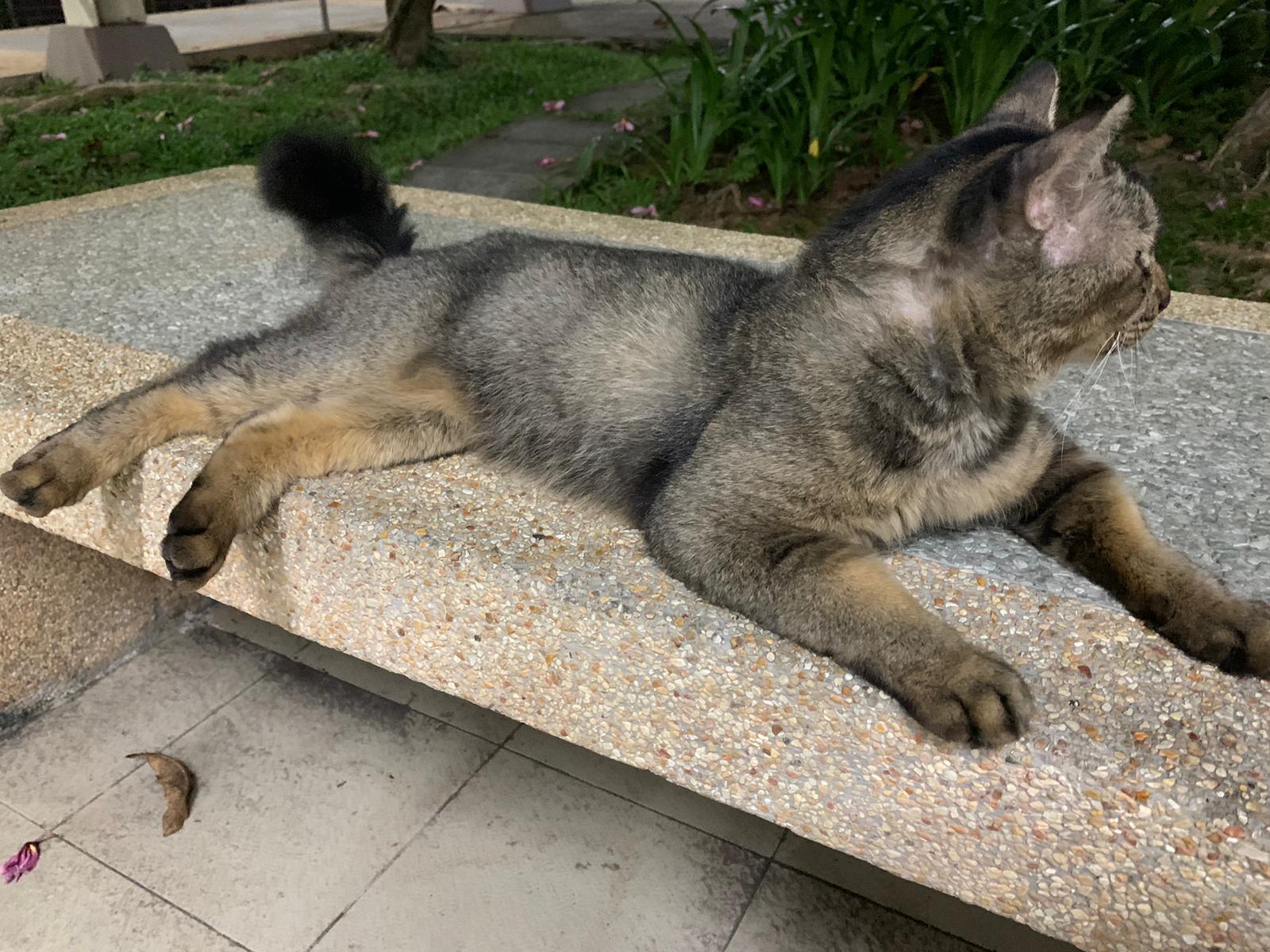 6+pm: saw him and I walked after him, got kids thought I wanna bully him? Still call out to me don’t harm him but I totally ignore them, and just handle bushy the way I want. his tail looks injured but it’s not, just Stain w some black incense paper material? Stick to tail. Serve him a can of tuna w salmon, he finish 90% n walk off.