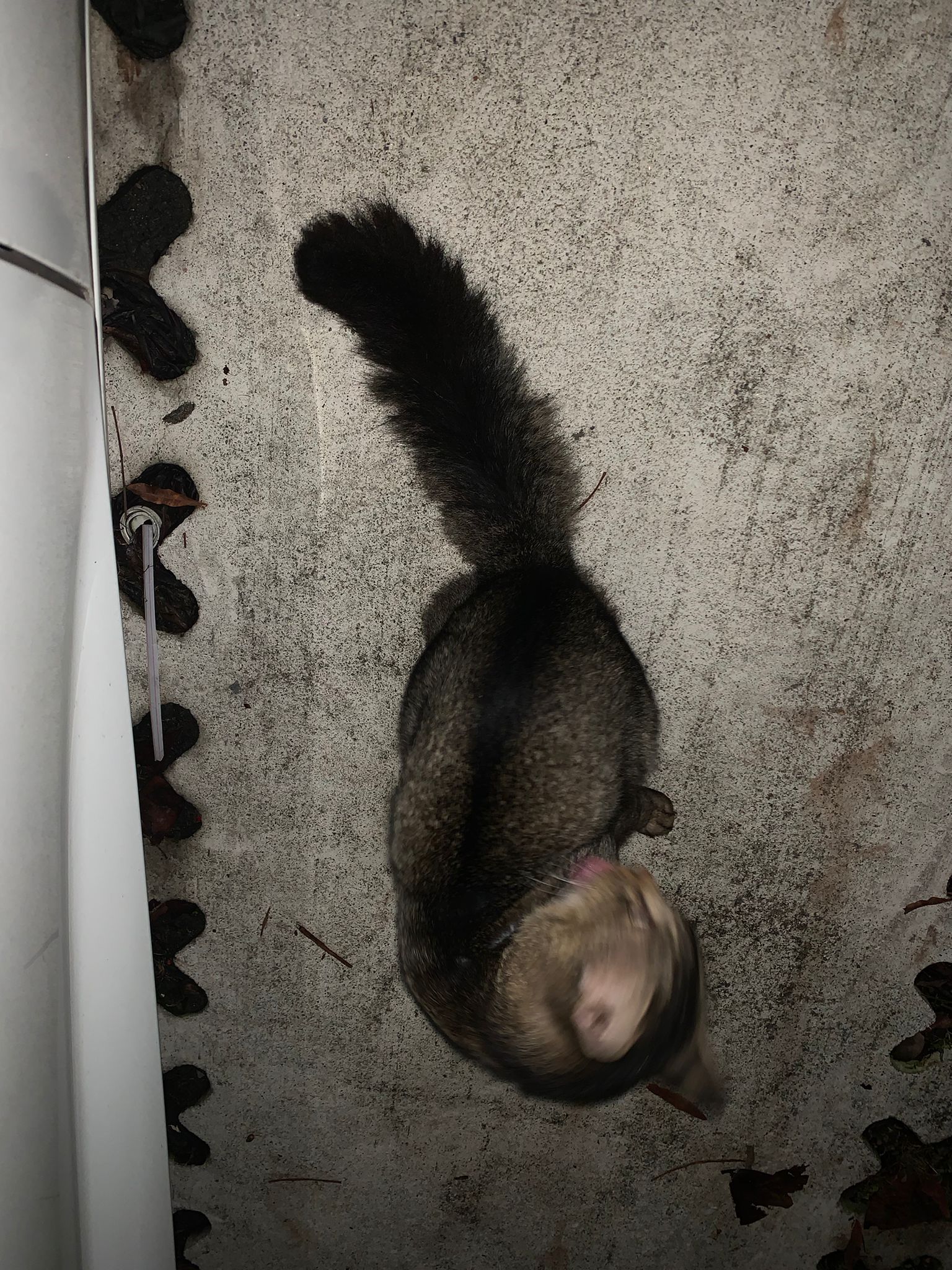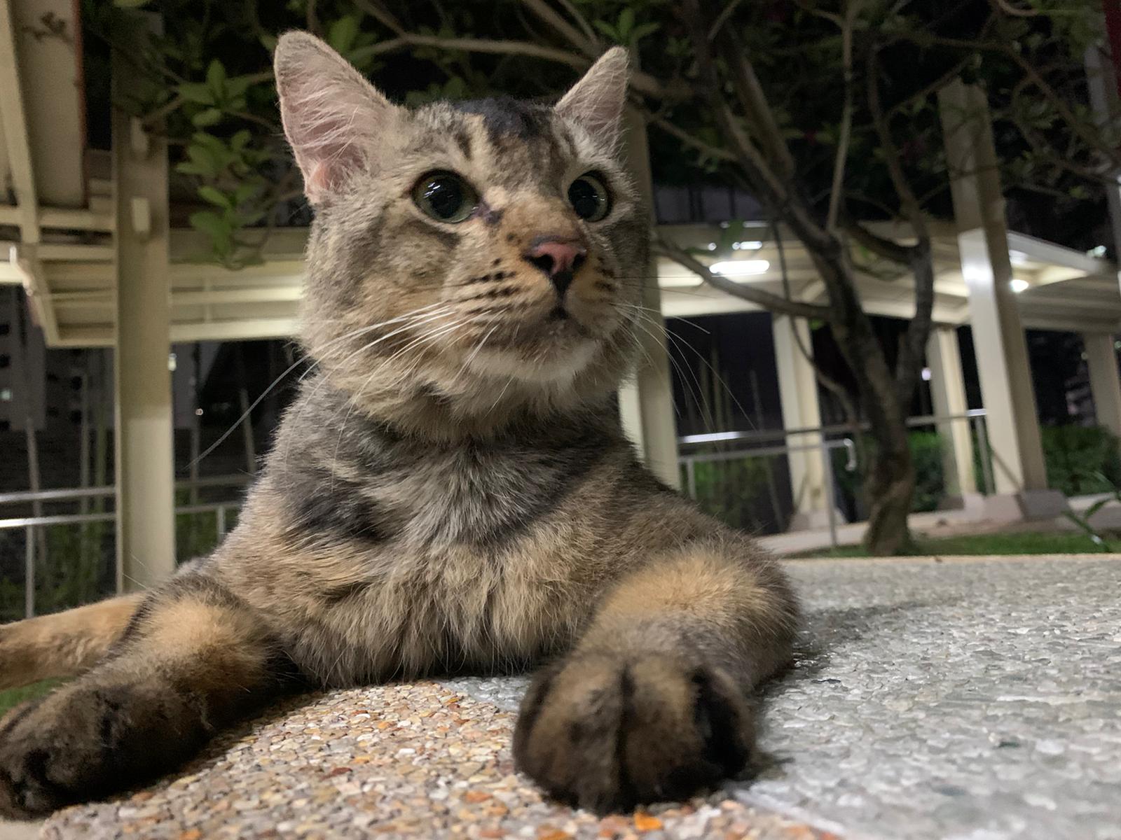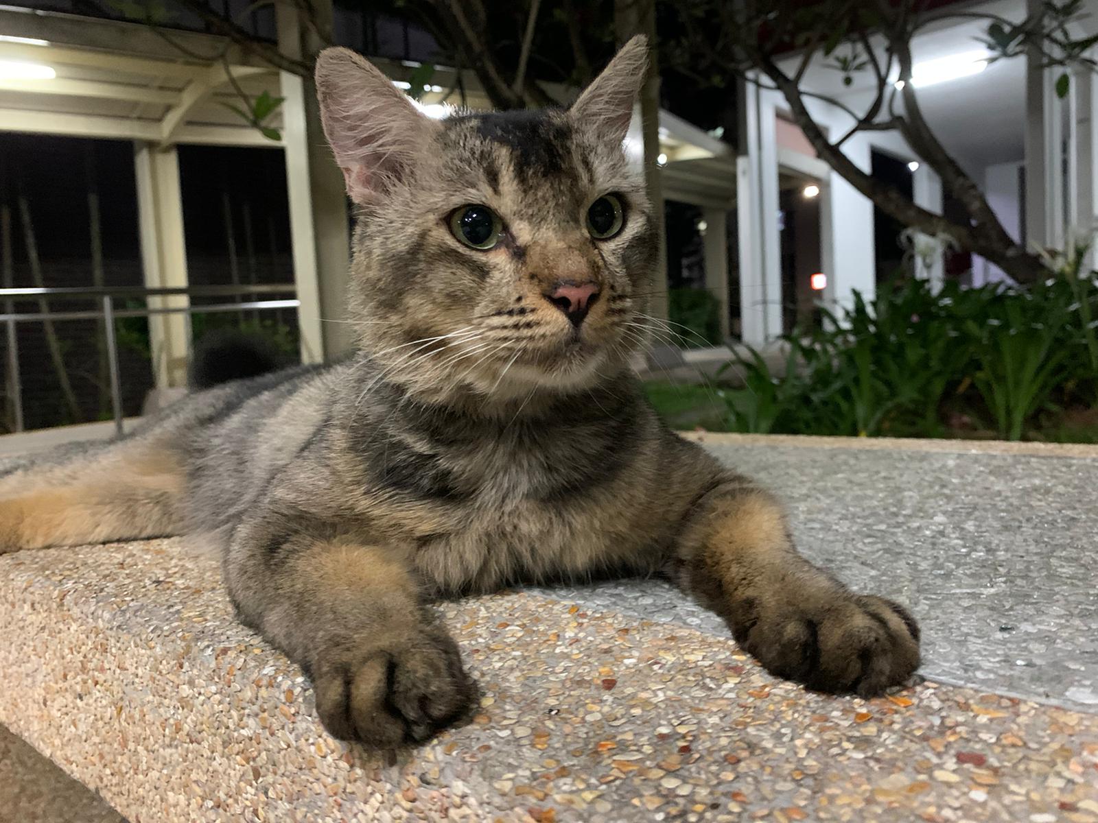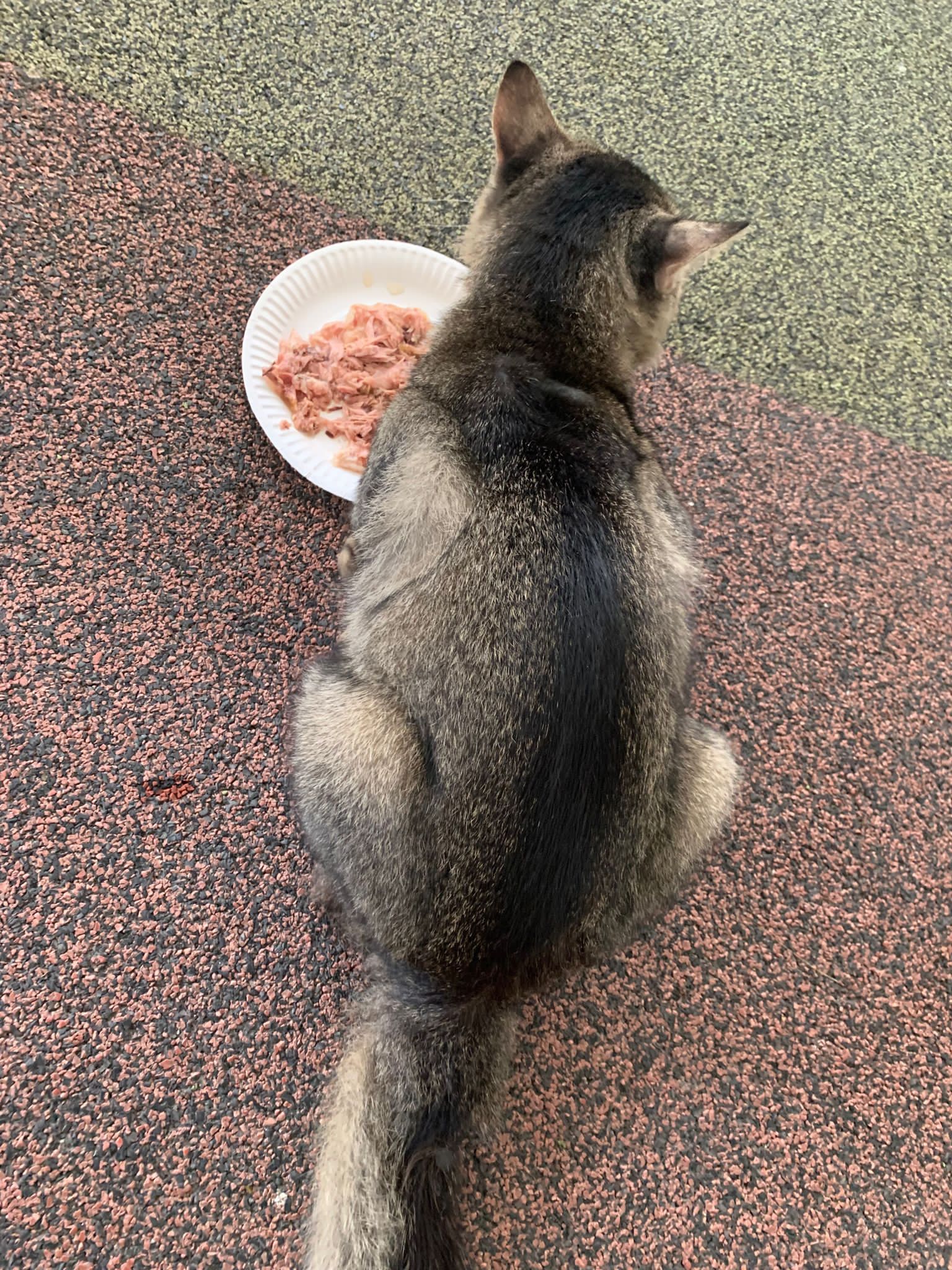 6+pm: saw him and I walked after him, got kids thought I wanna bully him? Still call out to me don’t harm him but I totally ignore them, and just handle bushy the way I want. his tail looks injured but it’s not, just Stain w some black incense paper material? Stick to tail. Serve him a can of tuna w salmon, he finish 90% n walk off.