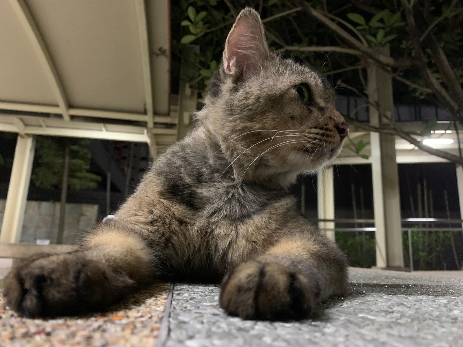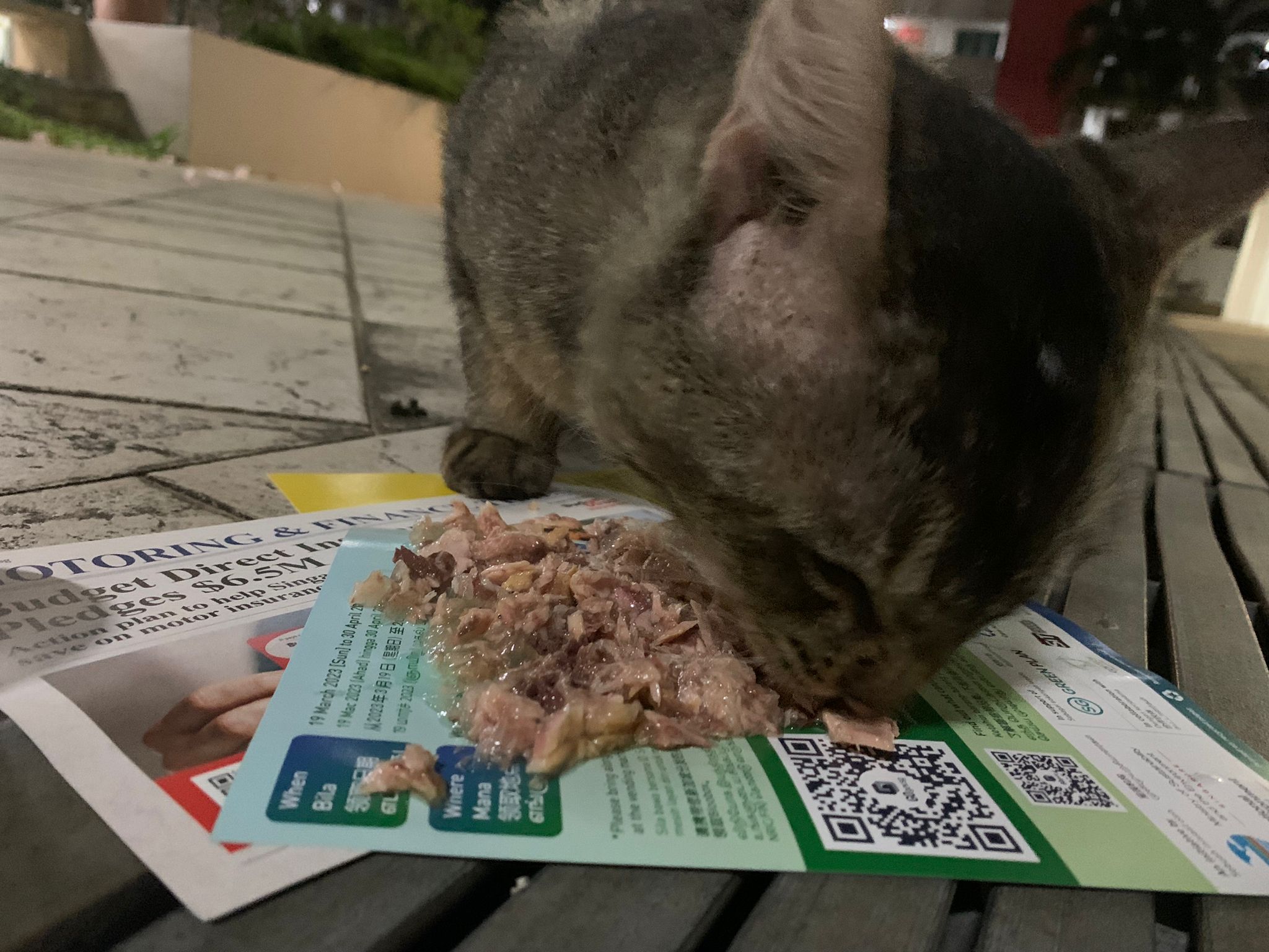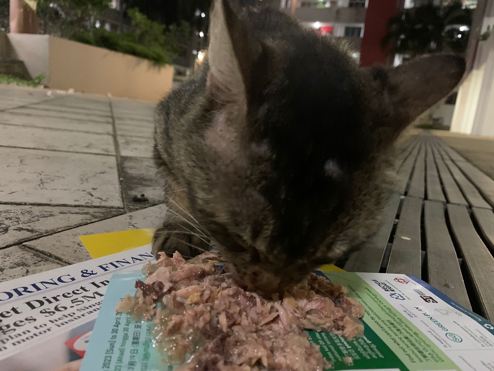 Me to scratch his left head/ face – later I find myself damn itchy. He confirm got mites. He looks so poor thing, sleep on a mat (quite smart, can scratch n sleep) on a cold night. Give him a can of tuna w salmon, he finish all. Erm I have to put paper plate n food in my bag in case I see him again.