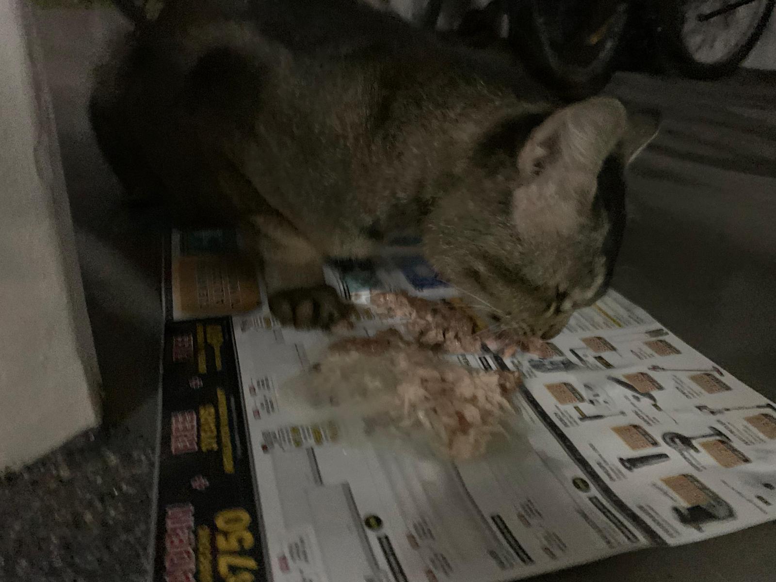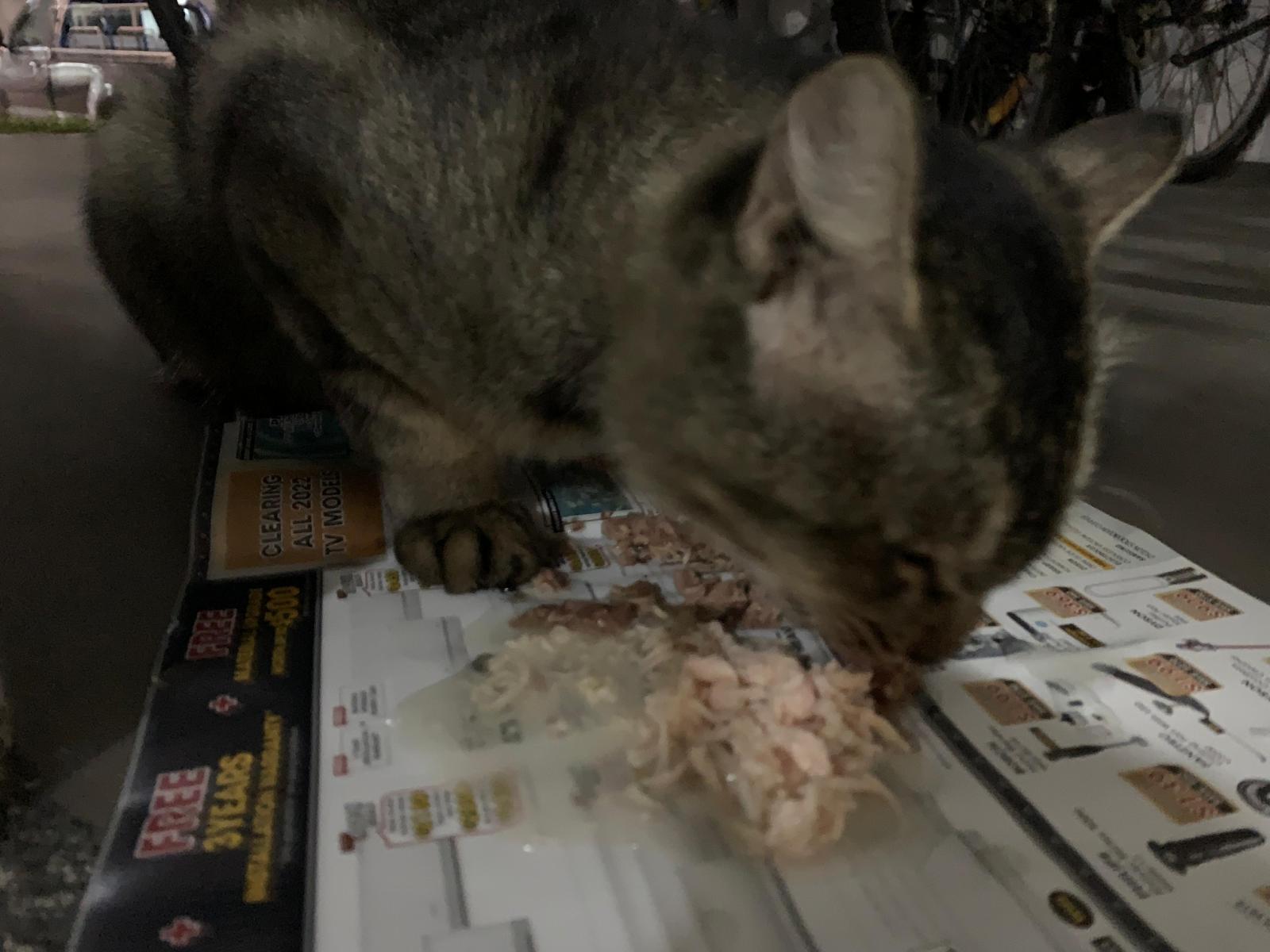 Night: bushy tail turn up when I walk away from an an. wanna fight loh. manage to stop them but bushy tail spray urine on it, i help to clean up. End up feed the 2 of them – both eat, tuna w chicken and chicken w shirasu in gravy.