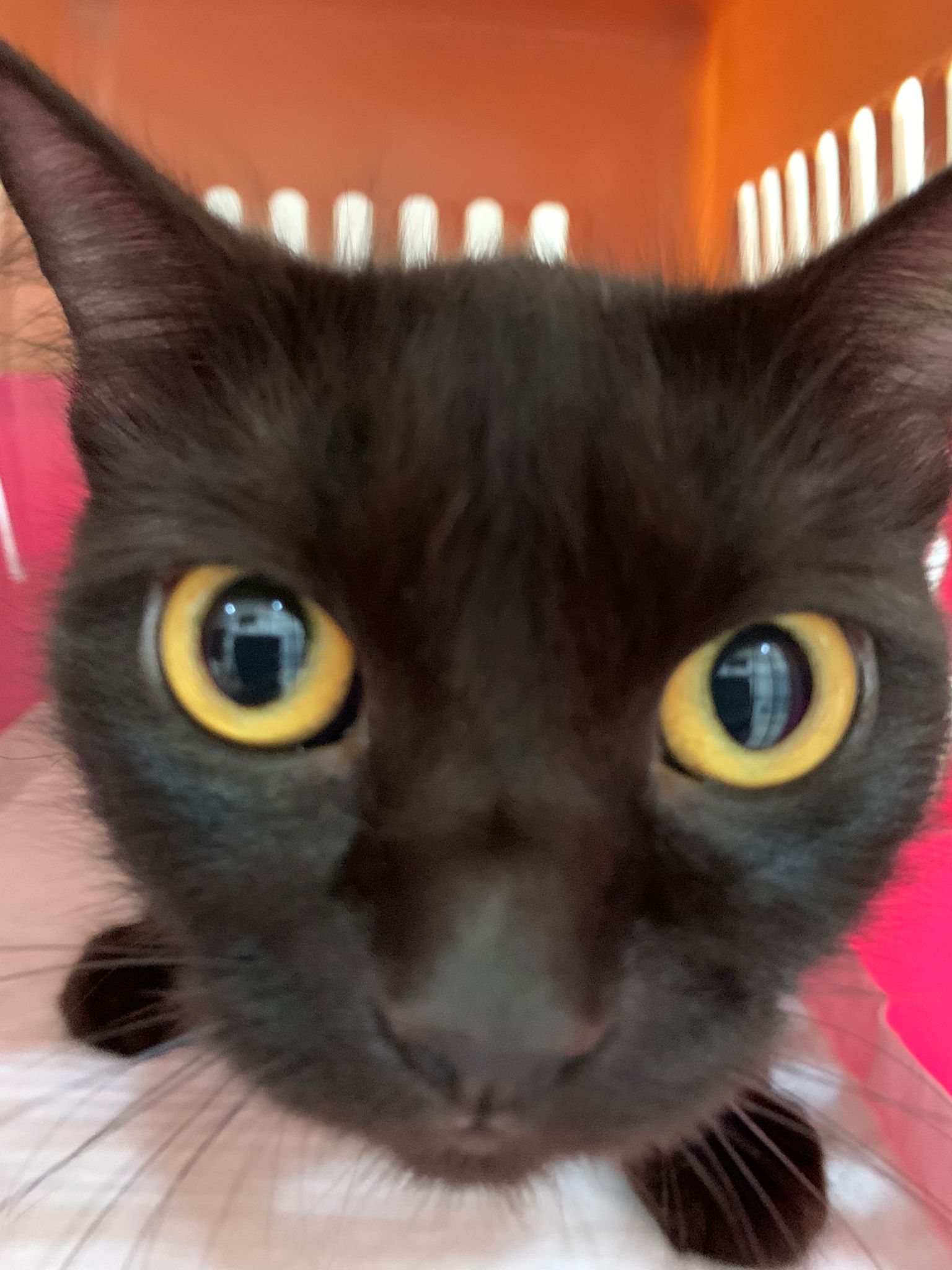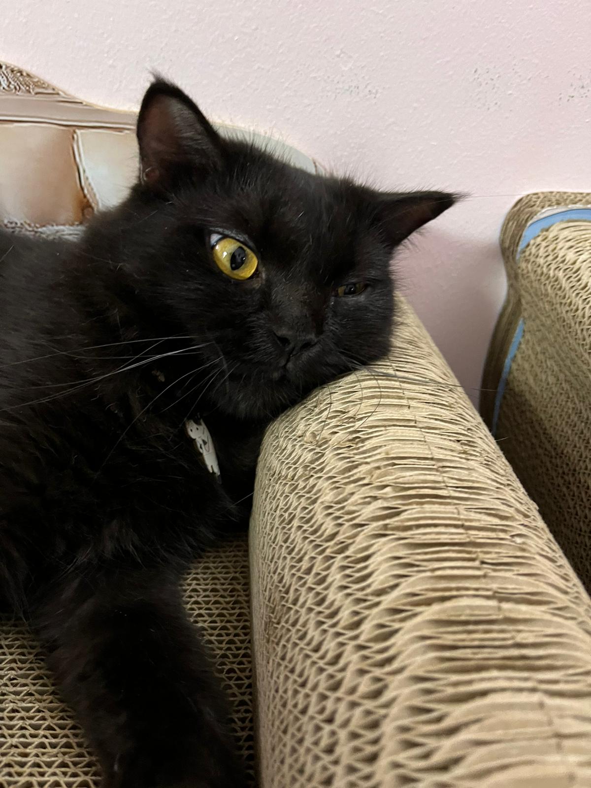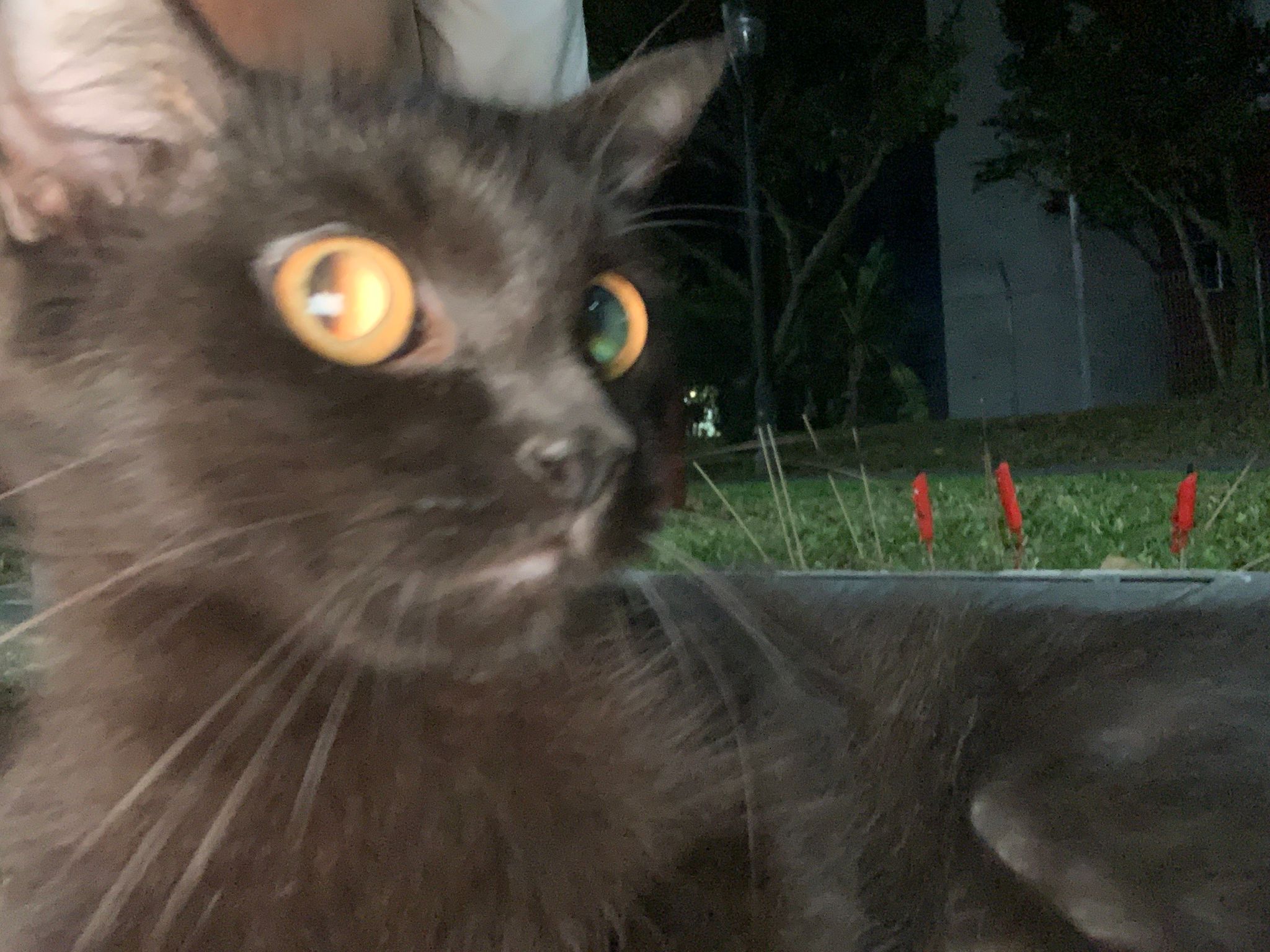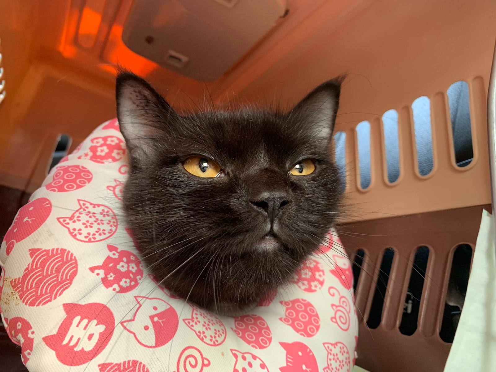 found her at 8+pm on 27.8.23. Young. Orange eyes. Female. Scare will become pregnant. Skin problems.