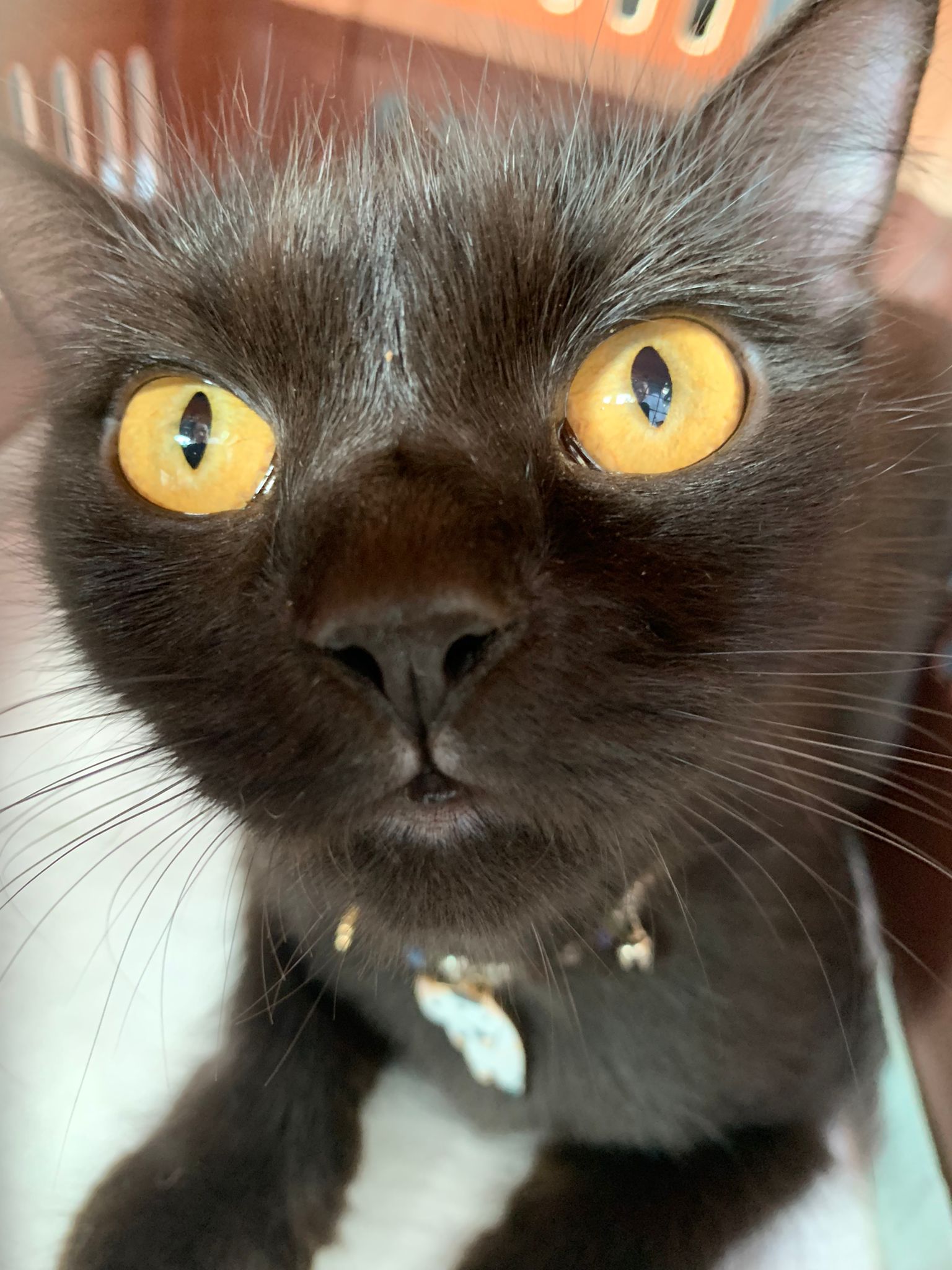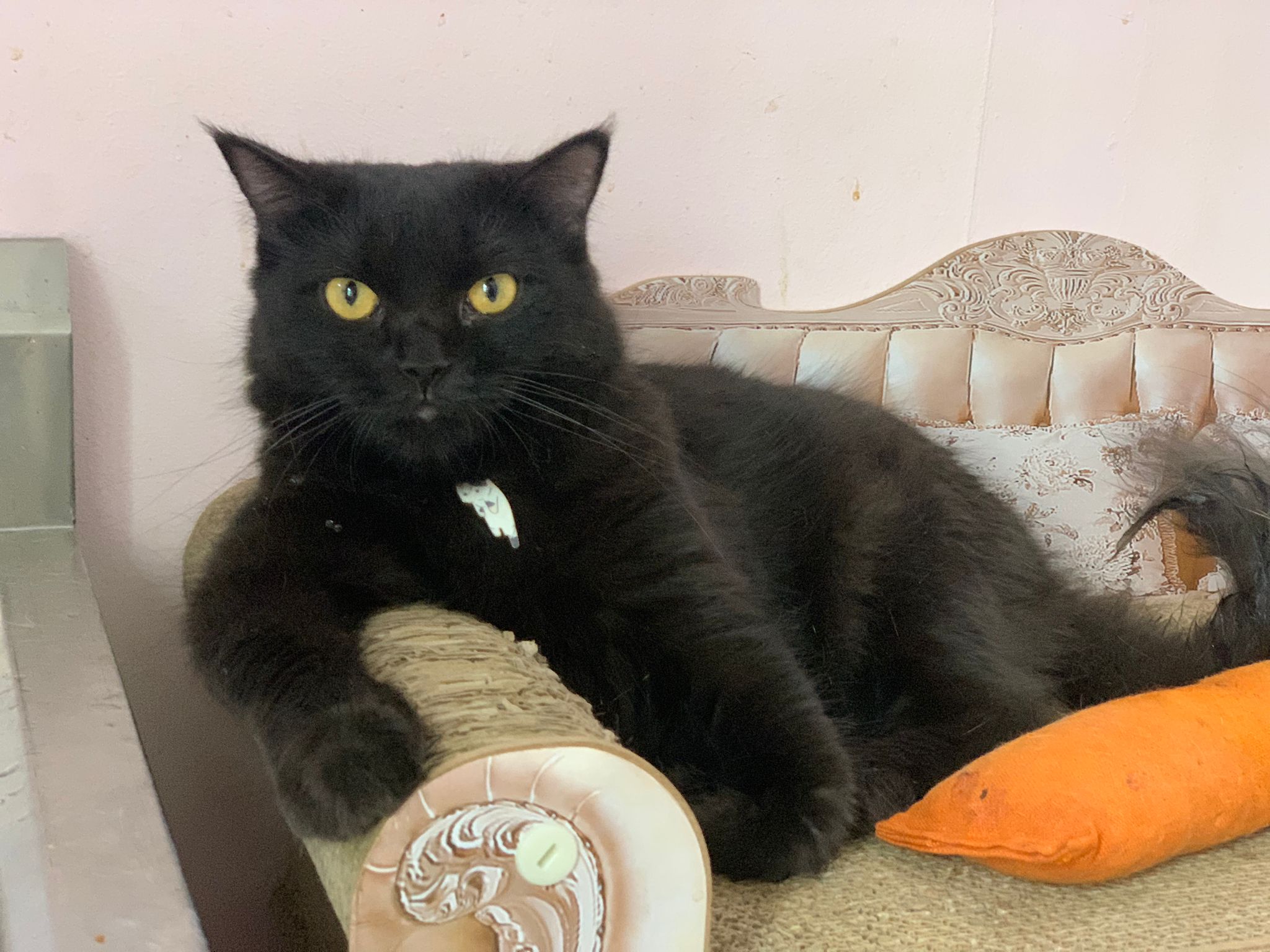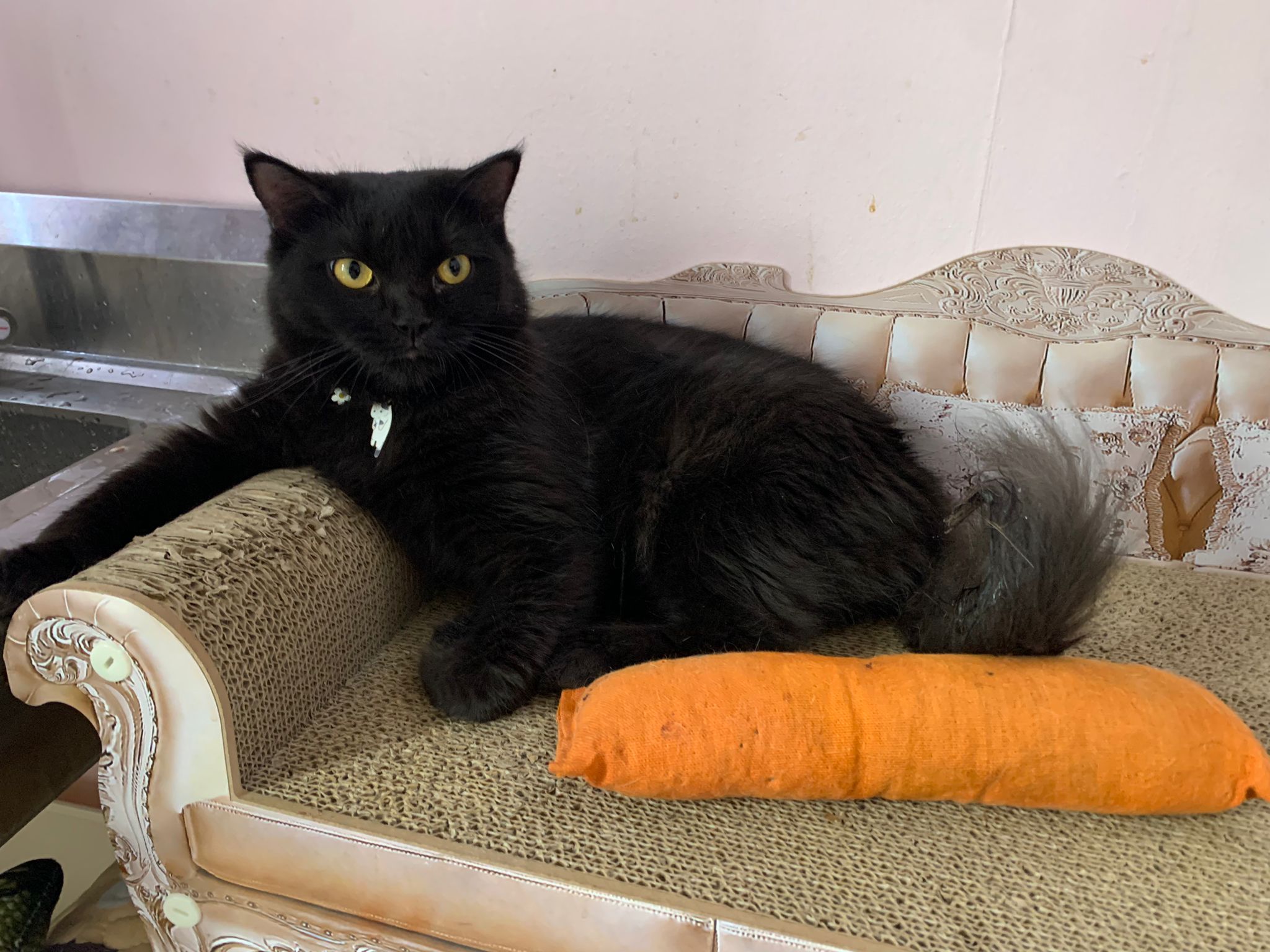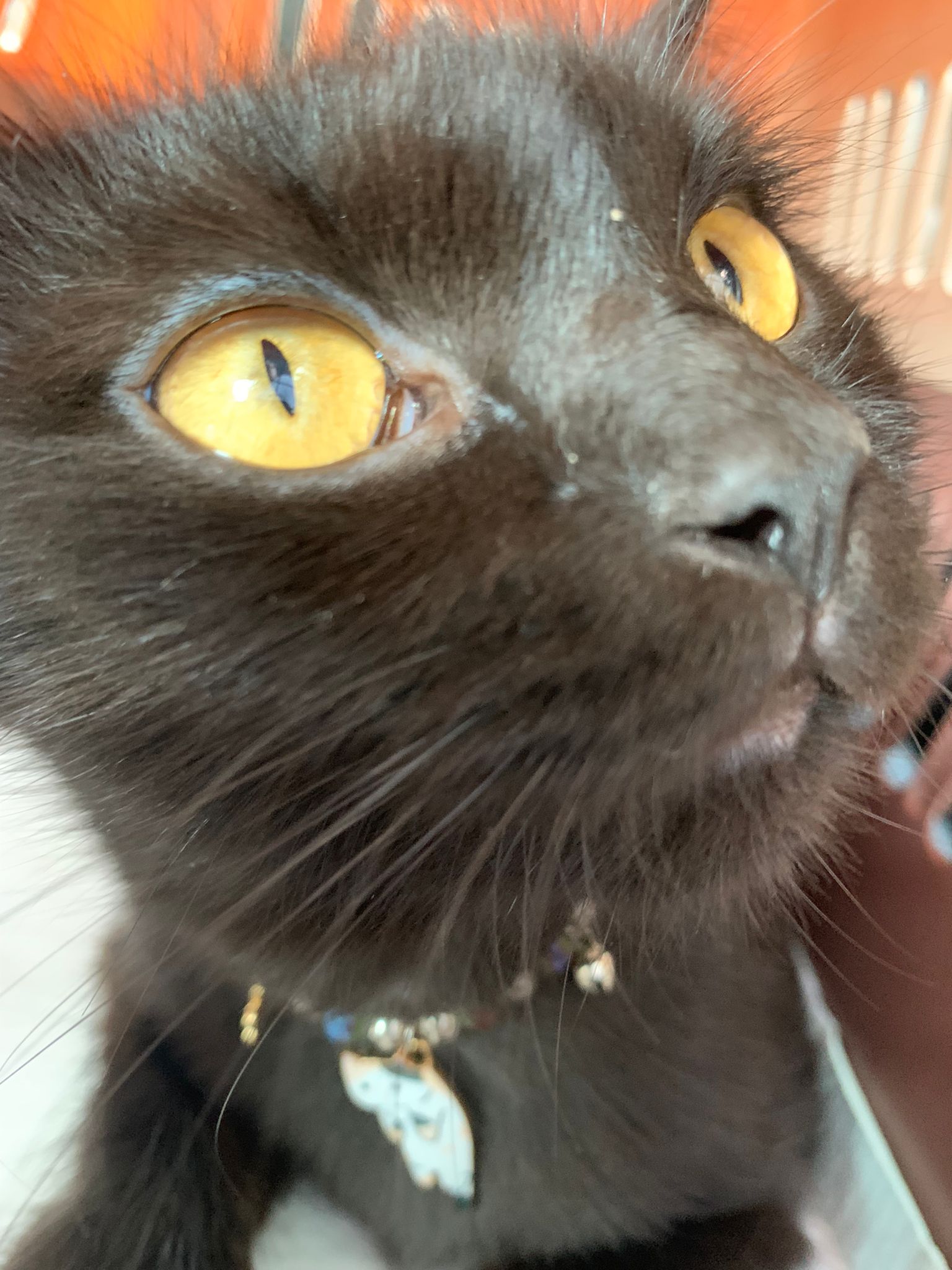 found her at 8+pm on 27.8.23. Young. Orange eyes. Female. Scare will become pregnant. Skin problems.