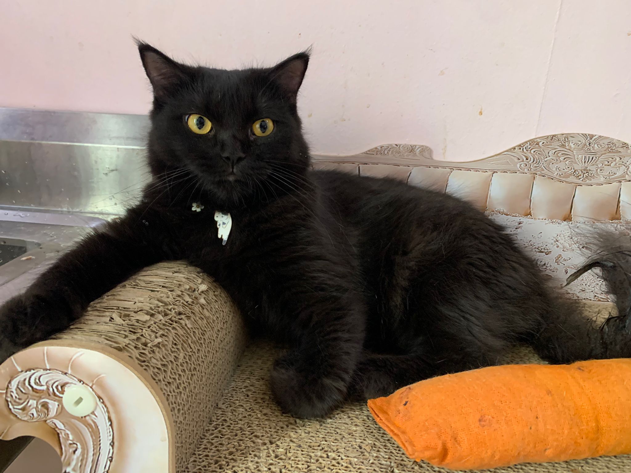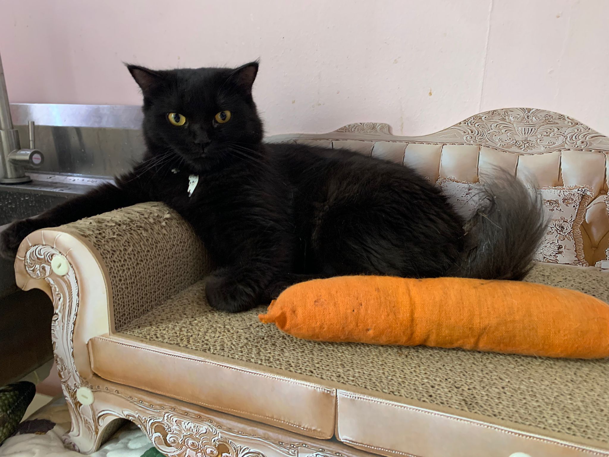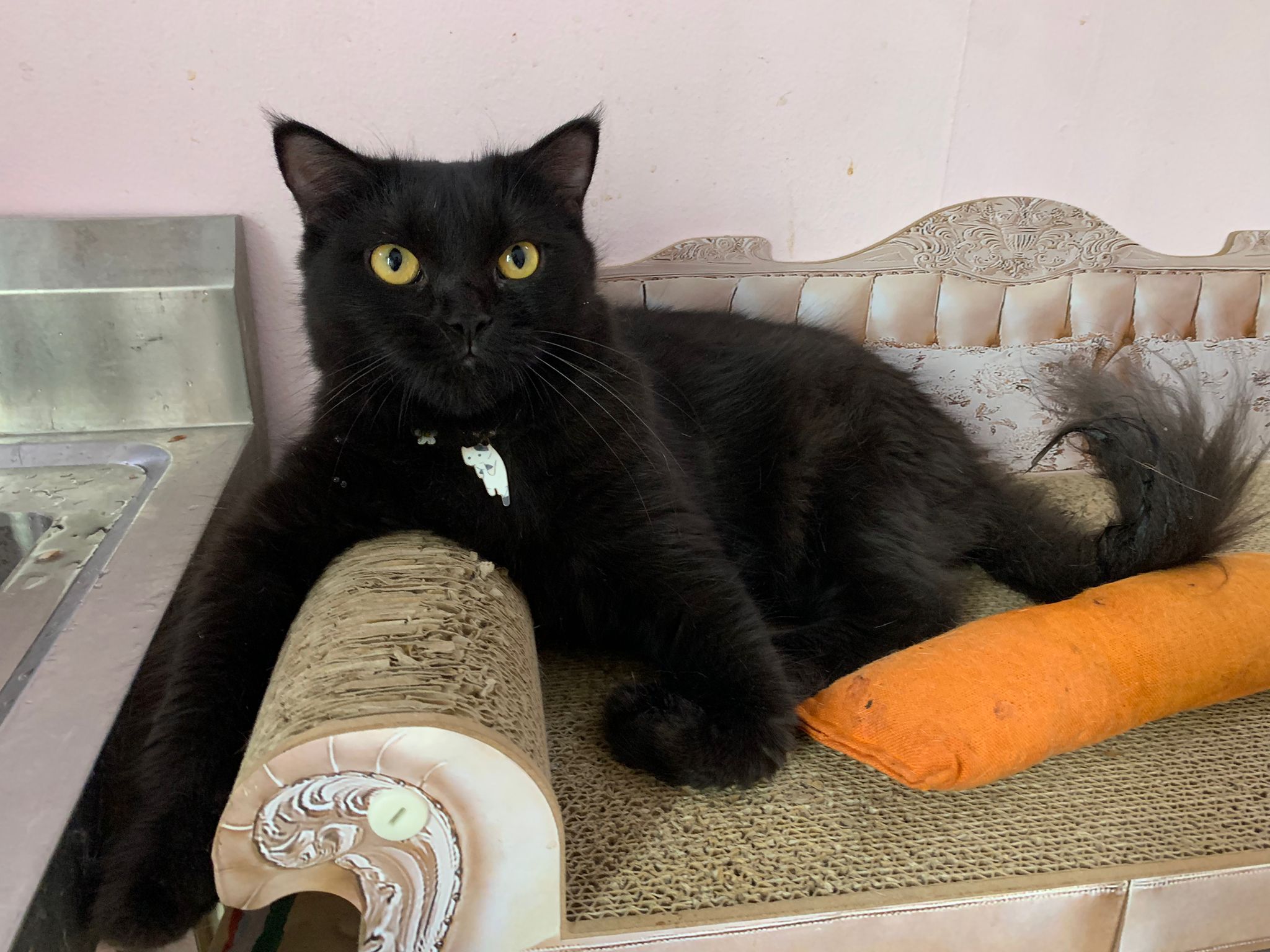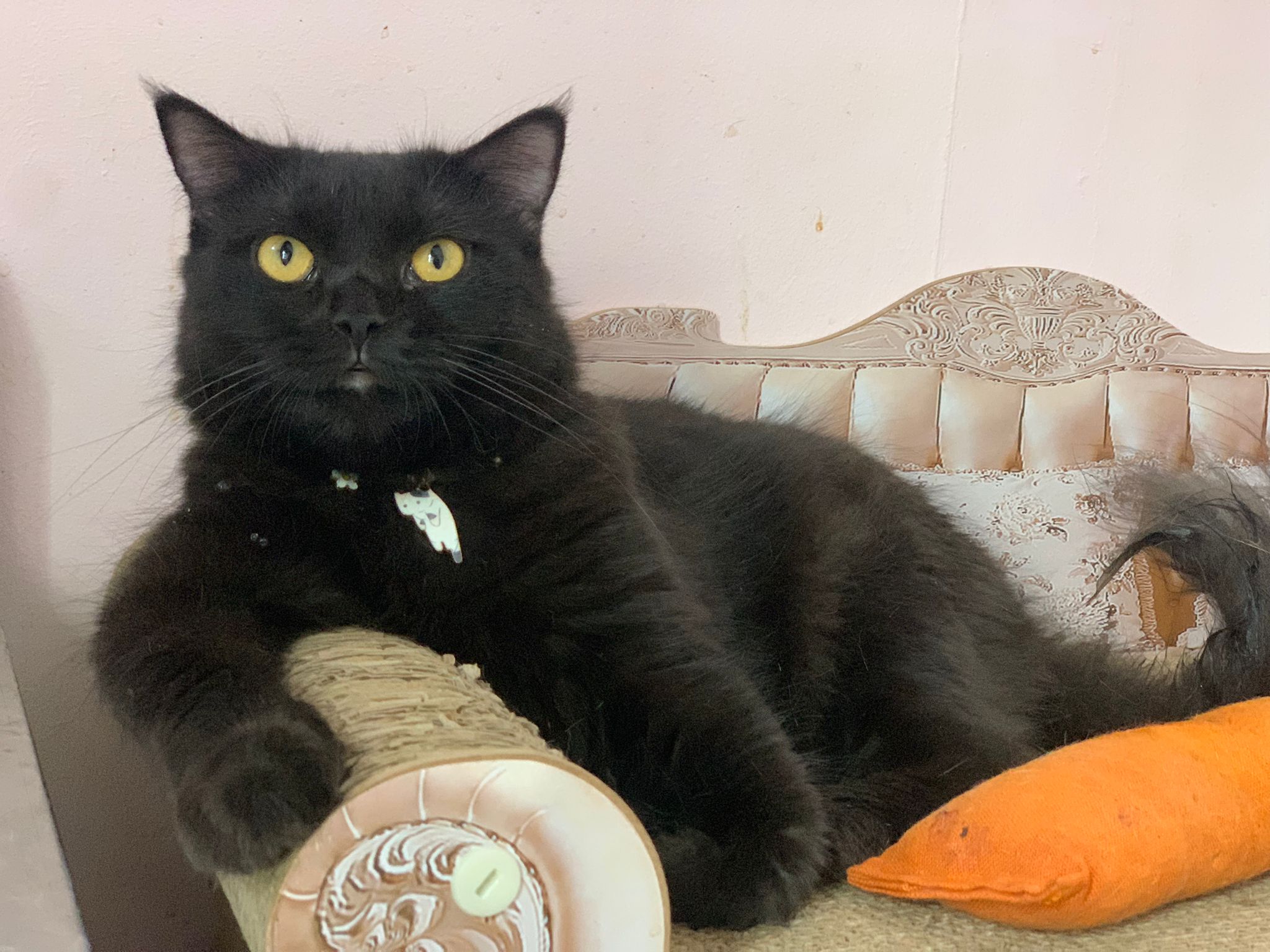 found her at 8+pm on 27.8.23. Young. Orange eyes. Female. Scare will become pregnant. Skin problems.