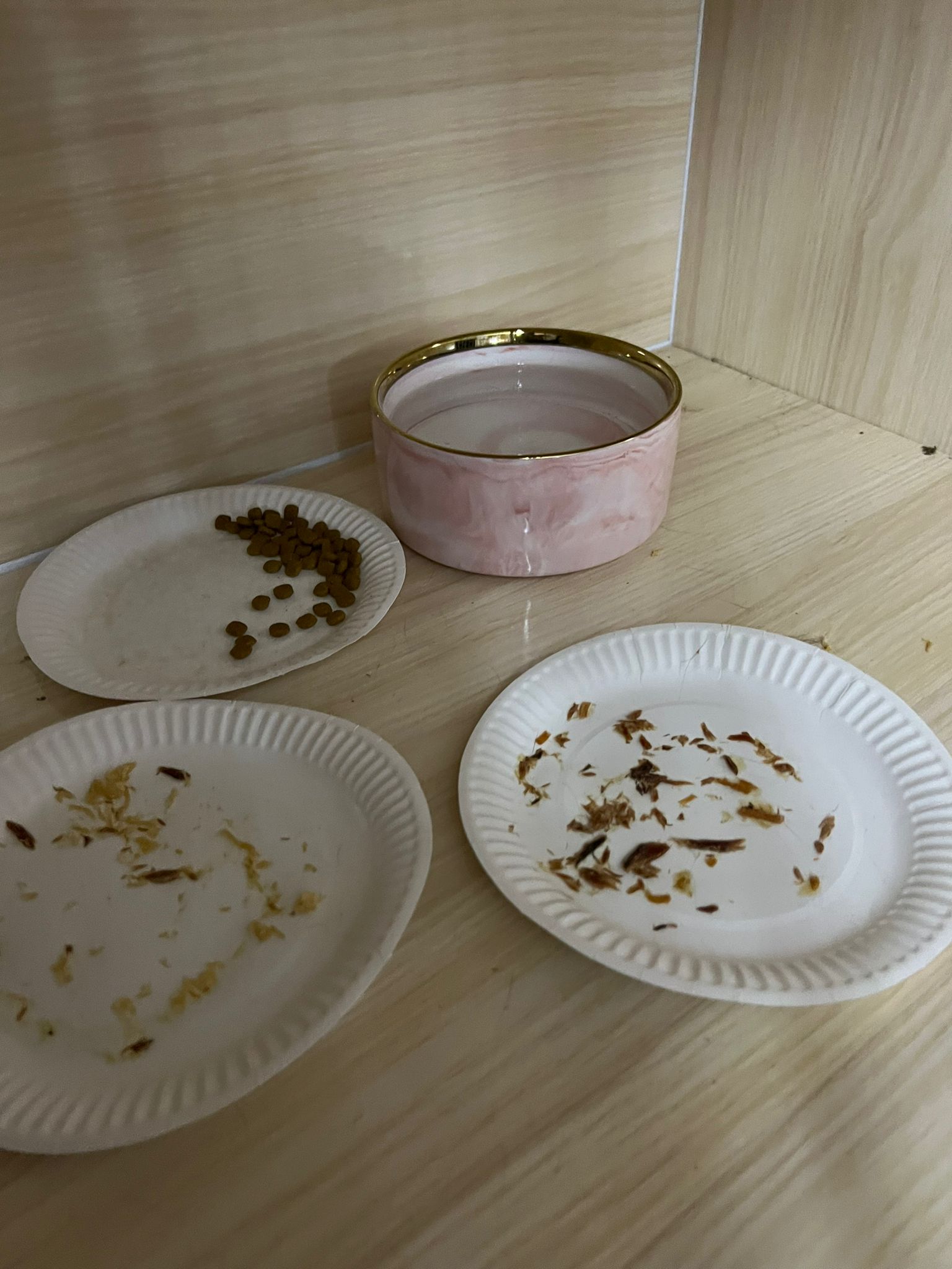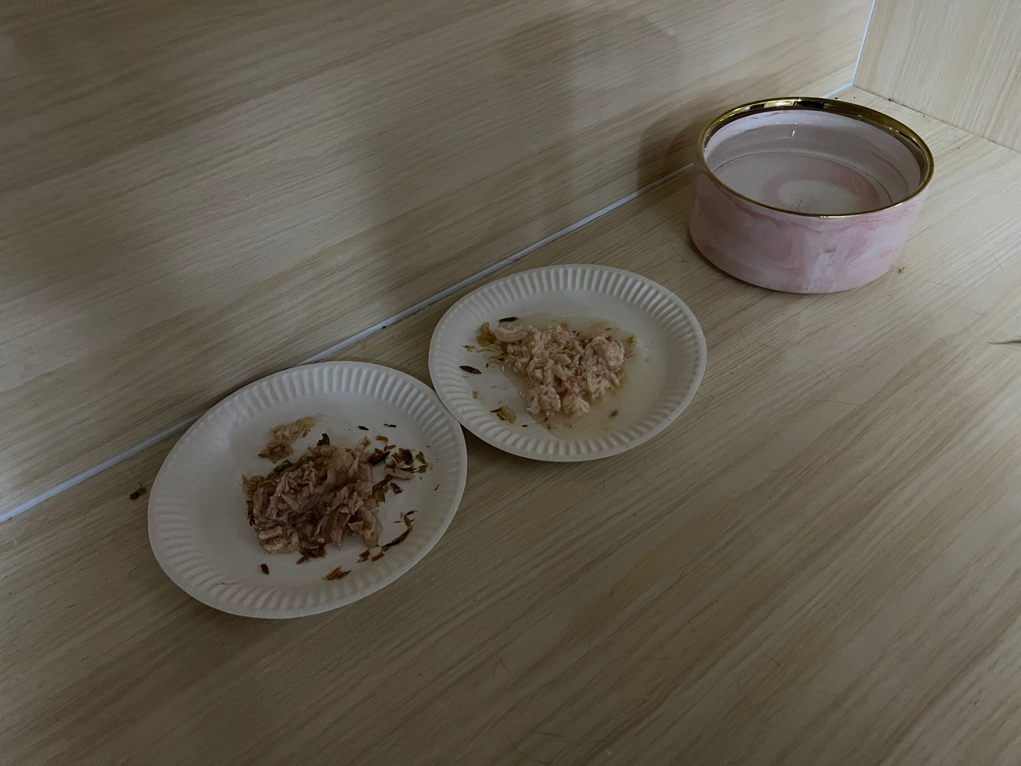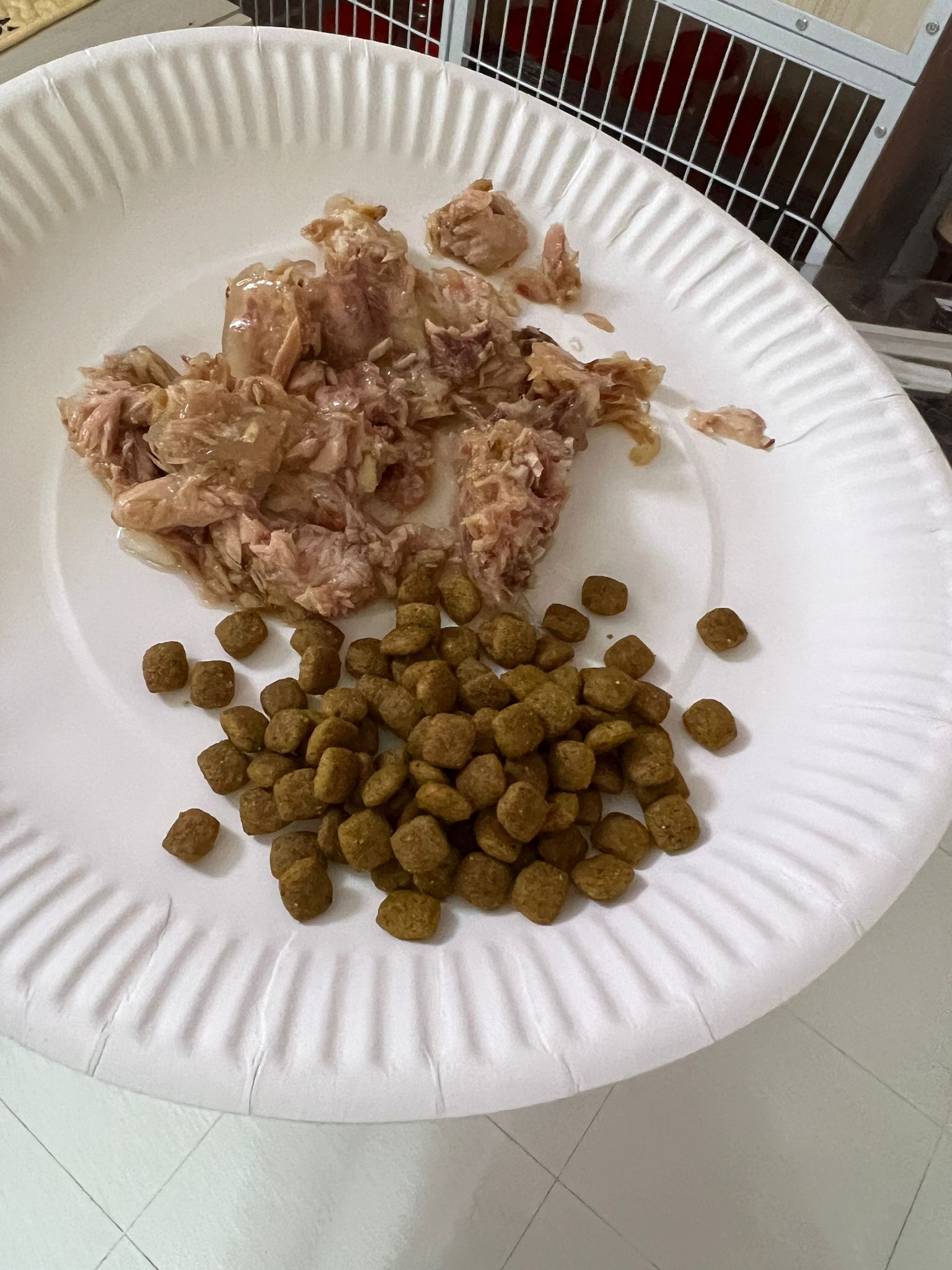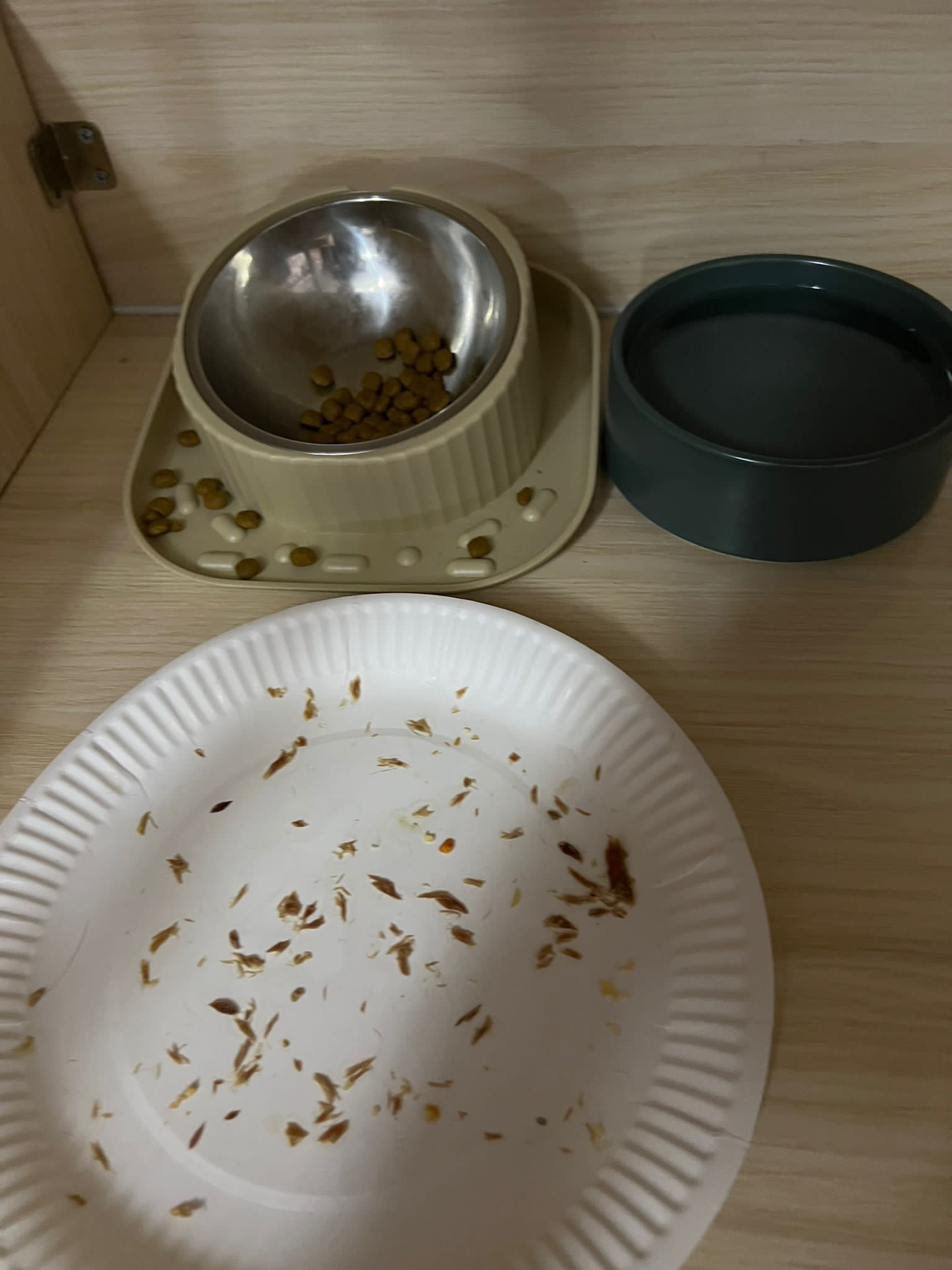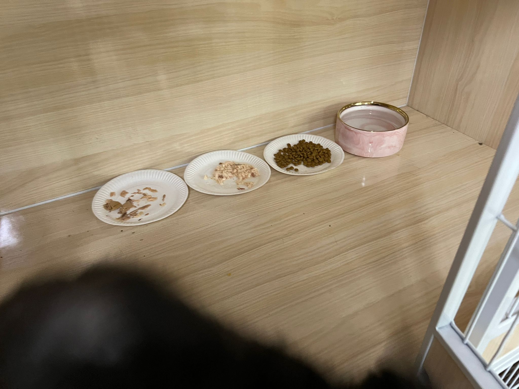 Night: food all cleared, serve wet food and extra plate of kibble. Got to bring back some bowls for her usage.