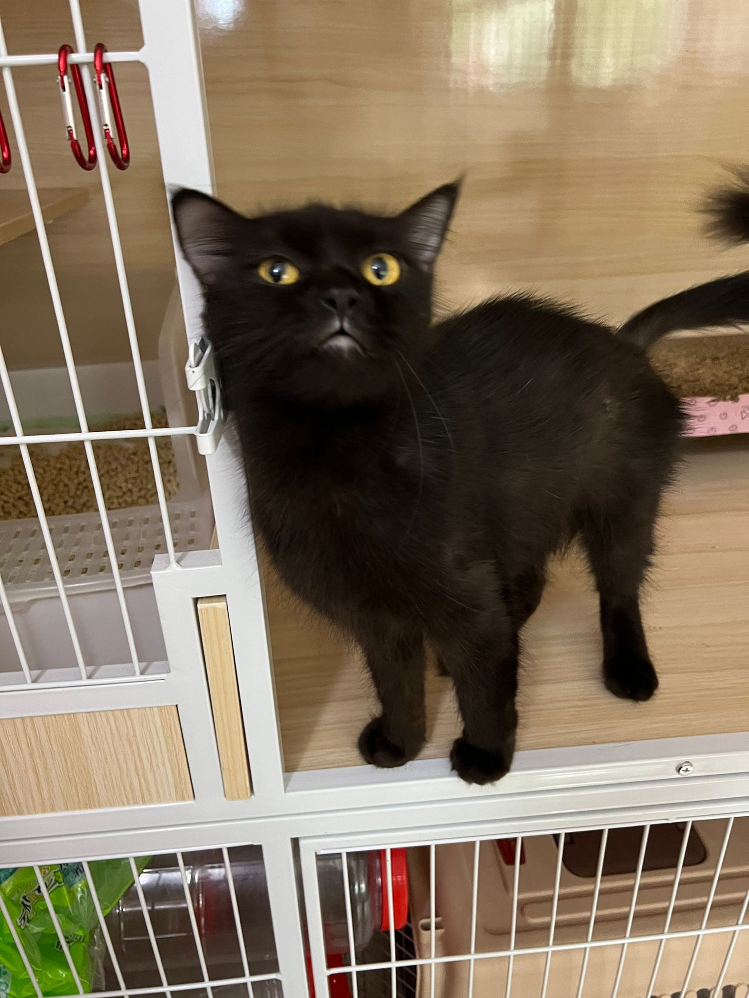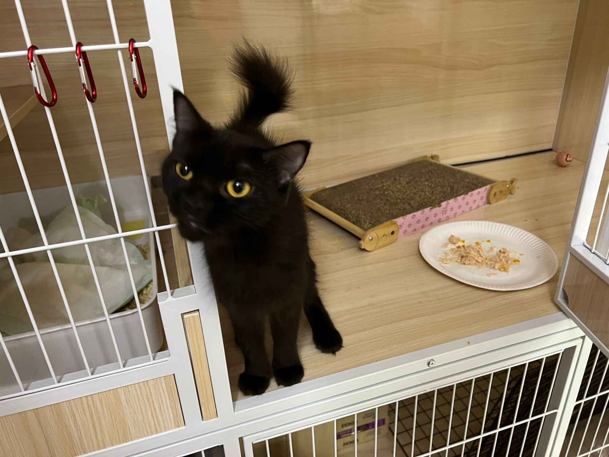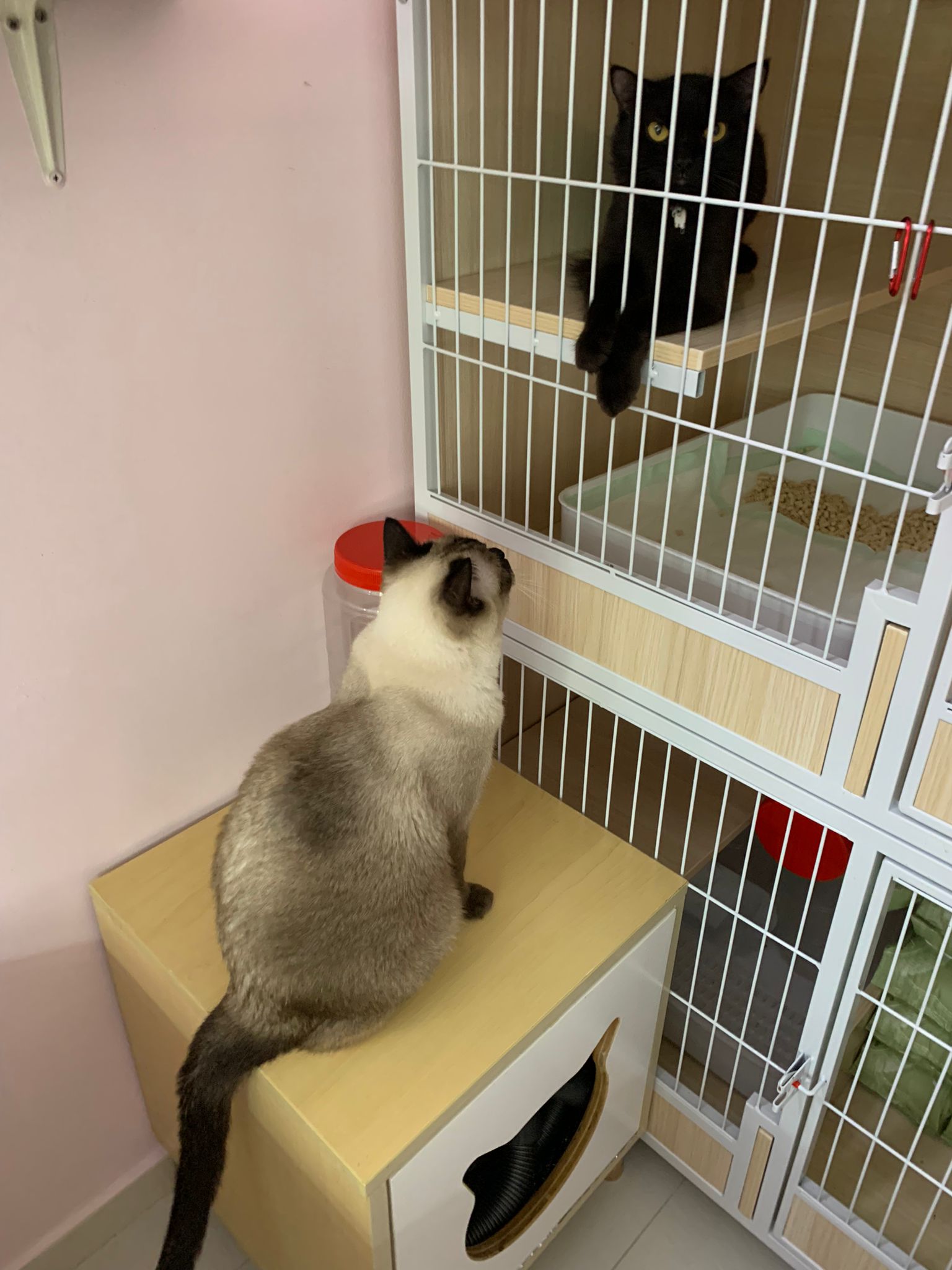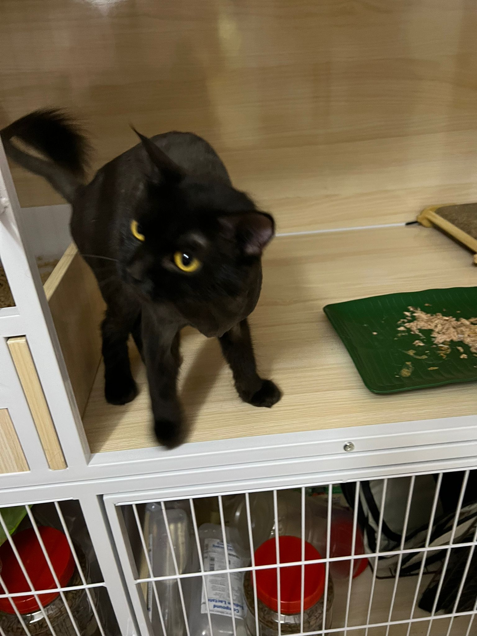 Evening: got poo 5/10. Not really leaving Comfort zone. She will jump down, hiss at didi and jump back to her safety zone. But so far those who jump into her cage she ok.