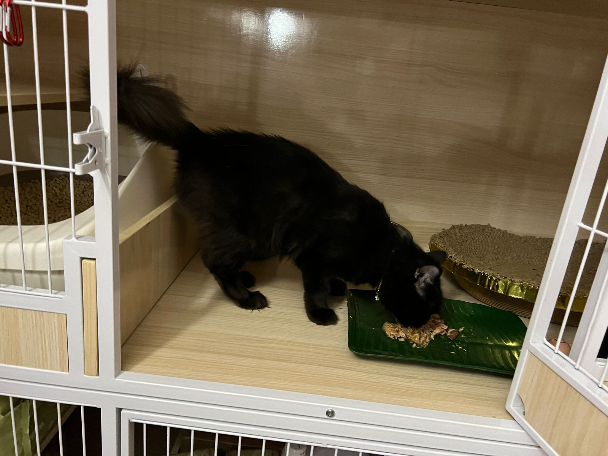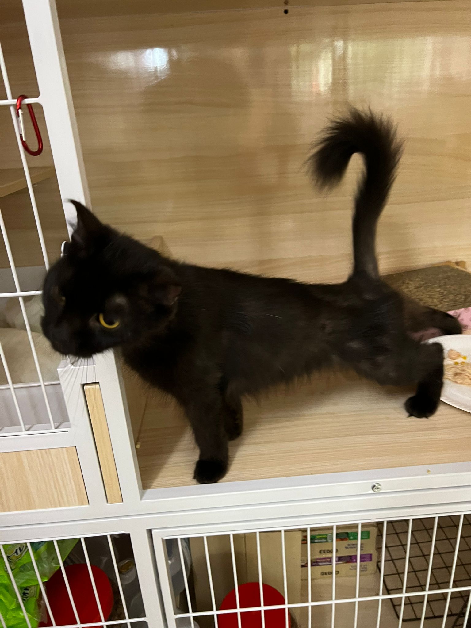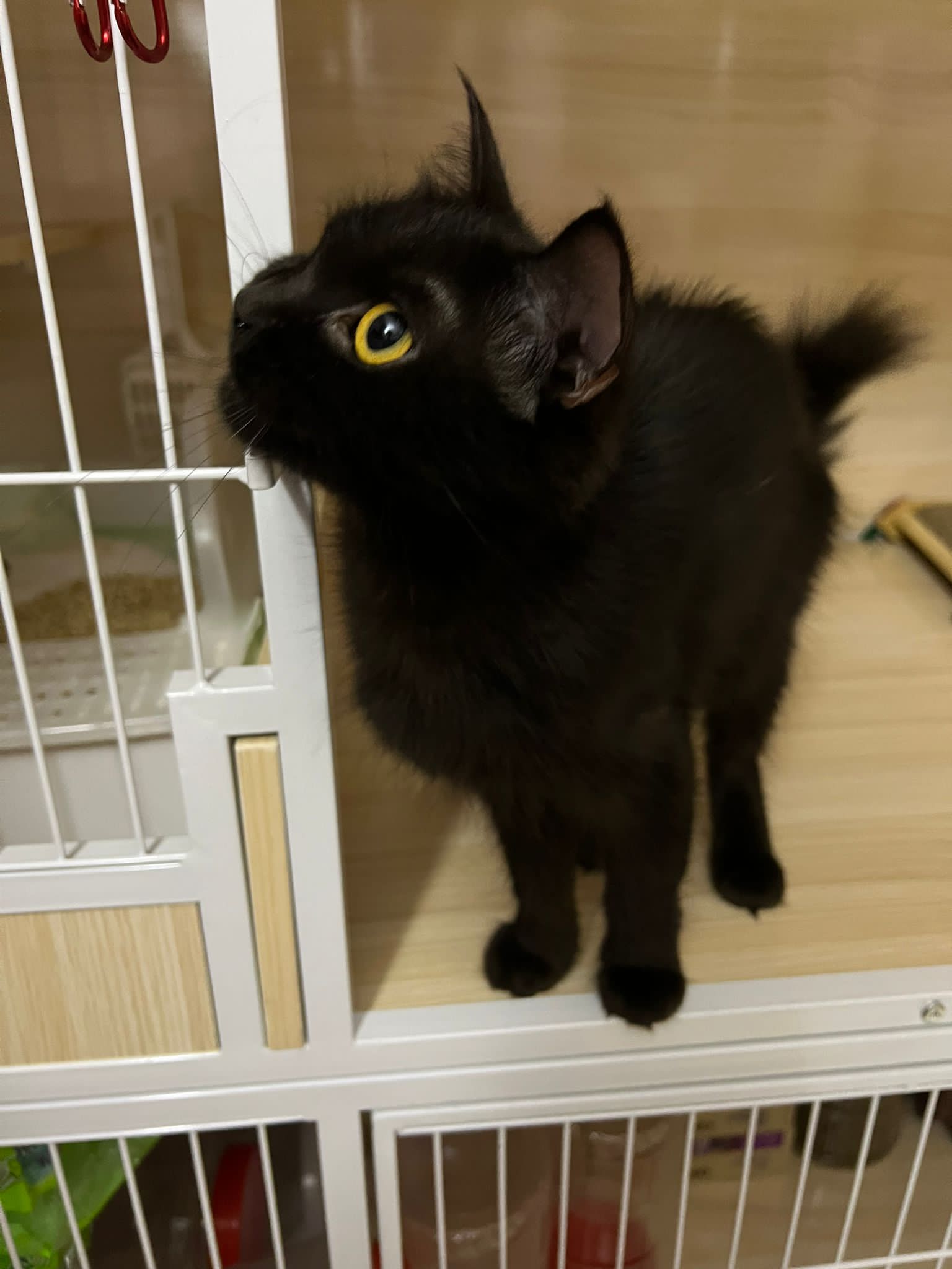 Evening: got poo 5/10. Not really leaving Comfort zone. She will jump down, hiss at didi and jump back to her safety zone. But so far those who jump into her cage she ok.