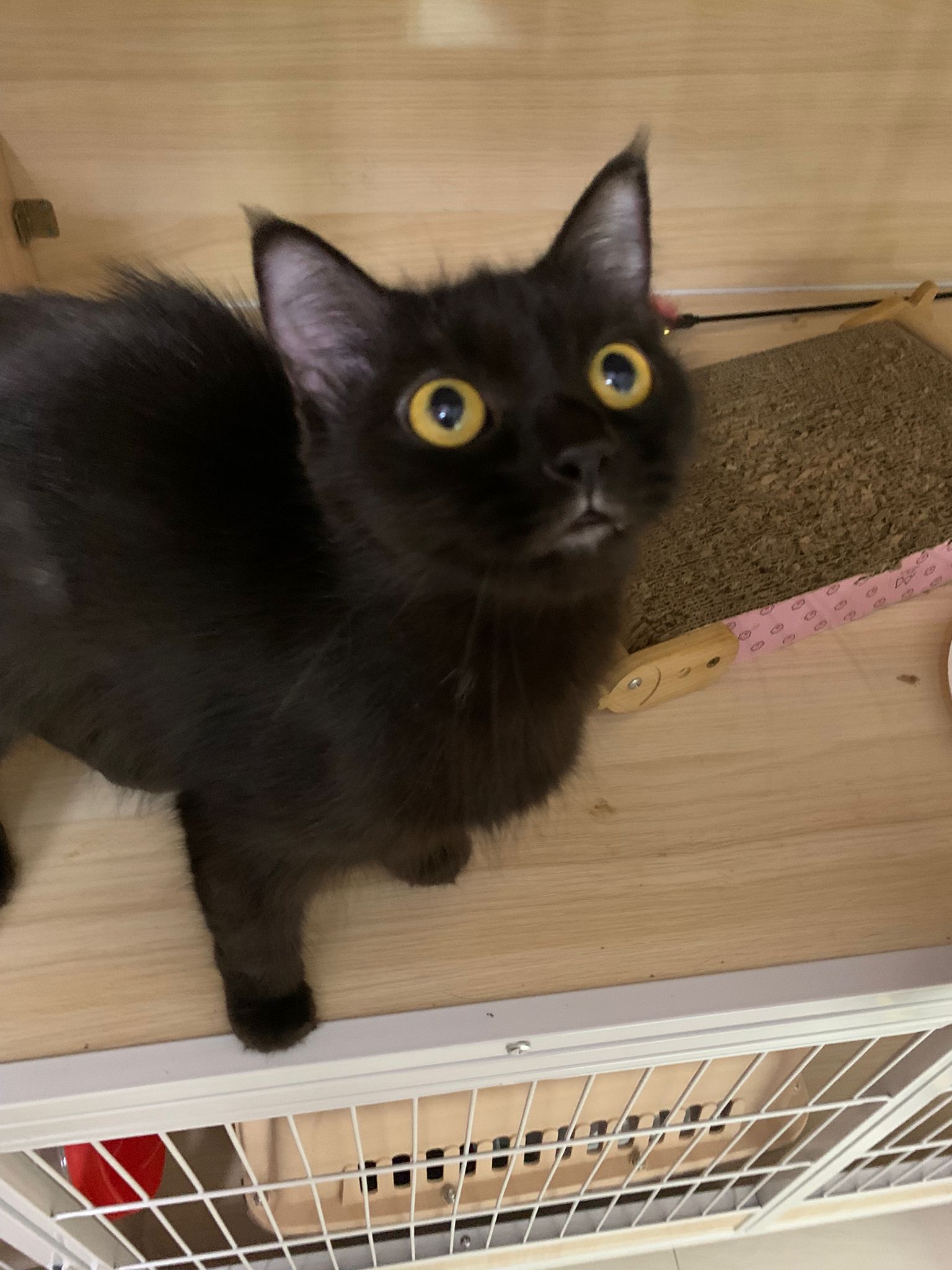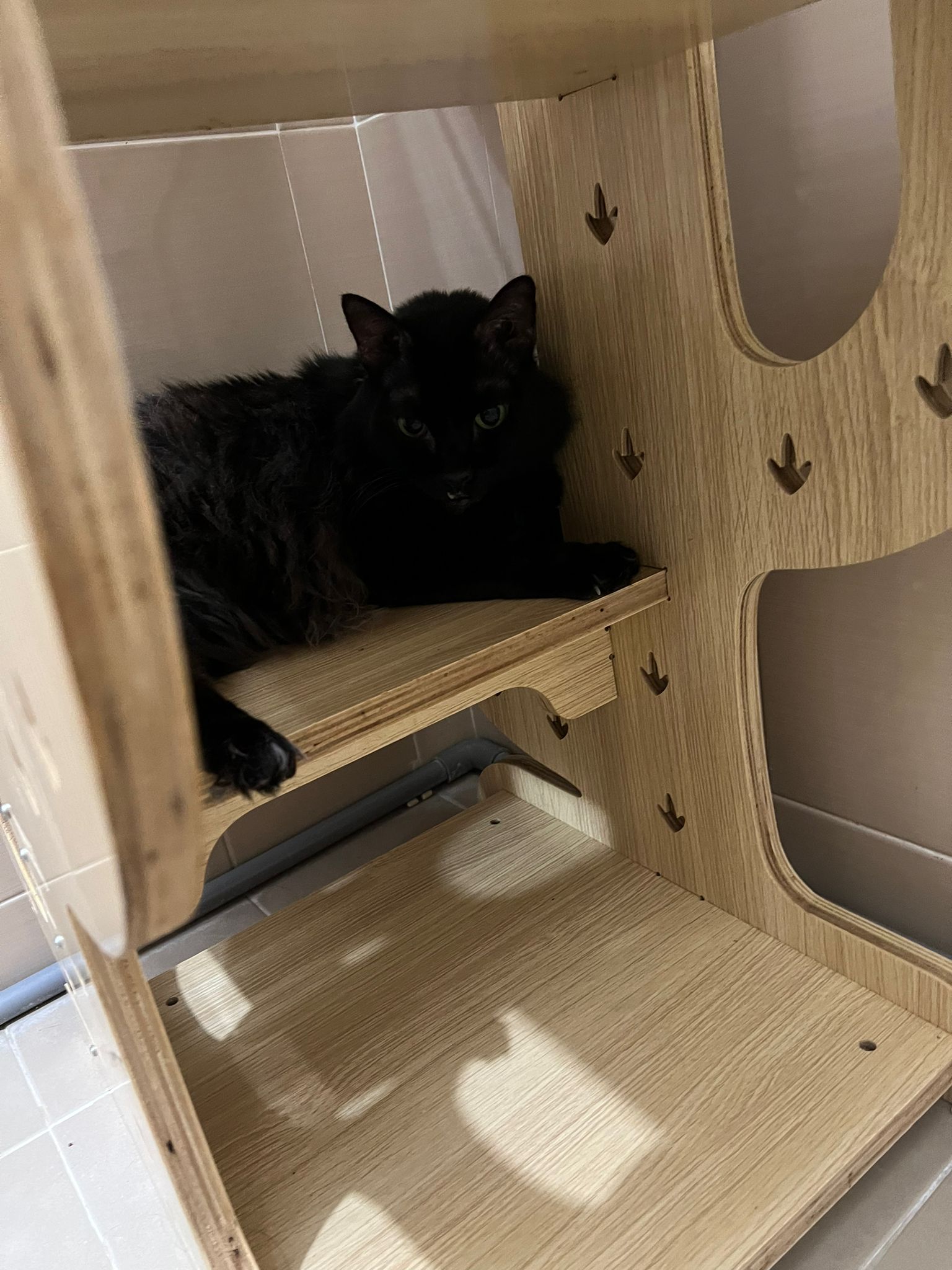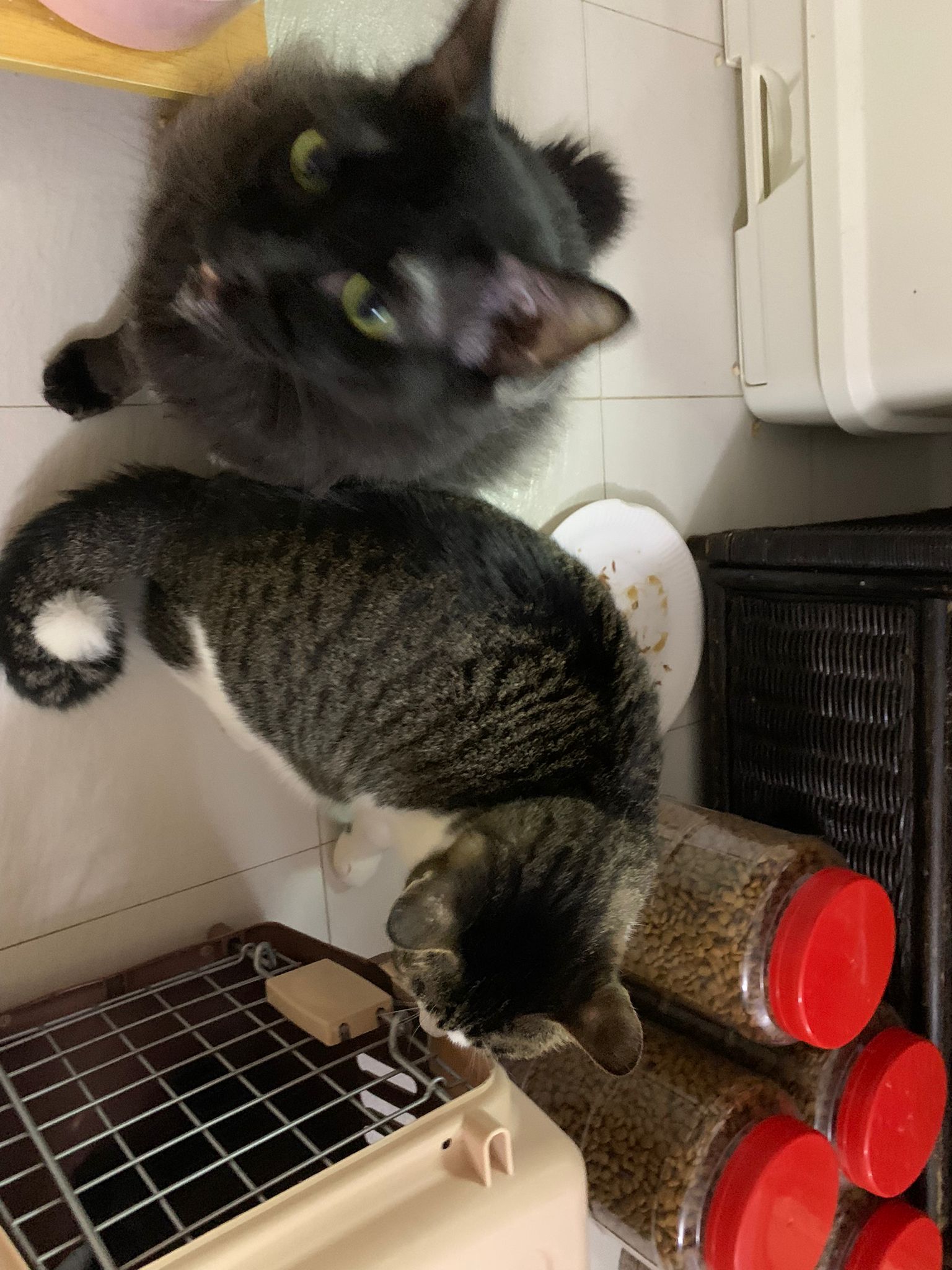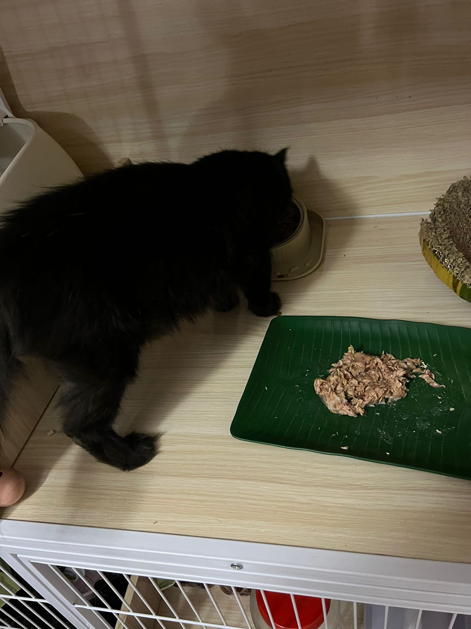 Evening: got poo 5/10. Not really leaving Comfort zone. She will jump down, hiss at didi and jump back to her safety zone. But so far those who jump into her cage she ok.