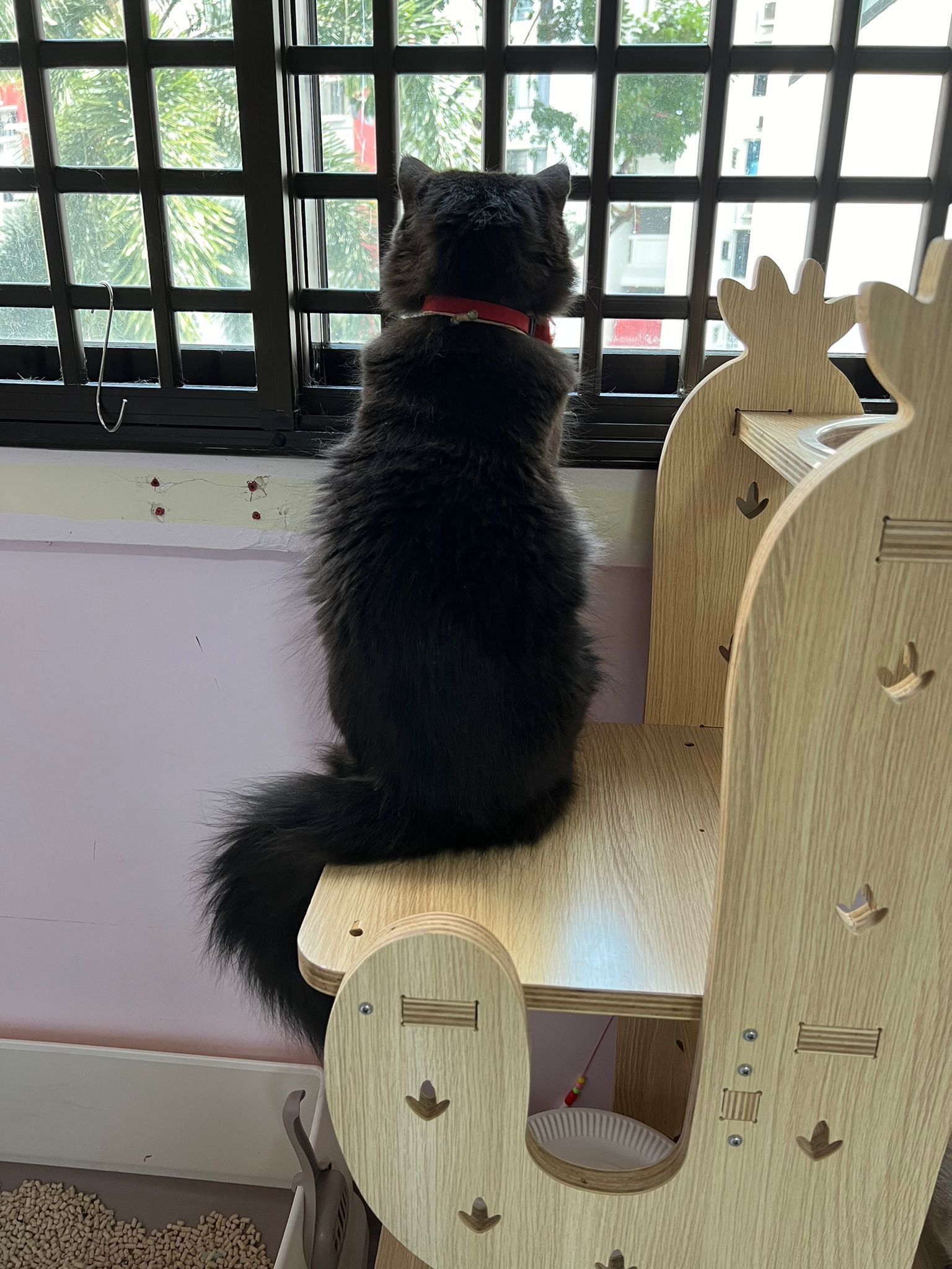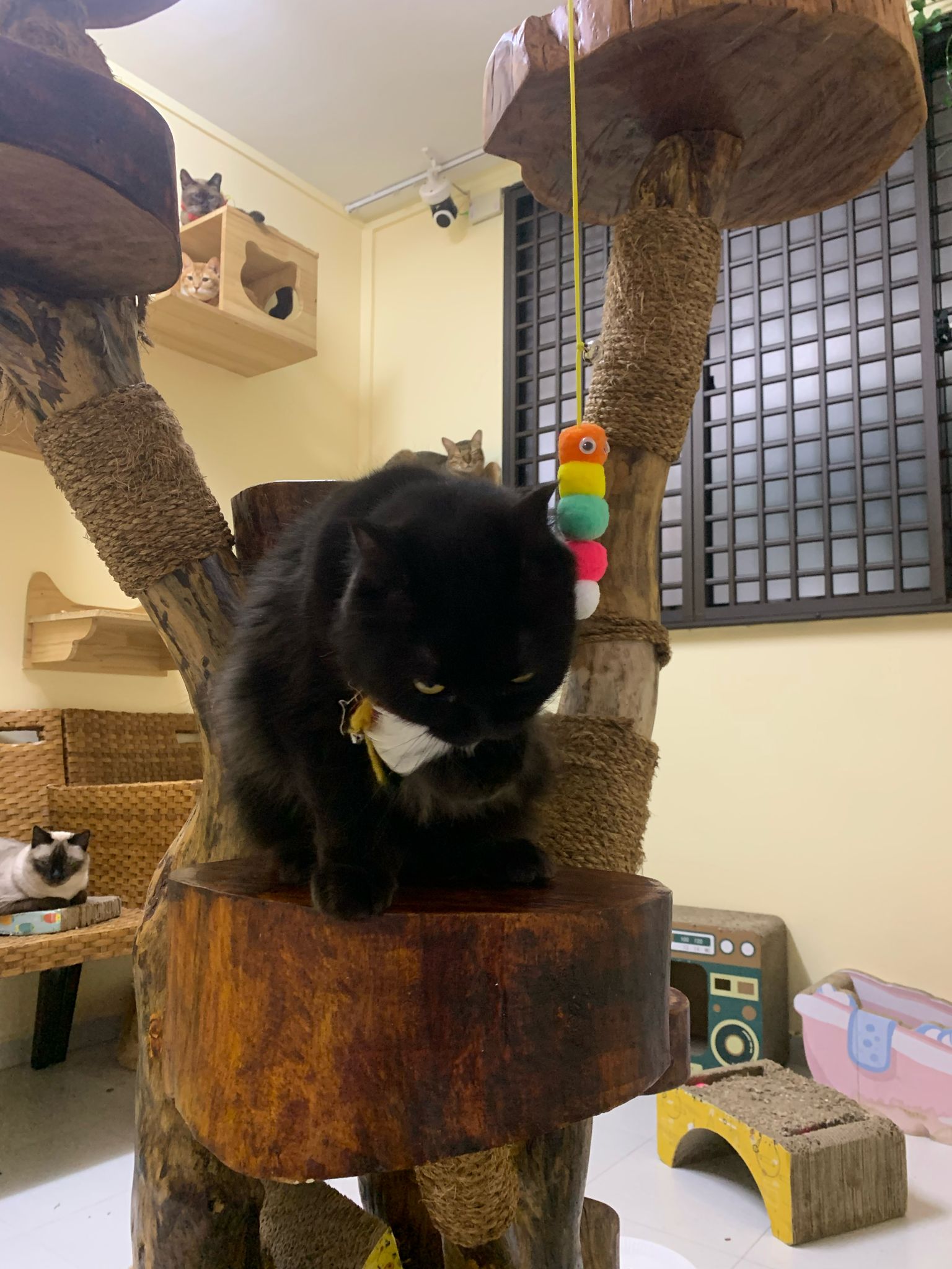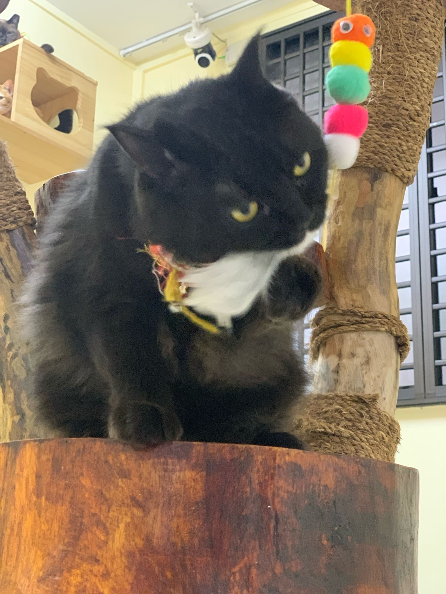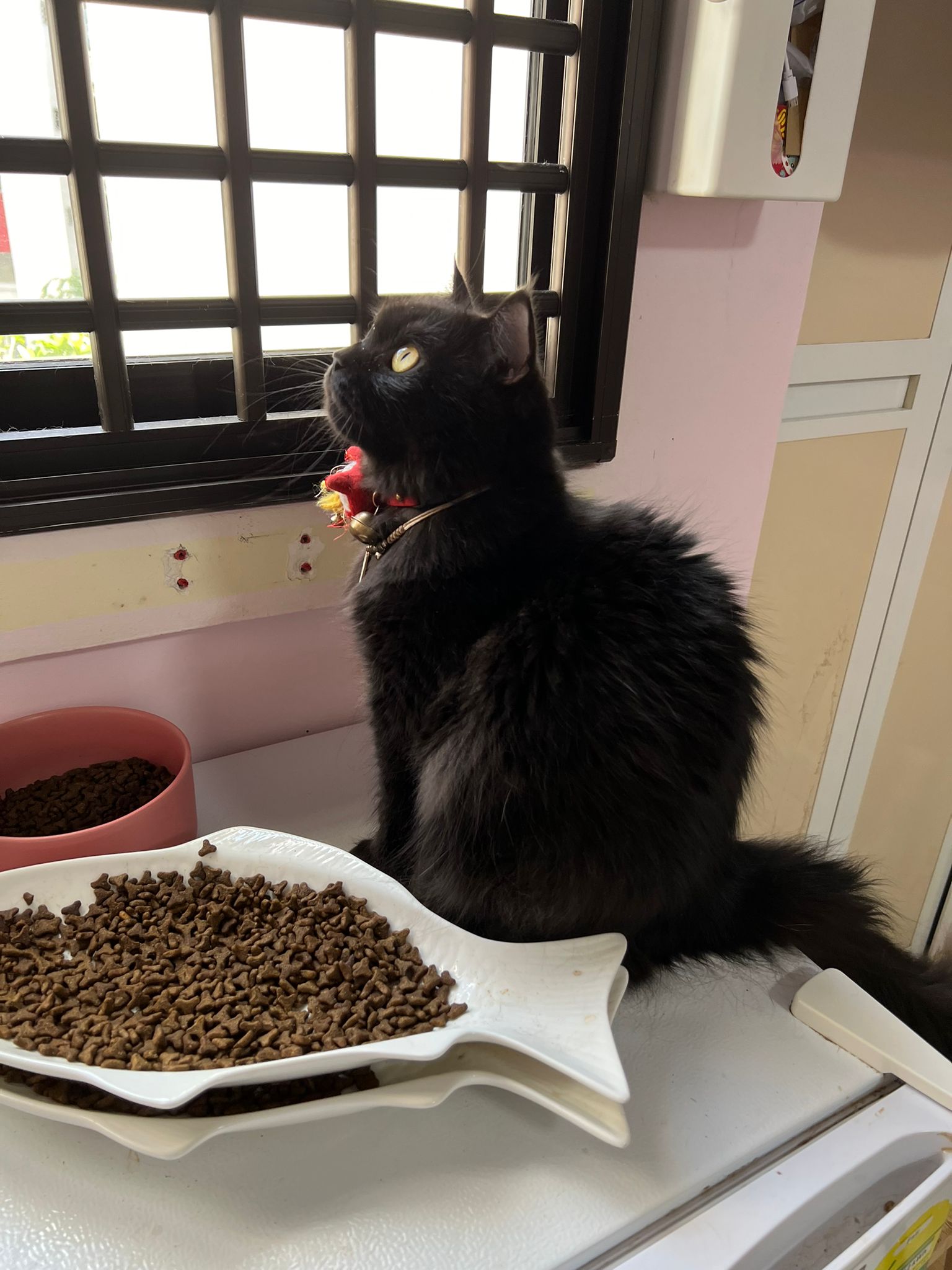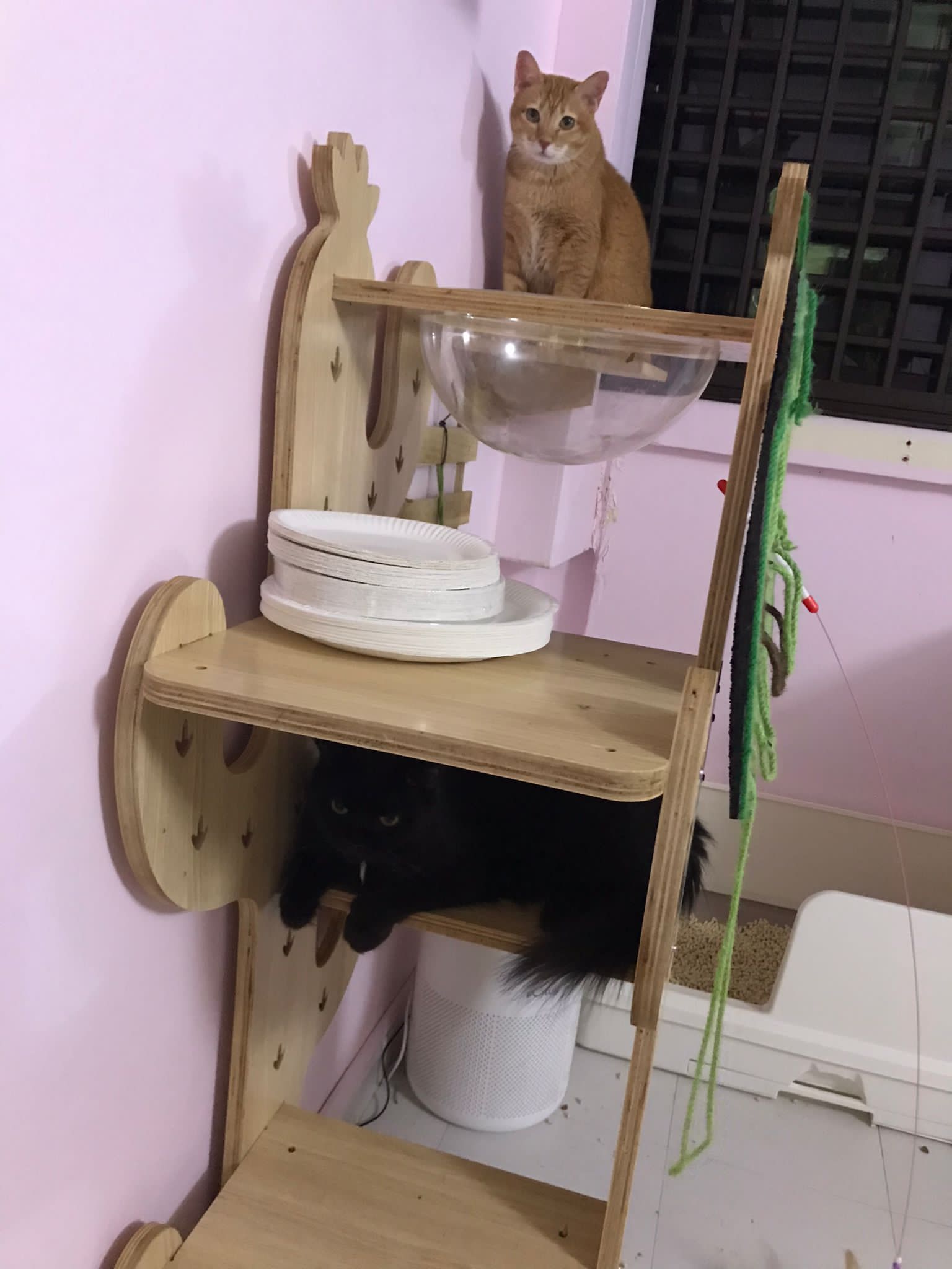 Erm her house, should be ok. I thought the automatic litterbin is scarier than the risk of windows. noted the “a1 screen” window mesh if any adopter need next time. Met Riri, let him mentally prepared that he gonna have a sister. he like catnip toy also.