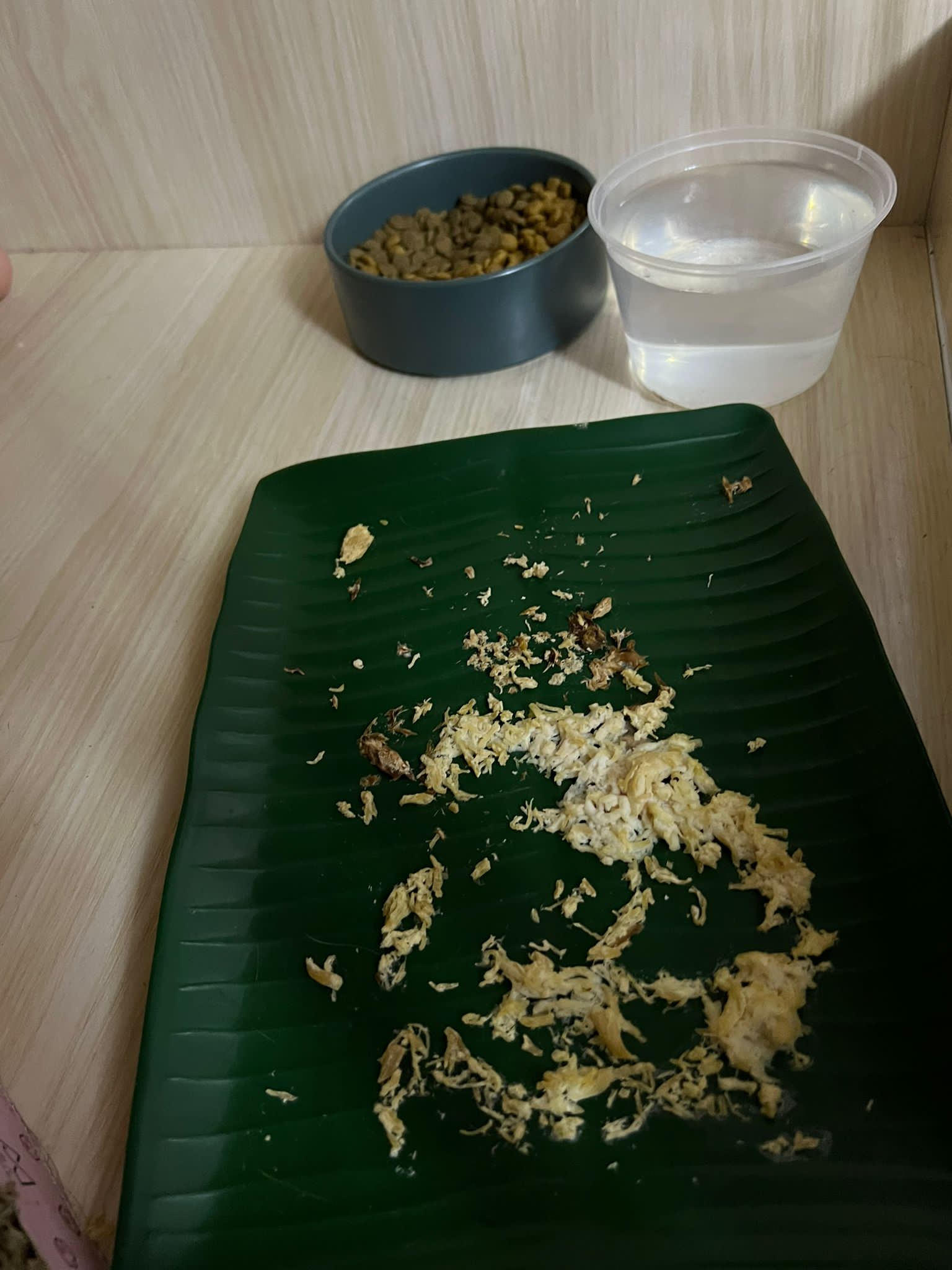 Morning: 2.96kg – gain 310g in 4 days. Given nutriplus gel and b12 jab. Wipe her body down. No poo. Serve da jiejie mooncake, kibble w potato and carrot, thought maybe Carrara might eat, no one eat at all.