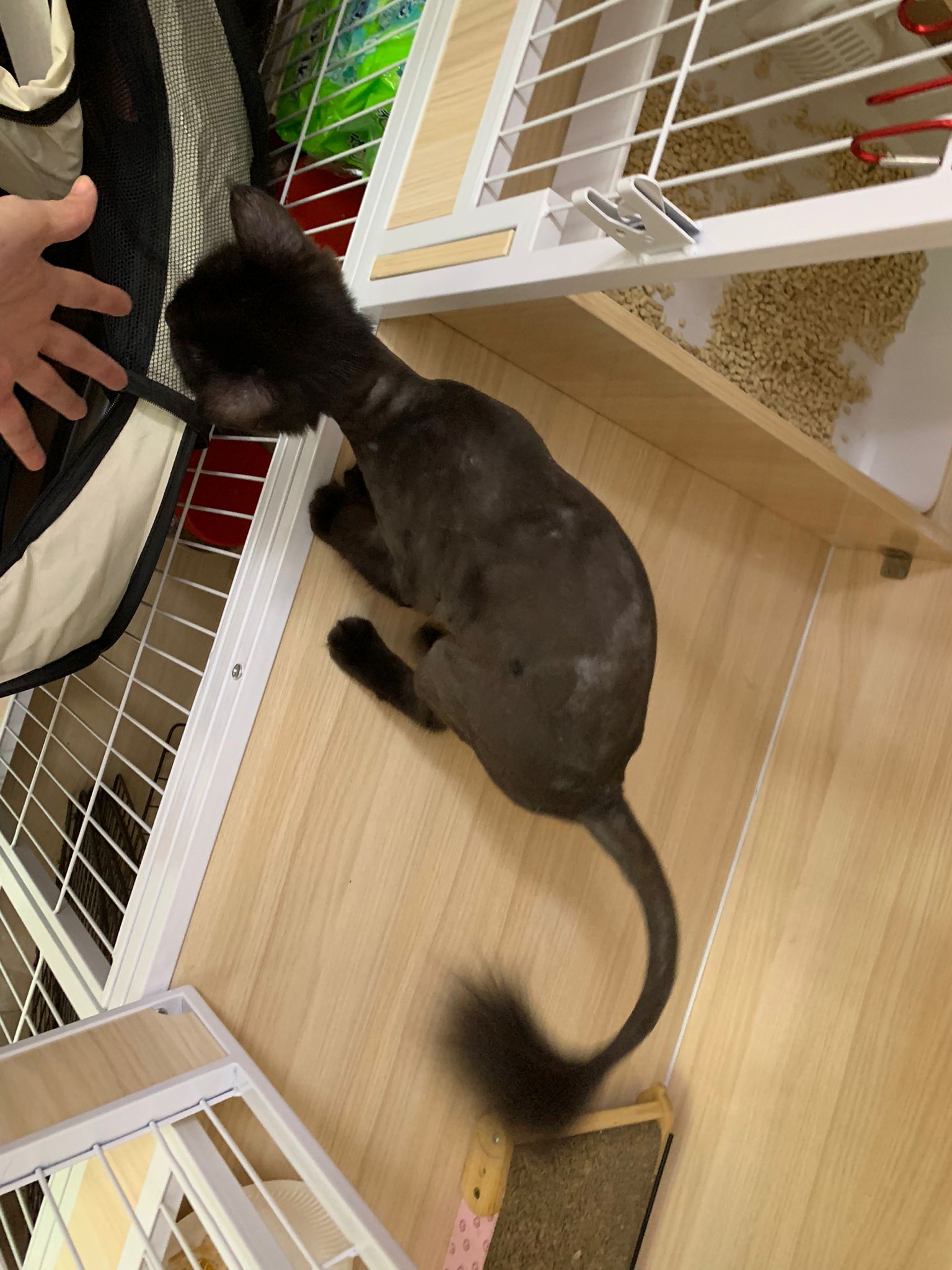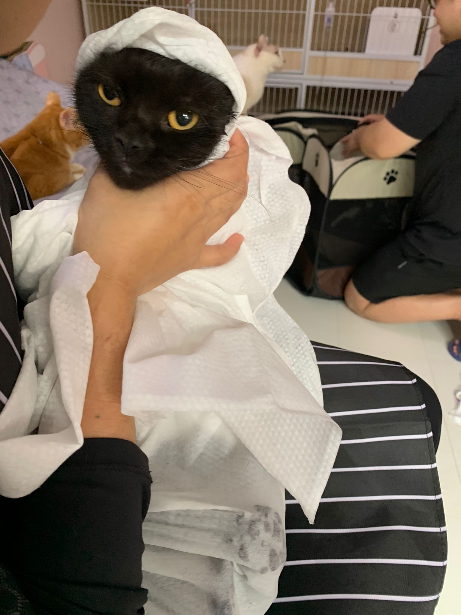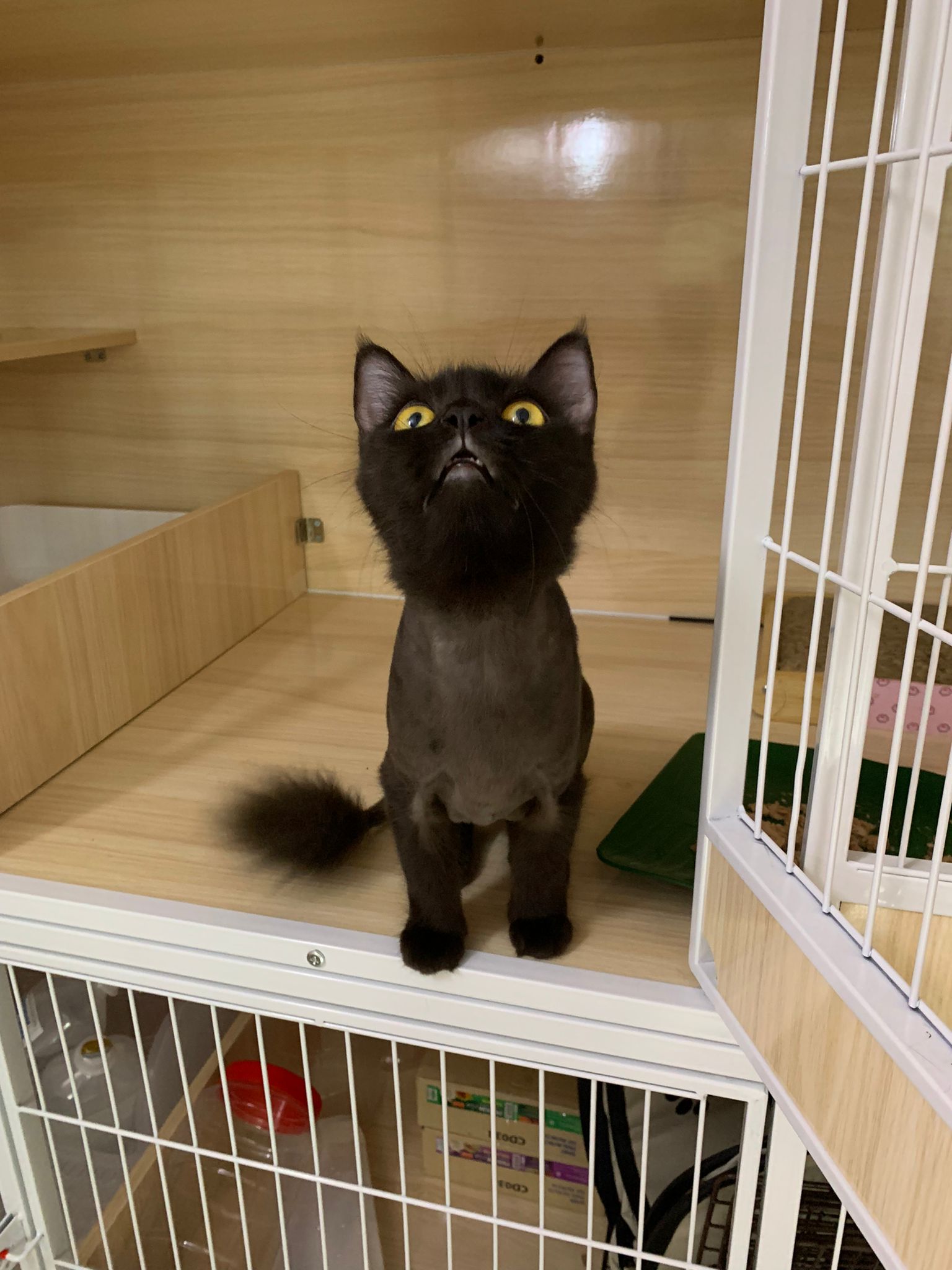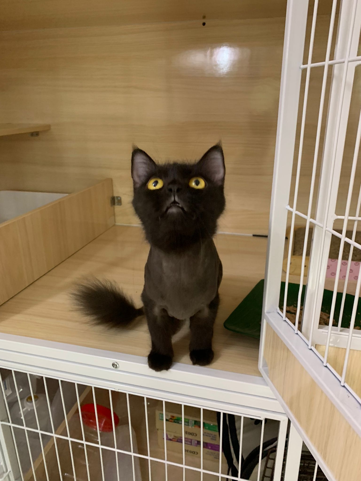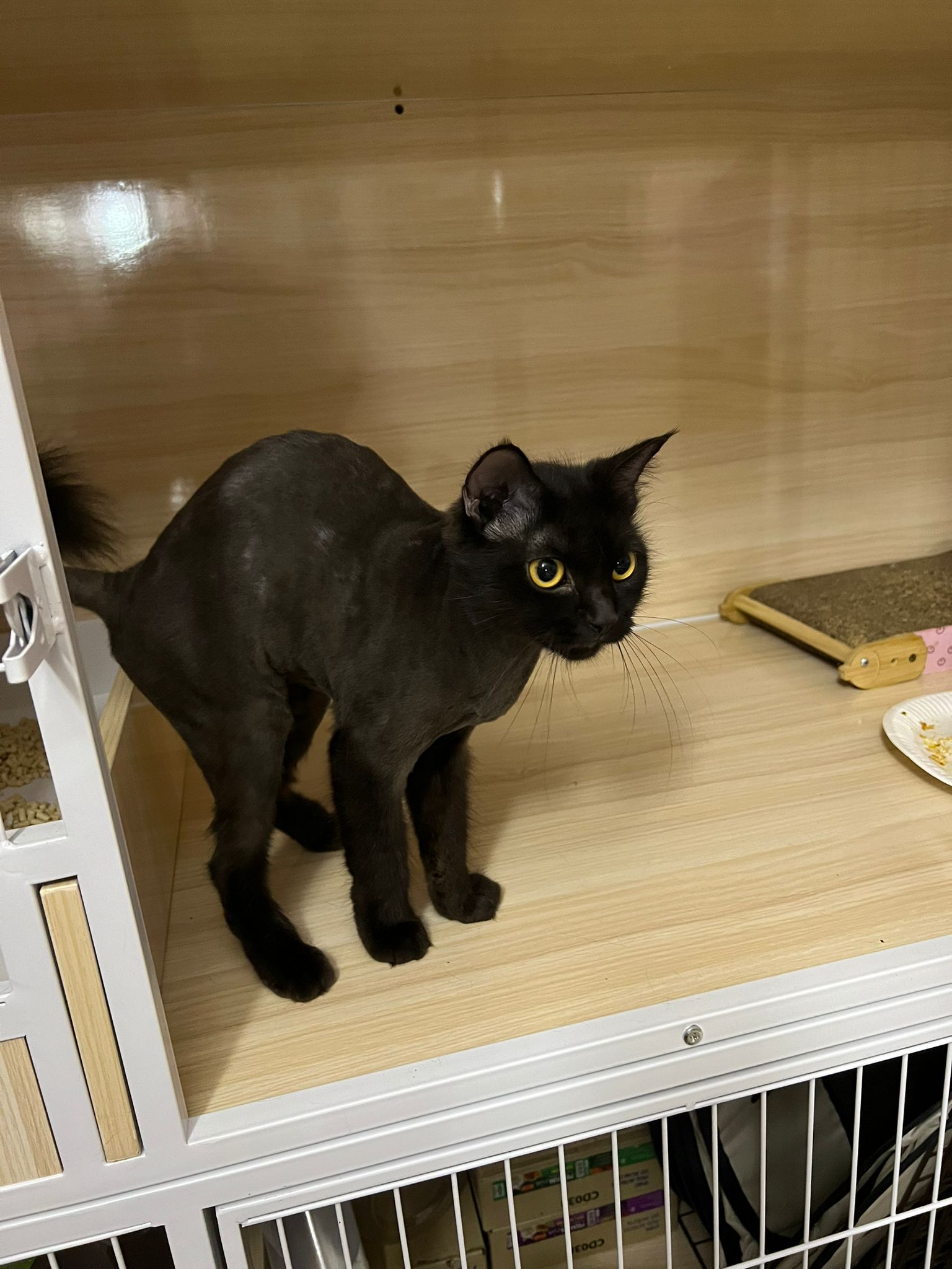 Still quite ok in shaving but did struggle la. Cut short. Tao came near and she hiss at tao. But she didn’t angry or fierce to human. got some scars on body. Scratch groomer when didi come near. Pee all over the groomer. clean up her cage and told her Tmr free roam alr. Drying still quite ok. Stay in cage, monitor see the rest. Groom herself. Given a b12 jab.