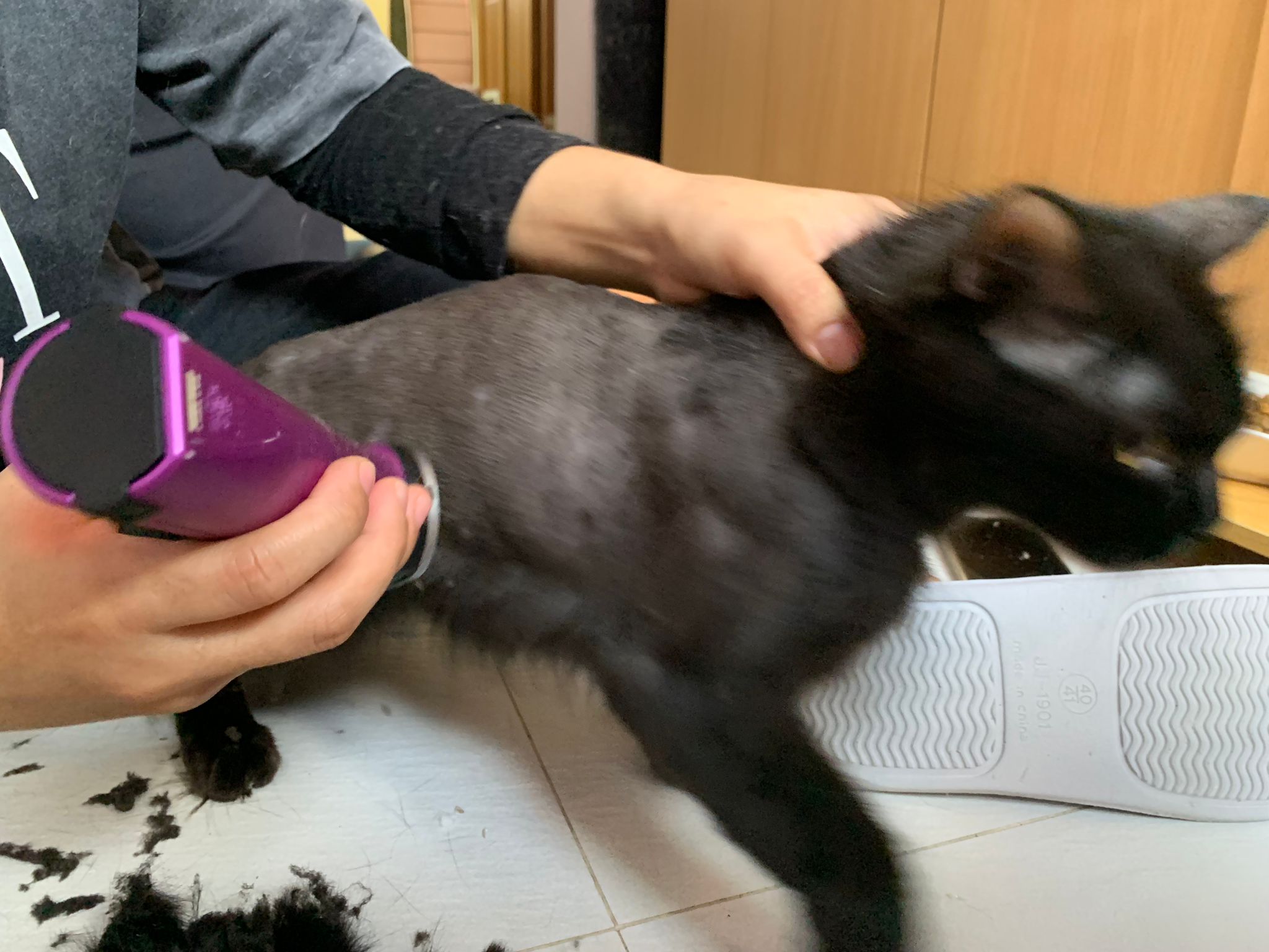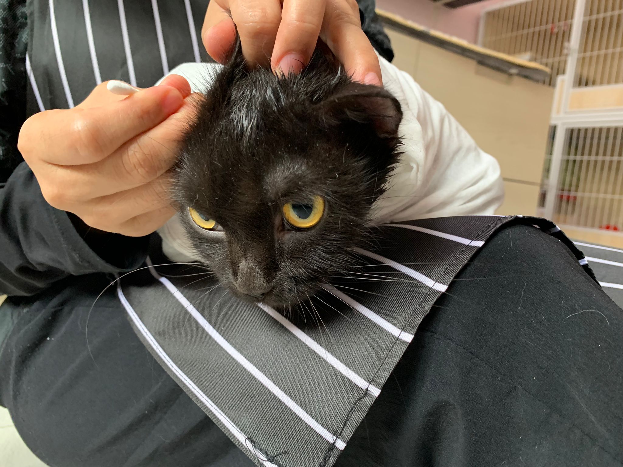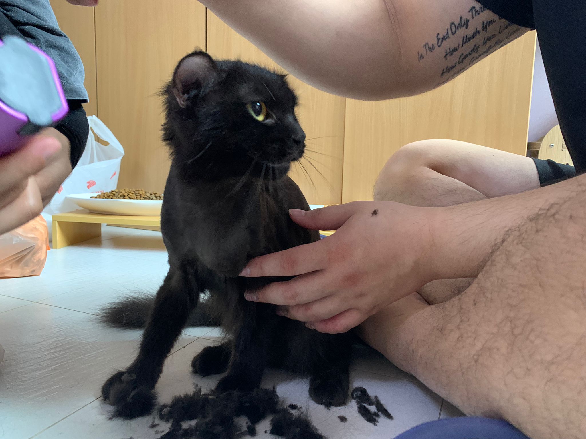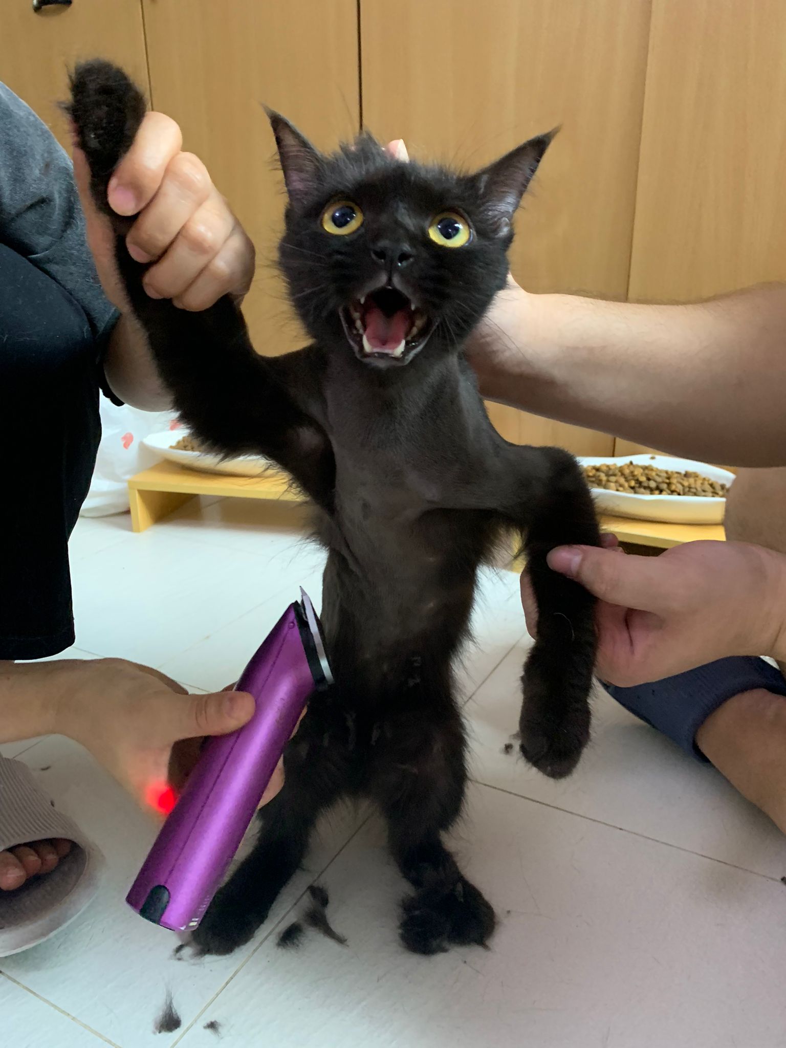 Still quite ok in shaving but did struggle la. Cut short. Tao came near and she hiss at tao. But she didn’t angry or fierce to human. got some scars on body. Scratch groomer when didi come near. Pee all over the groomer. clean up her cage and told her Tmr free roam alr. Drying still quite ok. Stay in cage, monitor see the rest. Groom herself. Given a b12 jab.